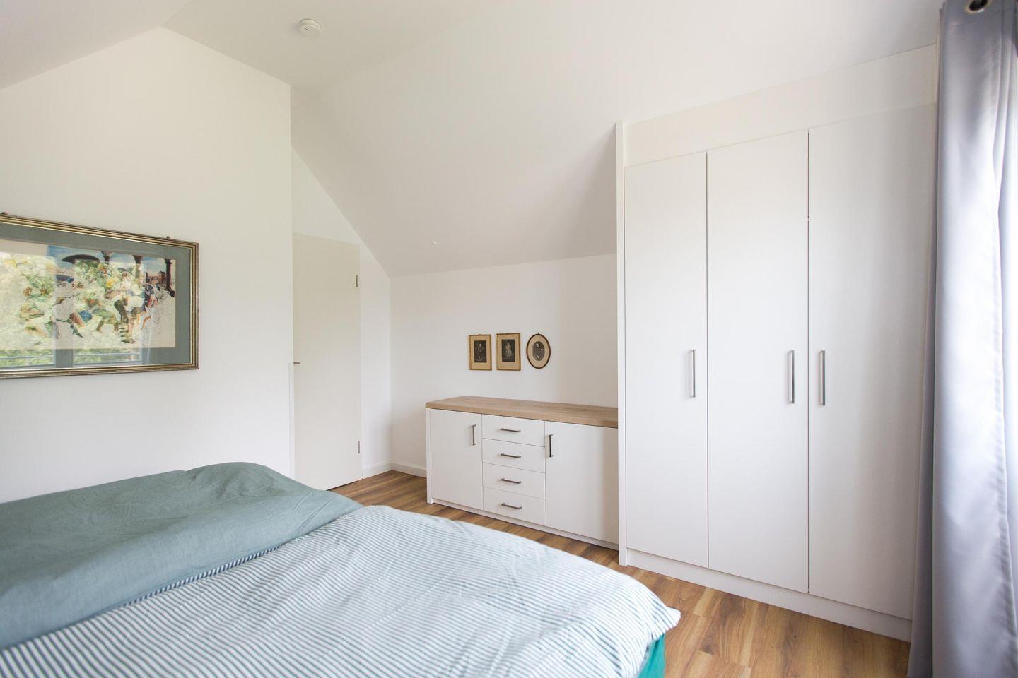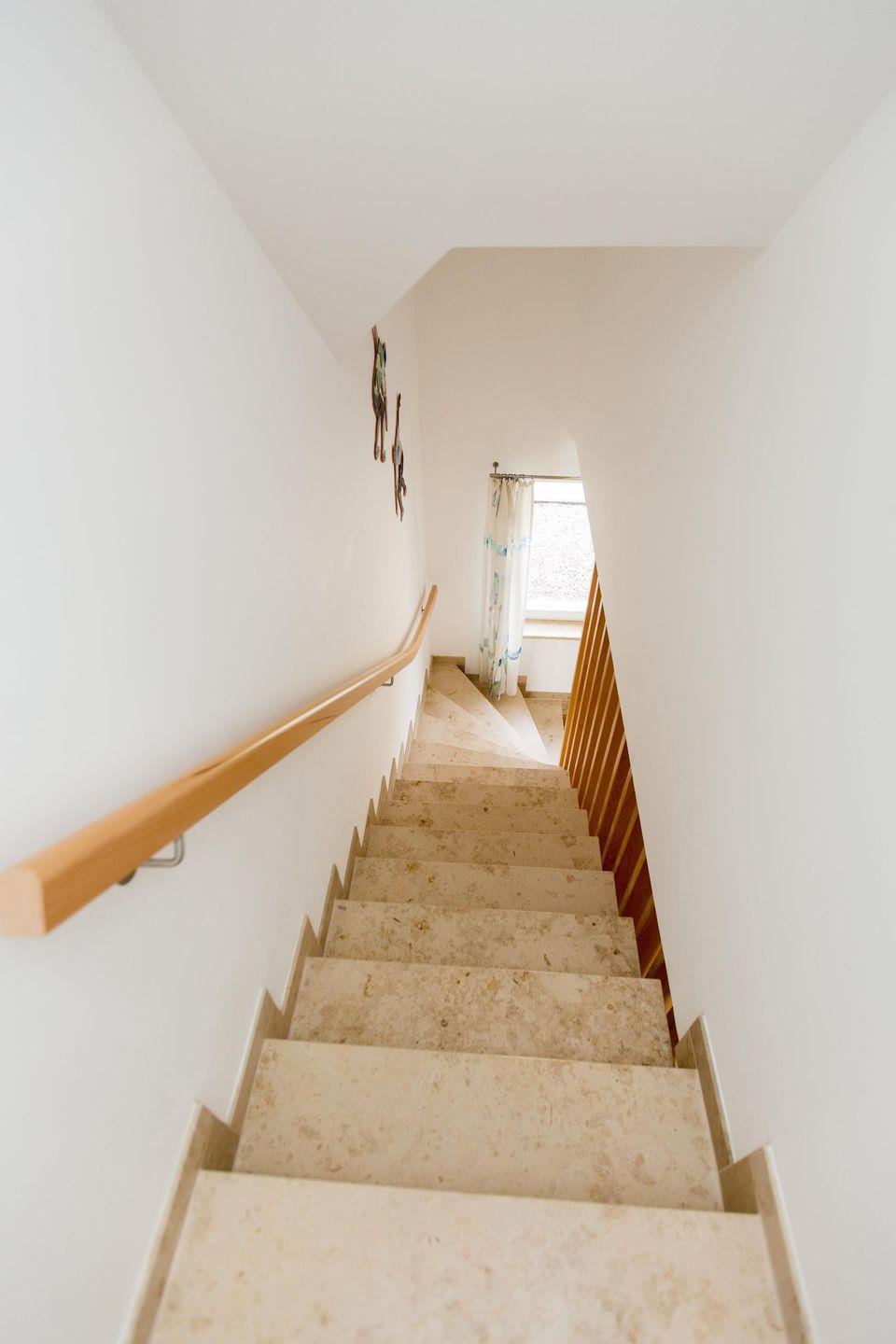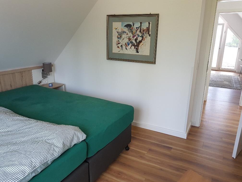 Im Obergeschoss befindet sich als Dreh-und Angelpunkt der Wohn- Essbereich mit Küchenzeile, Kaminofen (ab 09/2018) und Zugang zum 12 m² großen Balkon.Hier auch ein geräumiges Bad mit bodengleicher Dusche, Waschmaschine und Föhn und das Schlafzimmer mit Boxspringbett (1,80 m x 2,00 m) und Fernseher.