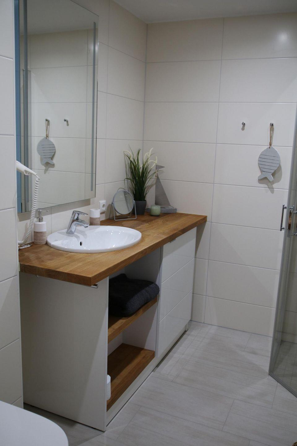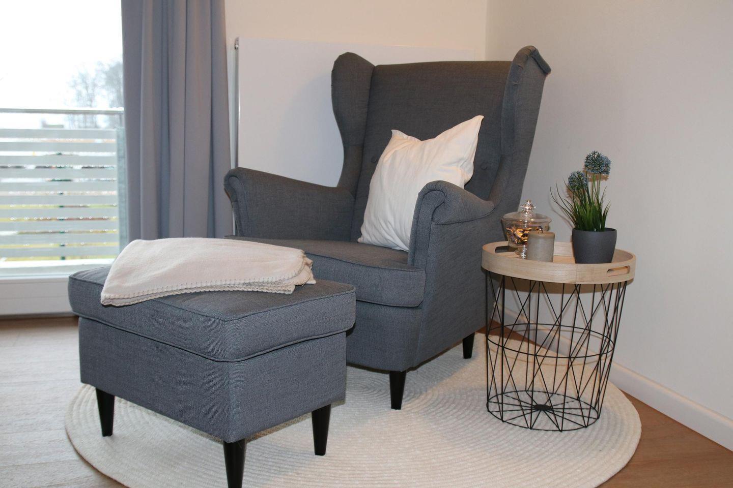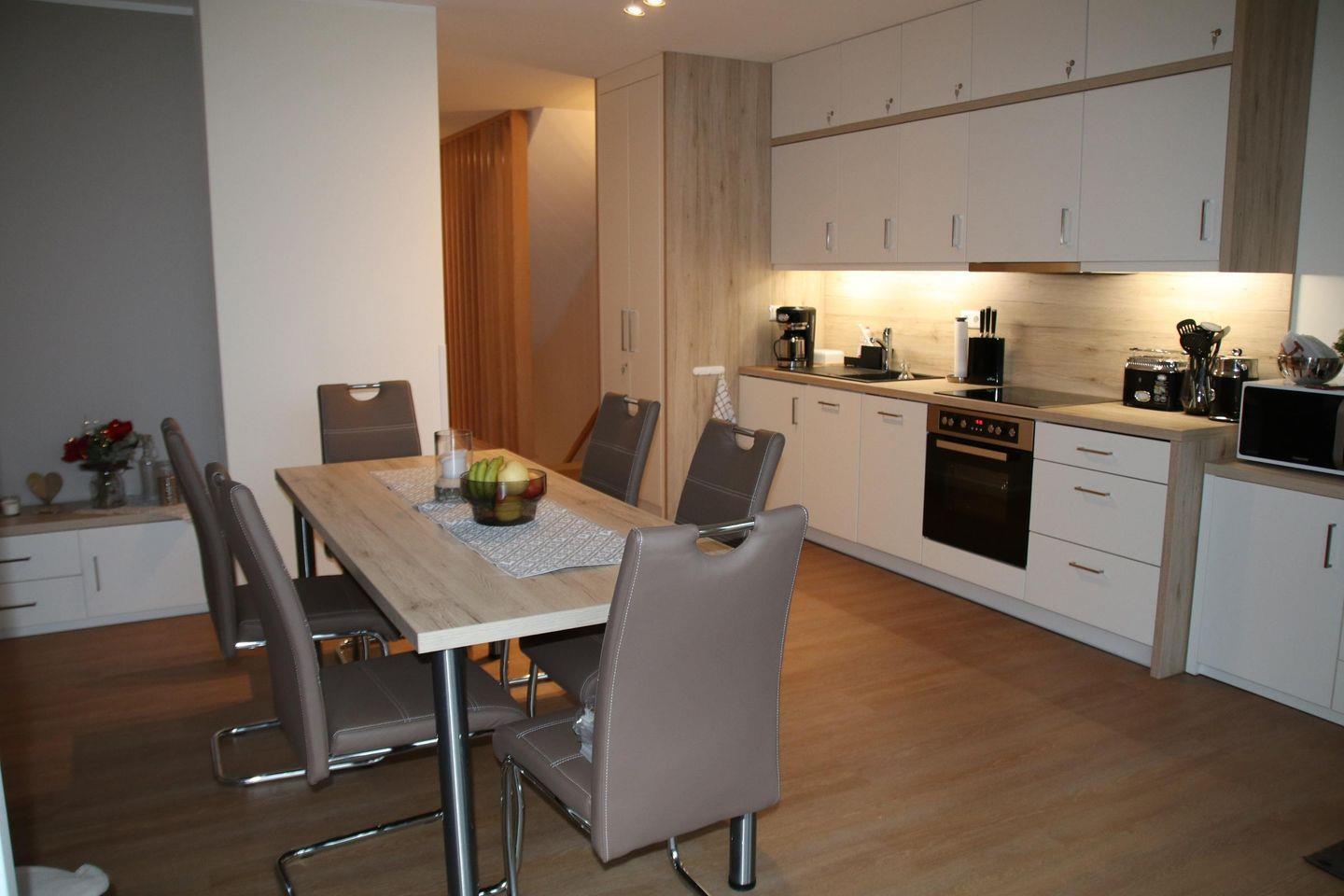Die Wohnfläche von 98 m² erstreckt sich über zwei Stockwerke. In der ersten Etage befinden sich ein Badezimmer mit bodengleicher Dusche, ein Schlafzimmer mit einem Boxspringbett (1,80 m x 2,00 m), ein großer Ess-Wohnbereich mit integrierter Küchenzeile. Der angrenzende Balkon, ausgestattet mit geschmackvollen Gartenmöbeln, ist nach Süden ausgerichtet.