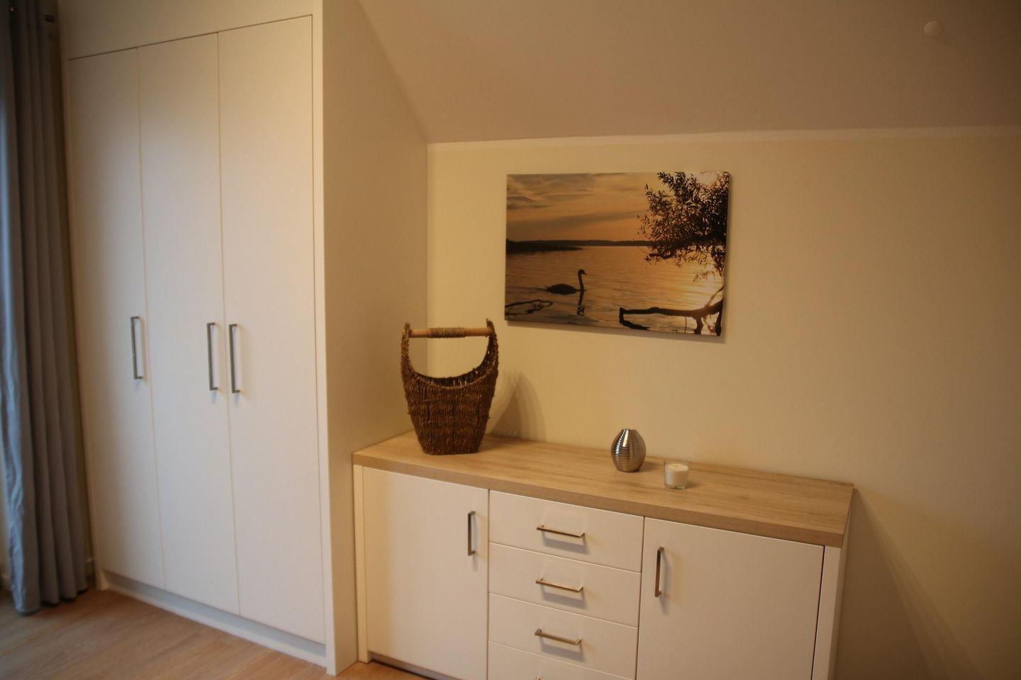 Im Dachgeschoss liegen ein Tageslichtbad mit Badewanne, ein weiteres Schlafzimmer mit einem Boxspringbett (1,80 m x 2,00 m) sowie ein gemütliches Wohnzimmer mit Balkon und Blick auf den See. Der kleine Balkon, ausgestattet mit zwei Relax-Sesseln, ist ebenfalls nach Süden ausgerichtet und läd auf ein ungestörtes Sonnenbad ein.