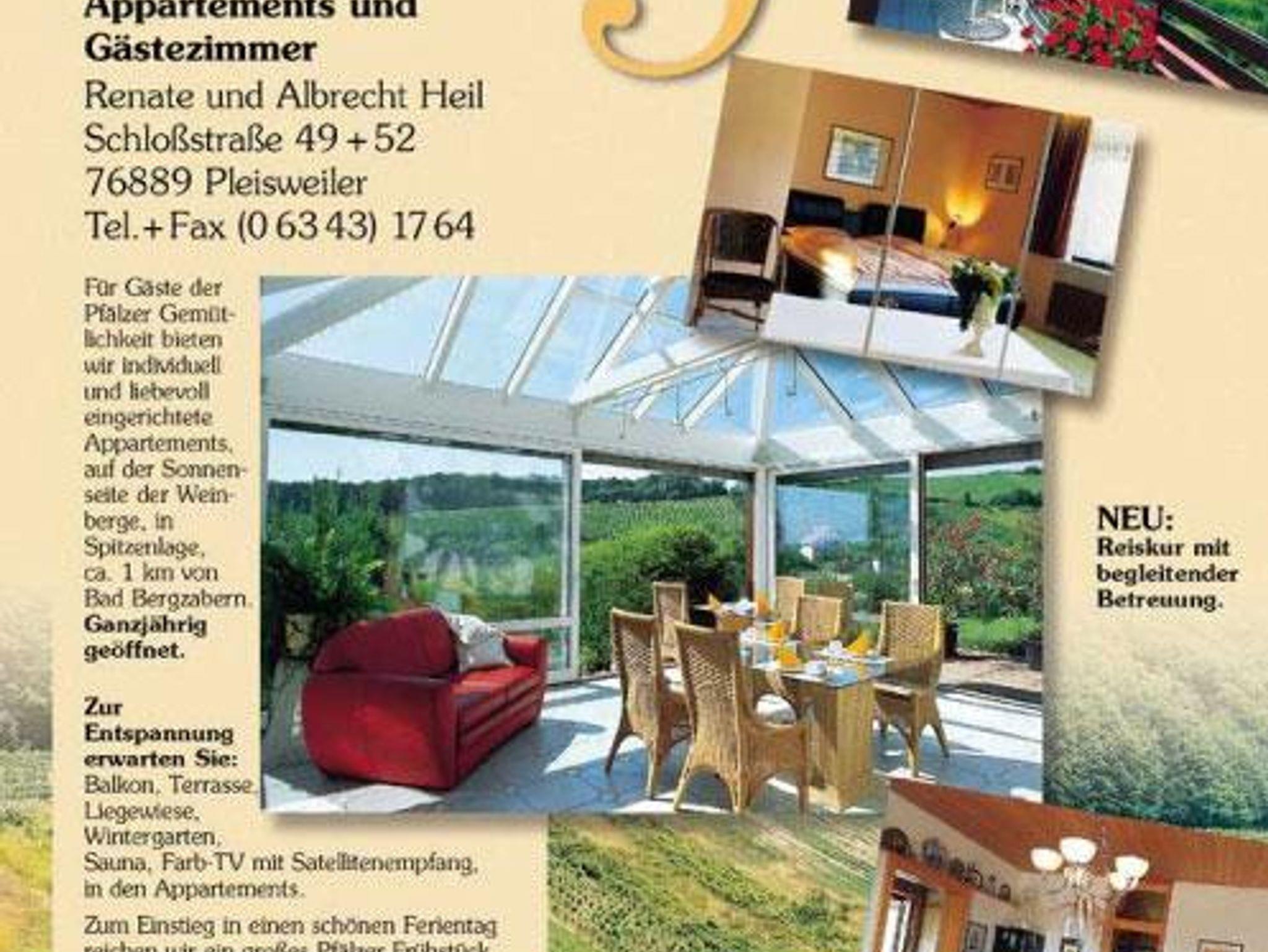 Entspannung pur im Gästehaus Renate und Albrecht Heil Erleben Sie erholsame Tage im Gästehaus Renate und Albrecht Heil in Pleisweiler-Oberhofen. Für unsere Gäste bieten wir individuell und liebevoll eingerichtete Appartements mit TV und eigenem Parkplatz in bester Lage.