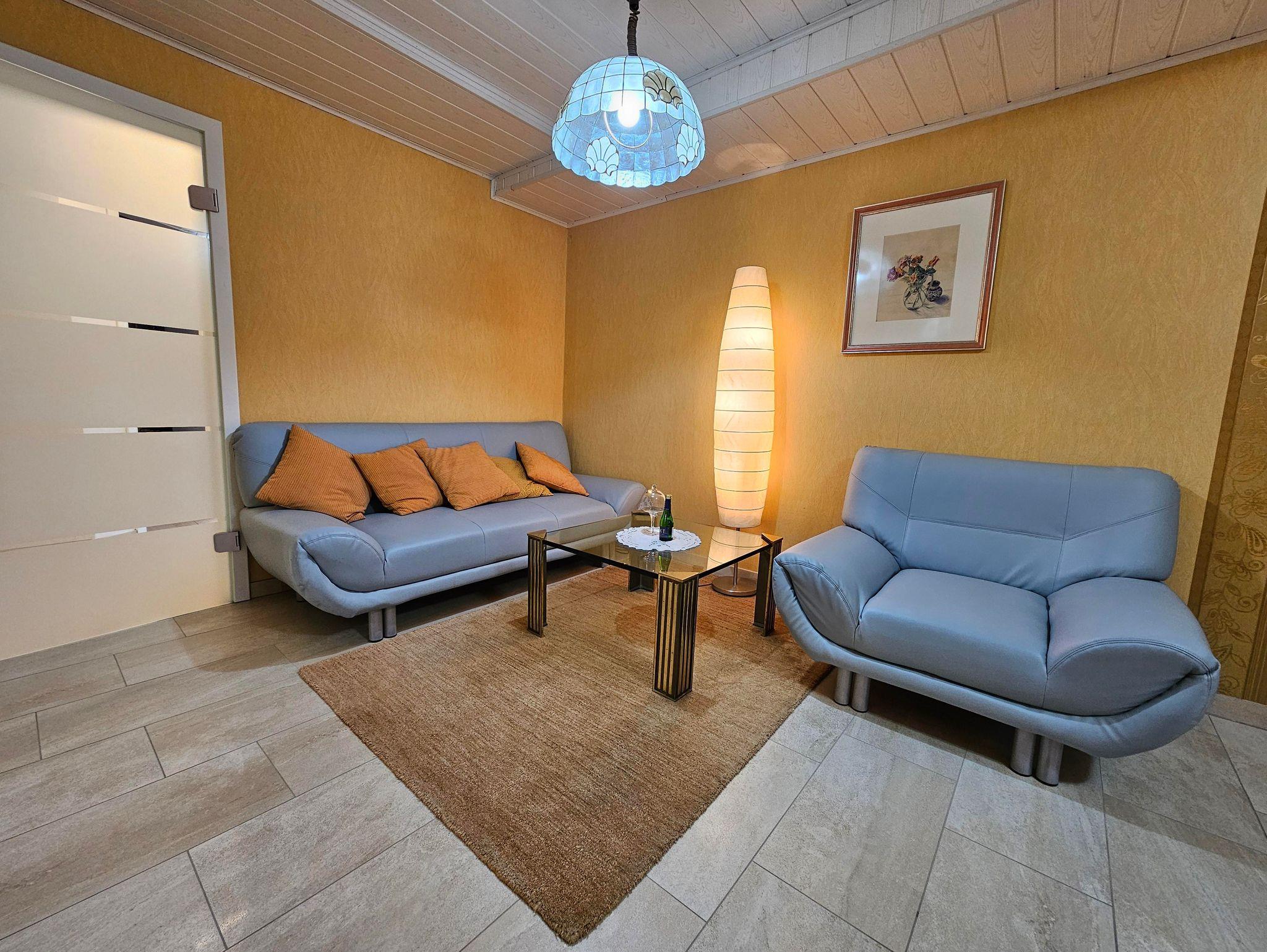 Eine gemütliche Sofaecke, ein Safe im Schrank und ein großer Flachbildschirm mit Sat-TV sind vorhanden.