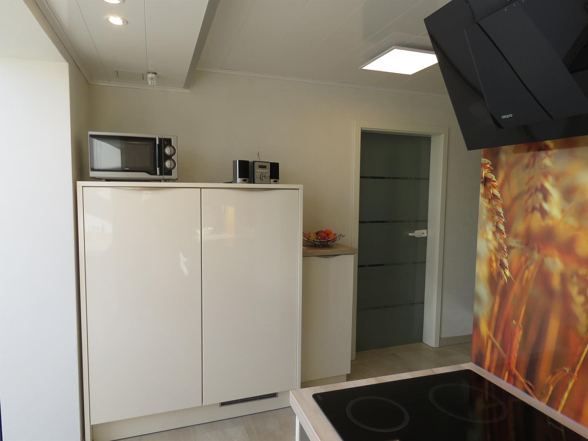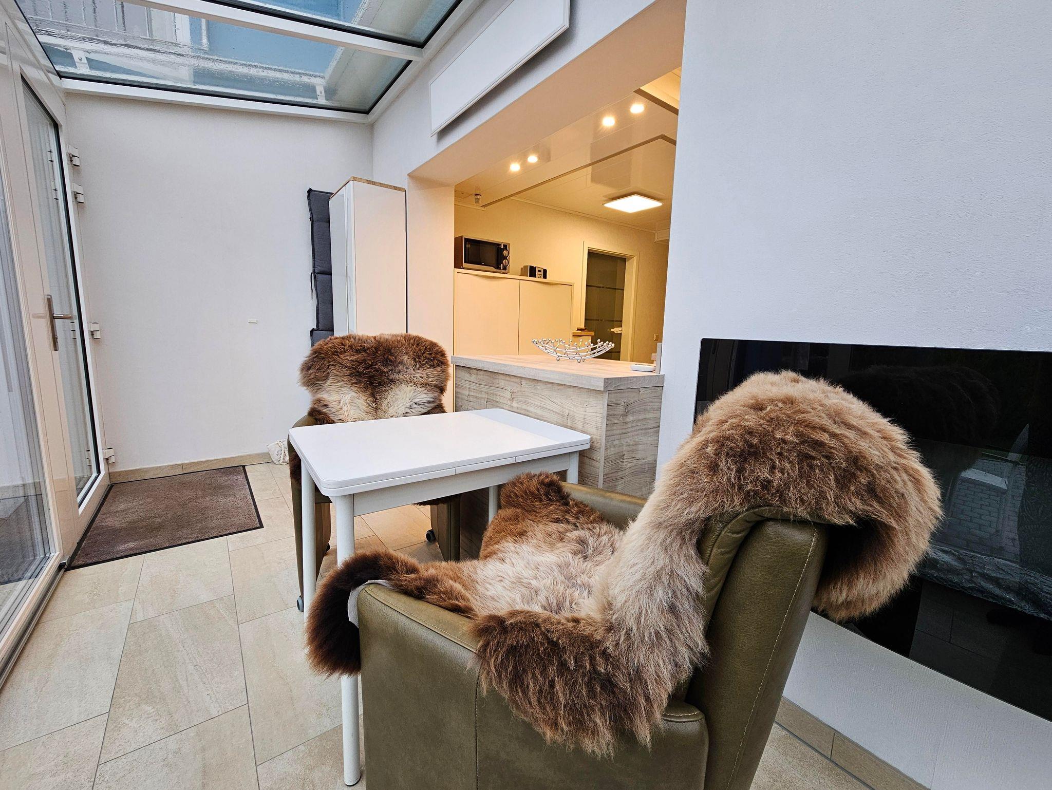 Im angebauten Wintergaten befindet sich der Essebereich mit einem elektrischen Kamin für gemütliche Abendstunden bei einem Glaß Wein. Die angrenzende, offene Küche bietet Ihnen alles was so gebraucht wird. Vom Kaffeevollautonmaten bis zur Spülmaschine.