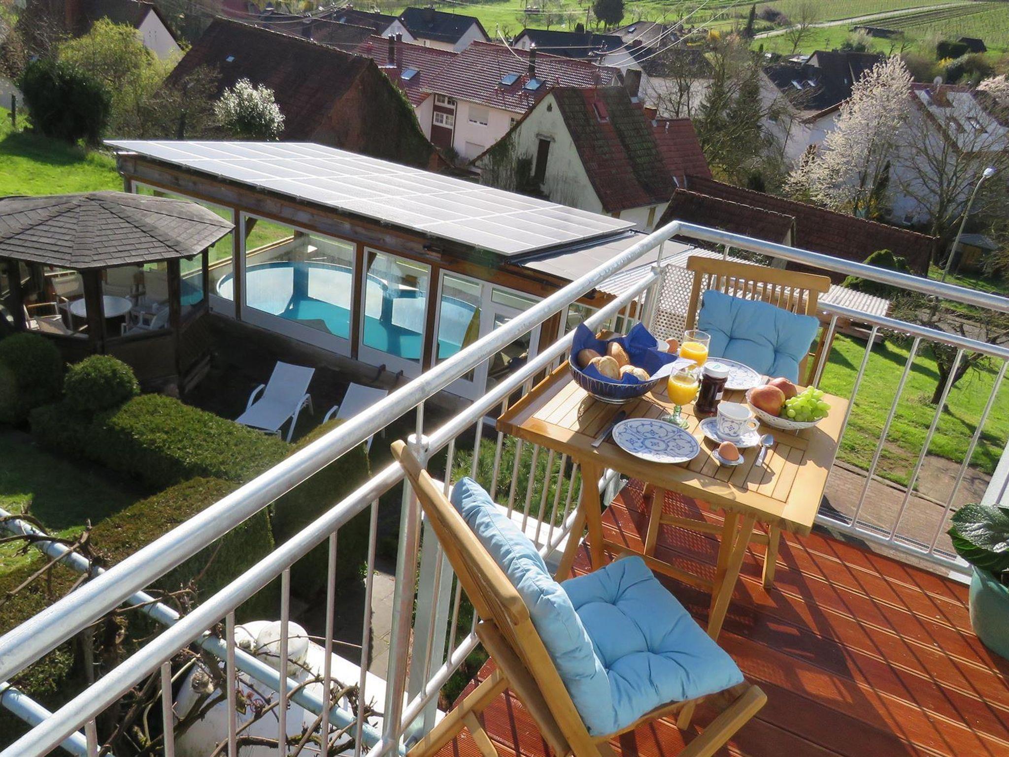 Der Balkon mit Möbel und Sonnenschirm bestückt, bietet Ihnen einen wunderschönen Ausblick in der Morgensonne über die Gartenanlage