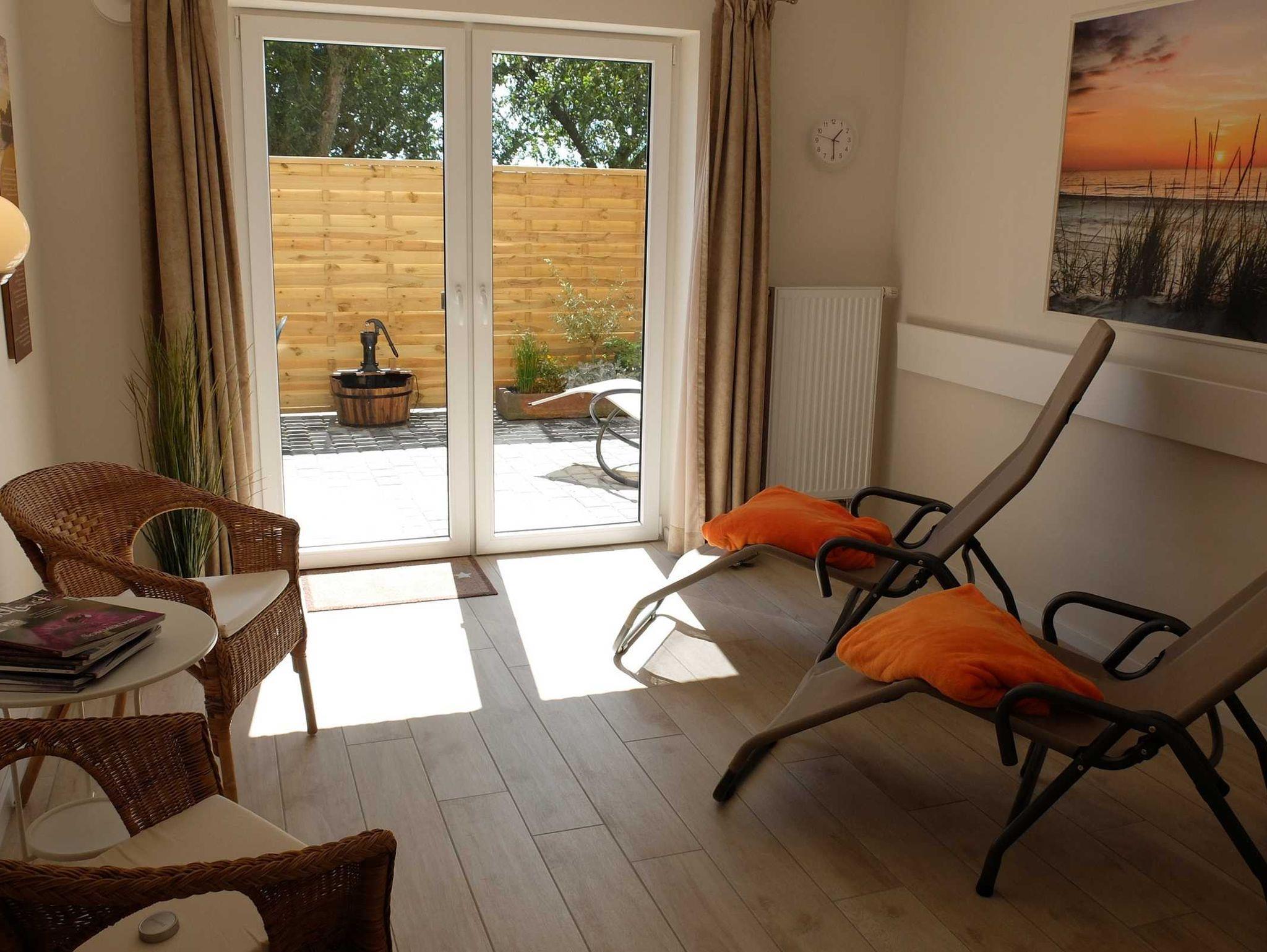 - teilweise überdachte Terrasse mit Sitzmöbeln, Sonnenliege und weitem Blick über Wiesen und Felder