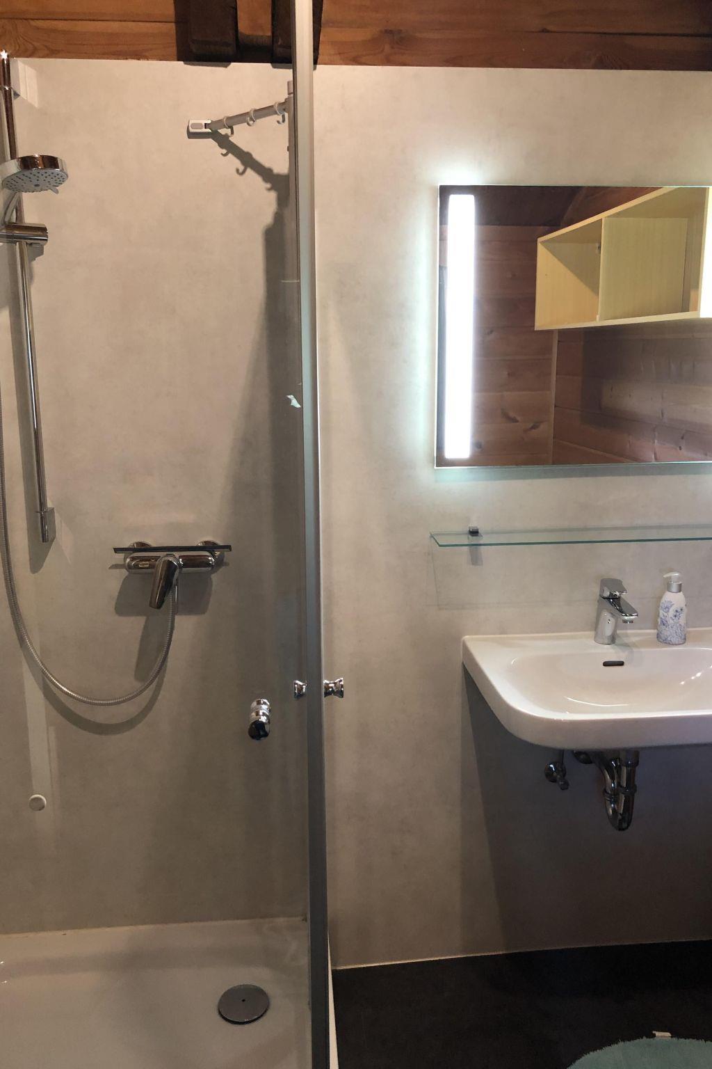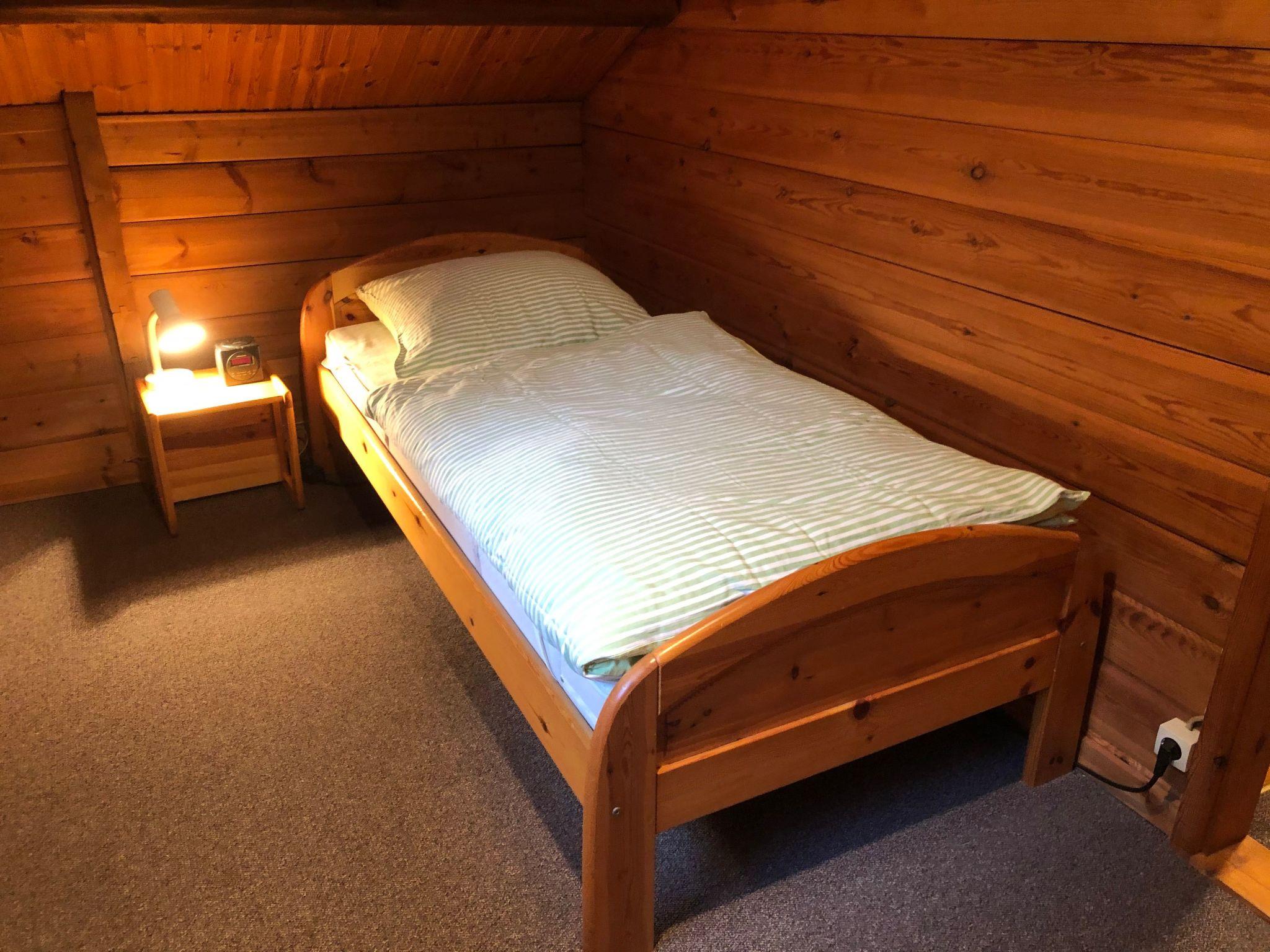 The house is furnished in a rustic style and is semi-circled on the south side by a large terrace. The walls are made of solid, planed logs. There is a marvellous panoramic view from the terrace. The ground floor is 50 m² in size. In the entrance area there is a small hallway from which the shower room with WC and the living room can be reached. The cosy living room with dining area has a large window with patio door to the south, a new wood-burning stove (you must bring your own firewood) and satellite TV. The small kitchen has a fridge, cooker and oven, dishwasher, microwave, coffee machine, toaster and an electric mixer (freezer in the cellar). There is also a small bedroom for two people with two single beds.on the upper floor (34 m²), which can be reached via a small staircase from the living room (child safety locks available), there are two separate bedrooms: a spacious bedroom with a double bed for two people and fitted wardrobes (separate children's travel bed available) and a small bedroom for one person with a bed (90 cm x 200 cm).In the basement (25 m²), which can be accessed through a separate outside door located below the terrace, there is a laundry room with washing machine, freezer, shower, WC, a relaxation room with two loungers and a sauna in which two people can lie down.