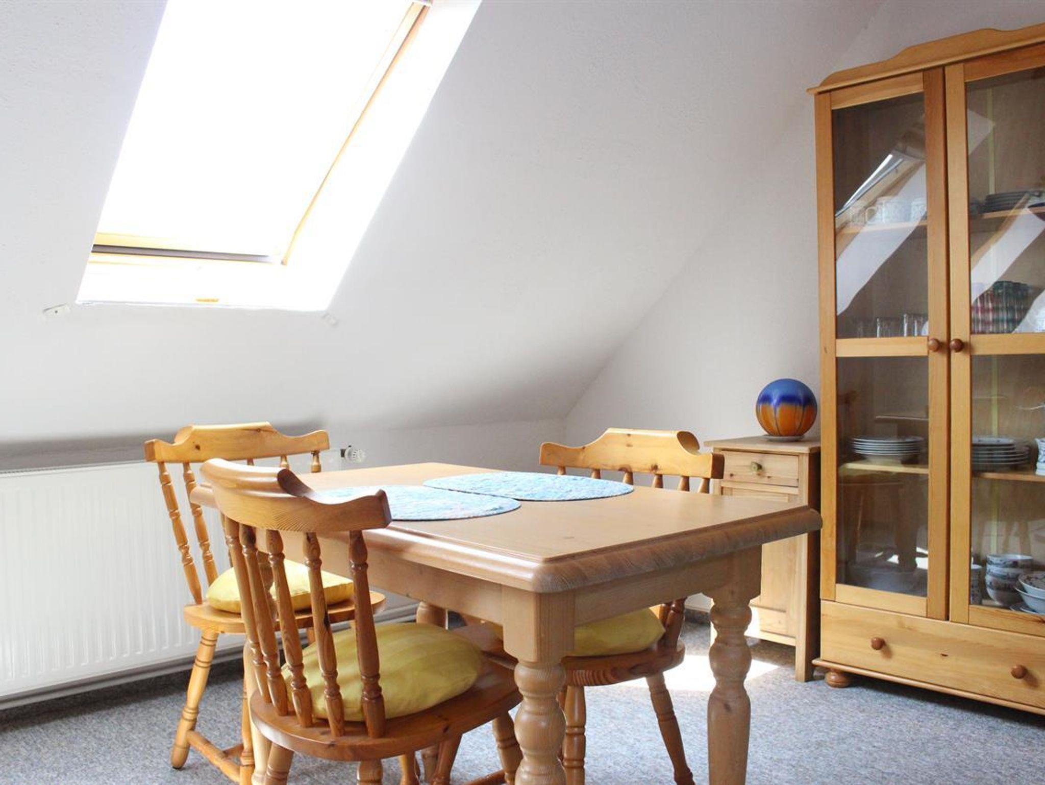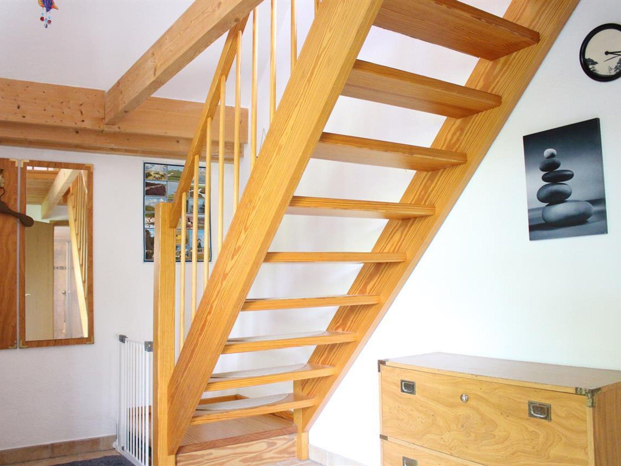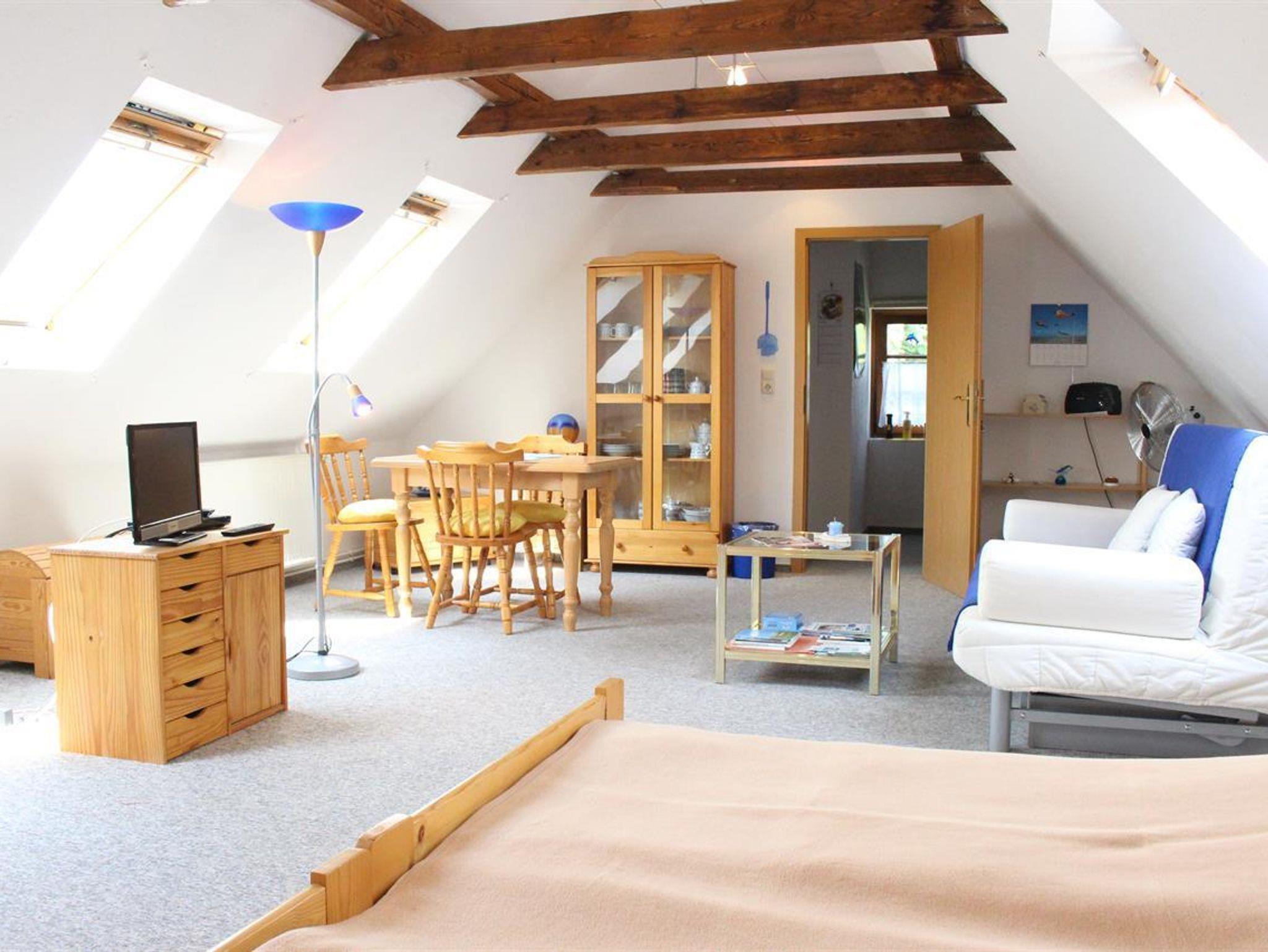 Ein separater Hauseingang führt Sie in den Eingangsbereich von dem auch das Duschbad abgeht. Über eine urige Holztreppe (offene Stufen) erreichen Sie eine kleine Galerie in der ersten Etage (gleichzeitig Dachgeschoß). Die Ferienwohnung ist für 3 Personen, auf Nachfrage auch eine vierte Person, buchbar. Bis zu zwei Hunde sind gegen eine Gebühr herzlich willkommen. Im kombinierten Wohn-, Schlafraum haben Sie ein gemütliches Doppelbett, eine Schlafcouch, ein Essbereich und Sat-TV. Eine kleine, separate Küche ist mit dem Nötigsten ausgestattet; Kochgelegenheit mit insgesamt 2 Herdplatten, Mikrowelle, Spültisch, Toaster, Kaffeemaschine, Wasserkocher. Im Aussenbereich steht Ihnen ein eingezäunter Bereich mit Parkplatz, Strandkorb und Sitzecke zur freien Verfügung.