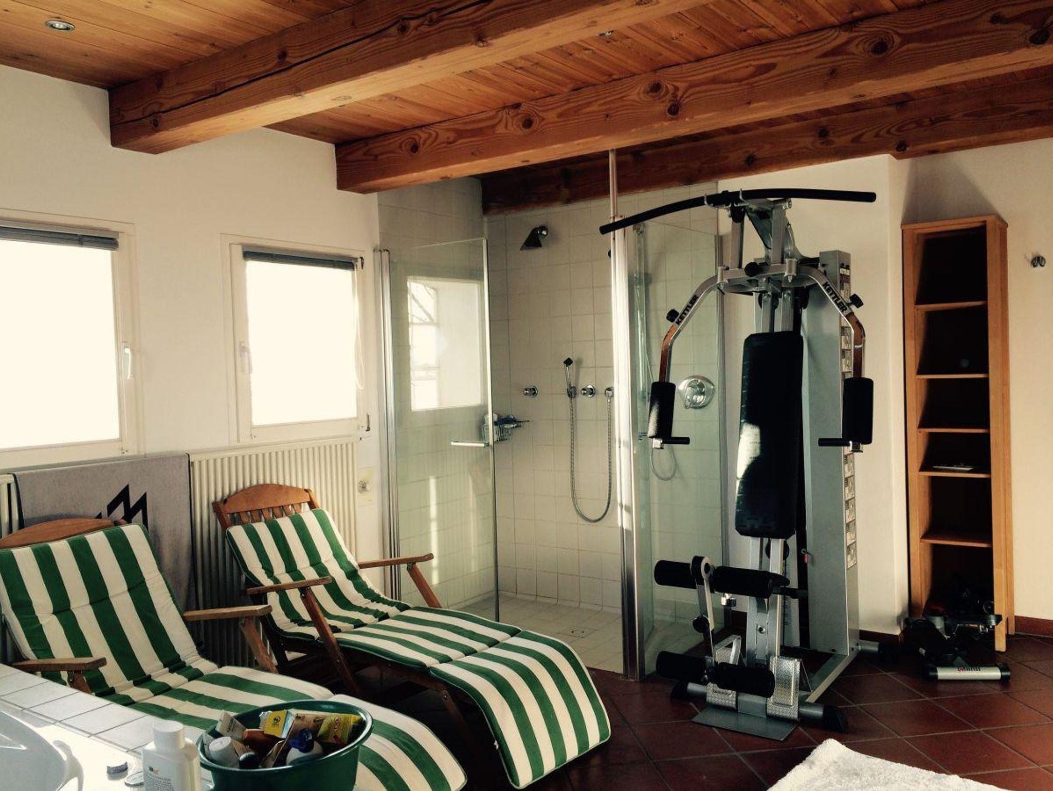 Der Wellnessbereich mit integrierter Fussbodenheizung ist mit einer traditionellen Sauna, Whirlpool, Kaltwasserdusche und Fitnessgeräten ausgestattet.