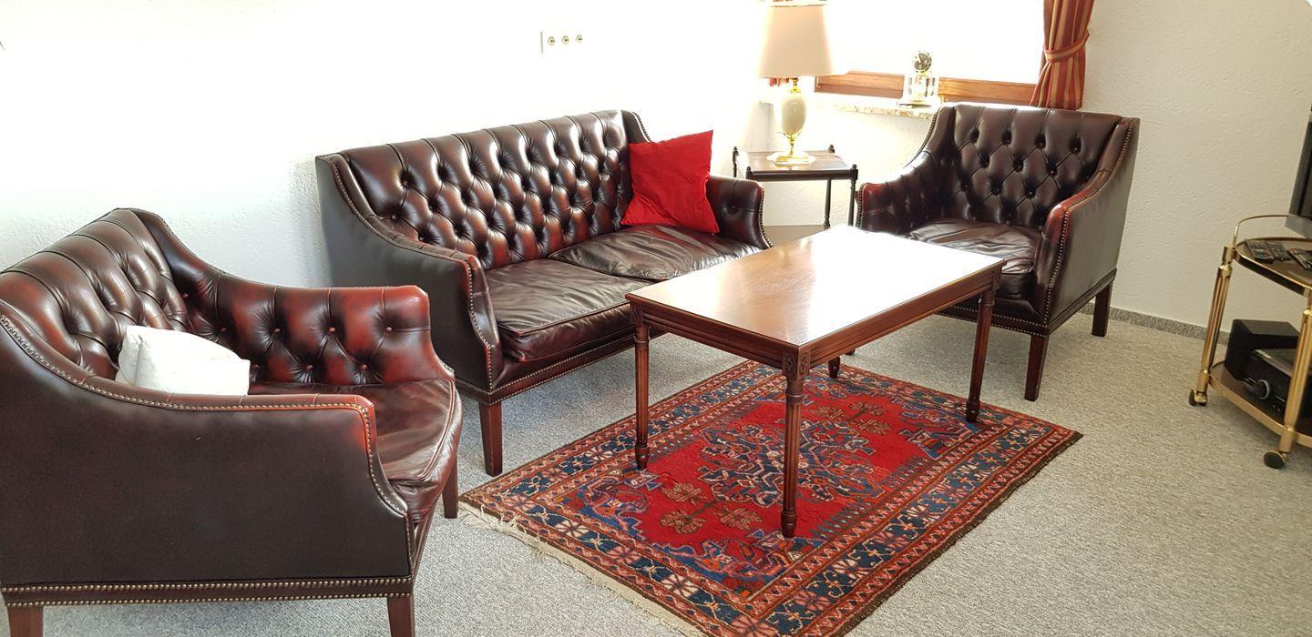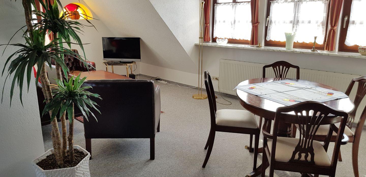 Wohn-Essraum mit Sat-TV, Couchgarnitur, Essbereich für 2 Personen.