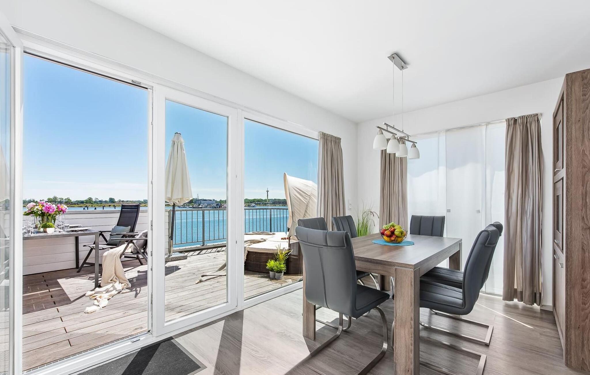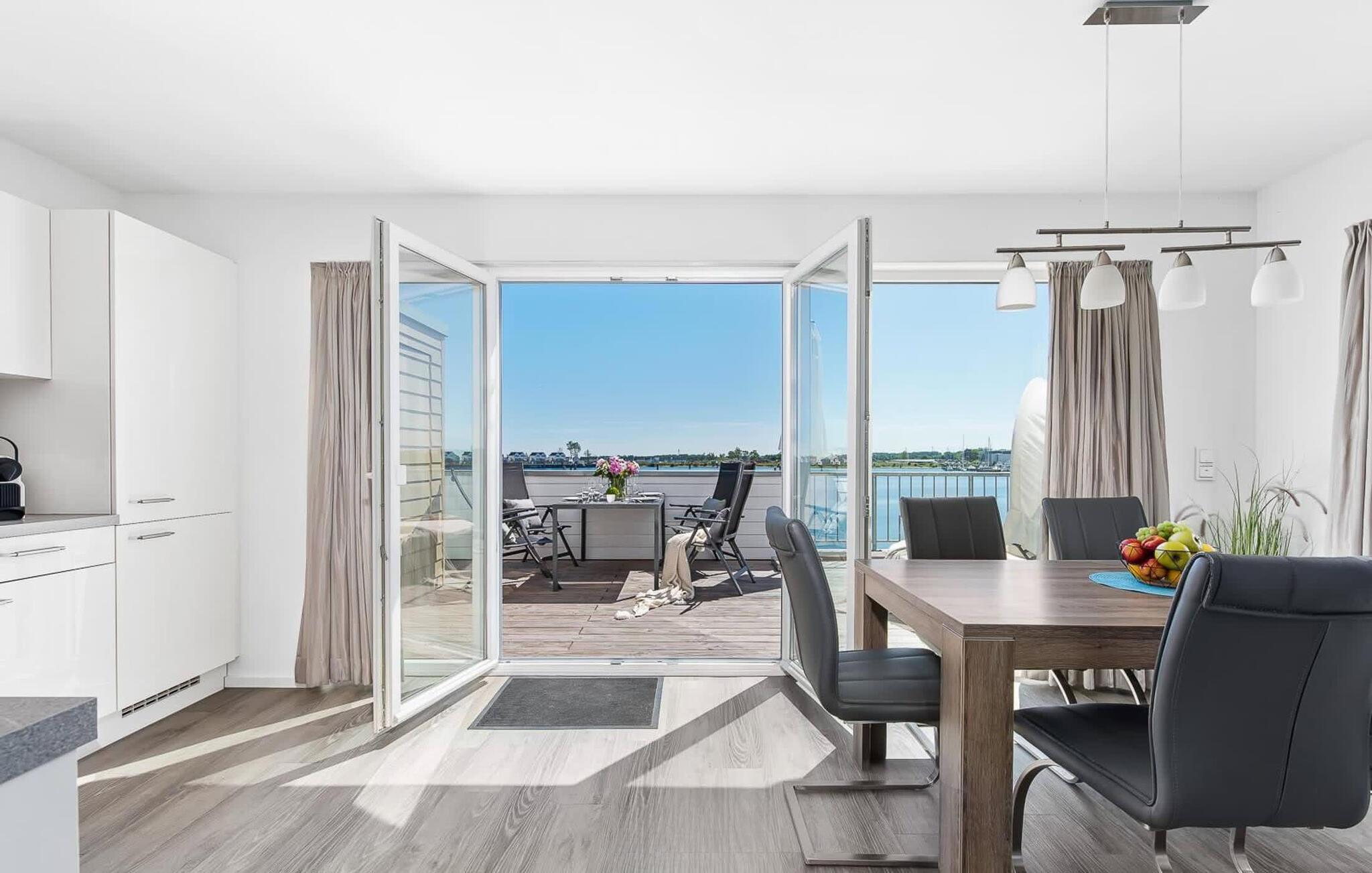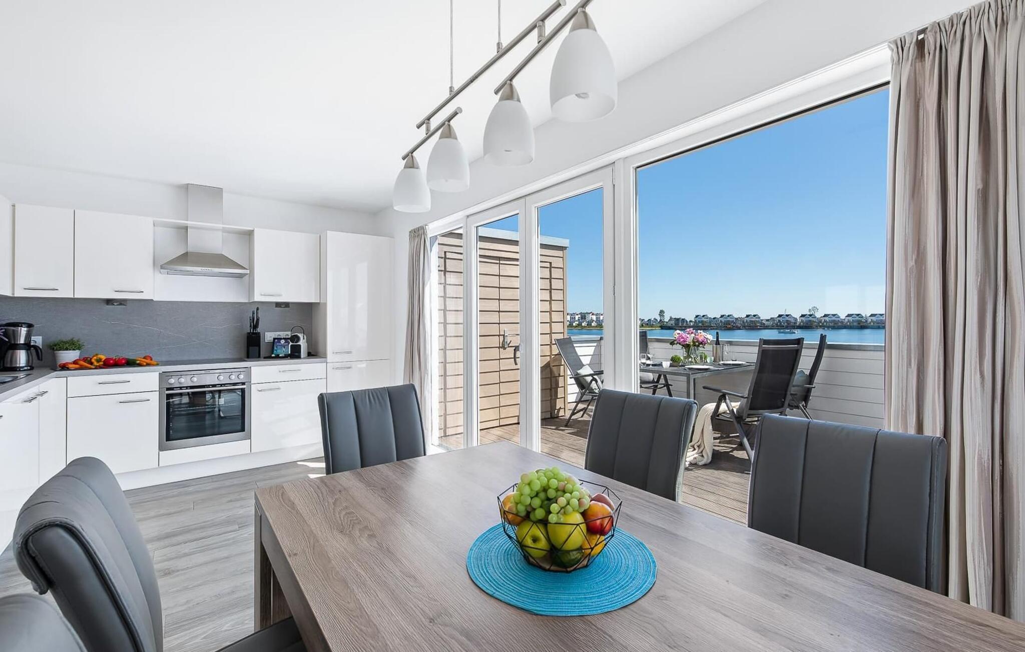 Die voll ausgestattete Wohnküche ist zur Hafenseite hin ausgerichtet und erlaubt einen freien Blick auf das Hafenkino. Vor bodentiefen Fenstern lädt ein massiver Esstisch für sechs Personen zu Urlaubsmahlzeiten ein. Von hier aus gelangt man auf die direkt angrenzende Terrasse mit Süd-Süd-West Ausrichtung. Highlight der großzügigen Terrasse ist die stylische Sonneninsel in Lounge-Optik mit optimalem Windschutz.