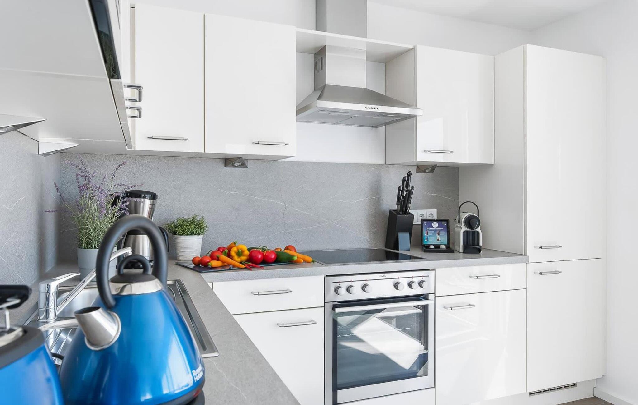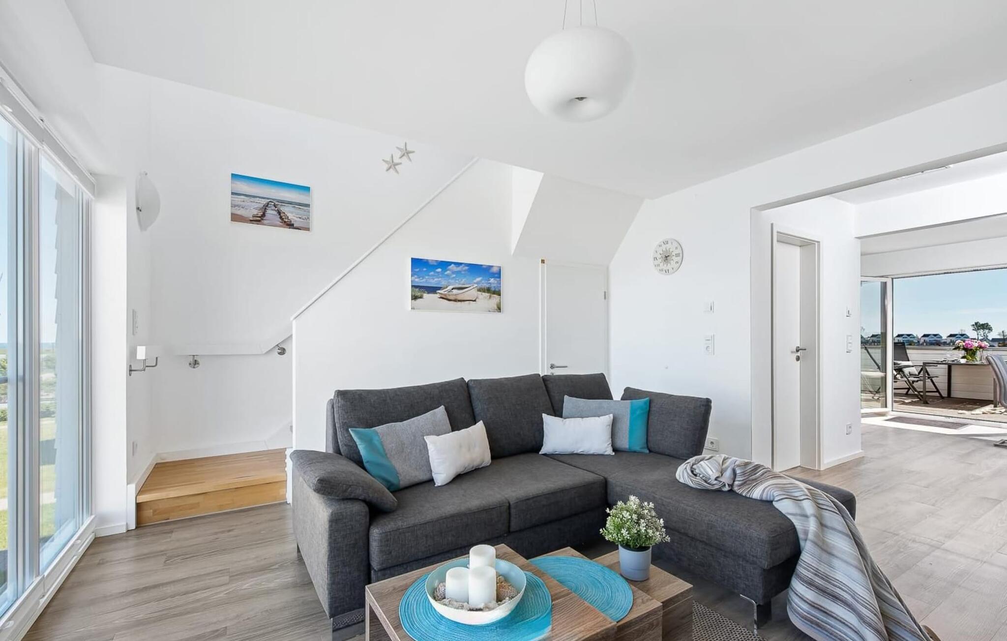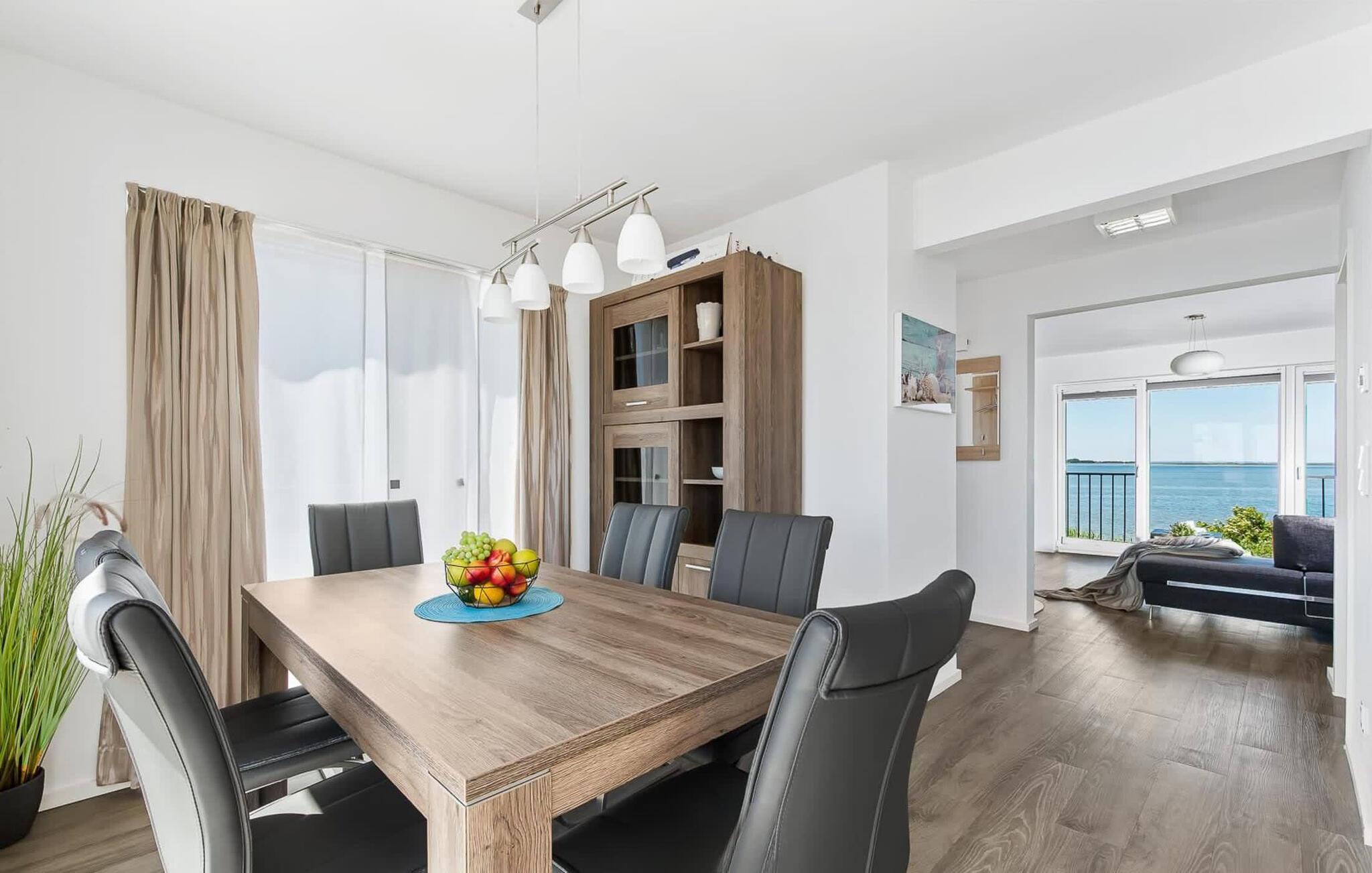 Die voll ausgestattete Wohnküche ist zur Hafenseite hin ausgerichtet und erlaubt einen freien Blick auf das Hafenkino. Vor bodentiefen Fenstern lädt ein massiver Esstisch für sechs Personen zu Urlaubsmahlzeiten ein. Von hier aus gelangt man auf die direkt angrenzende Terrasse mit Süd-Süd-West Ausrichtung. Highlight der großzügigen Terrasse ist die stylische Sonneninsel in Lounge-Optik mit optimalem Windschutz.