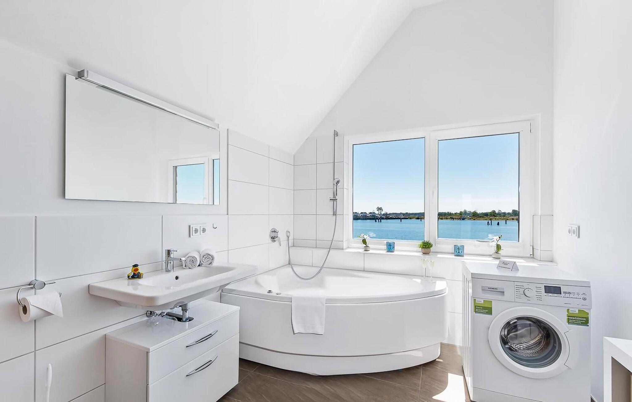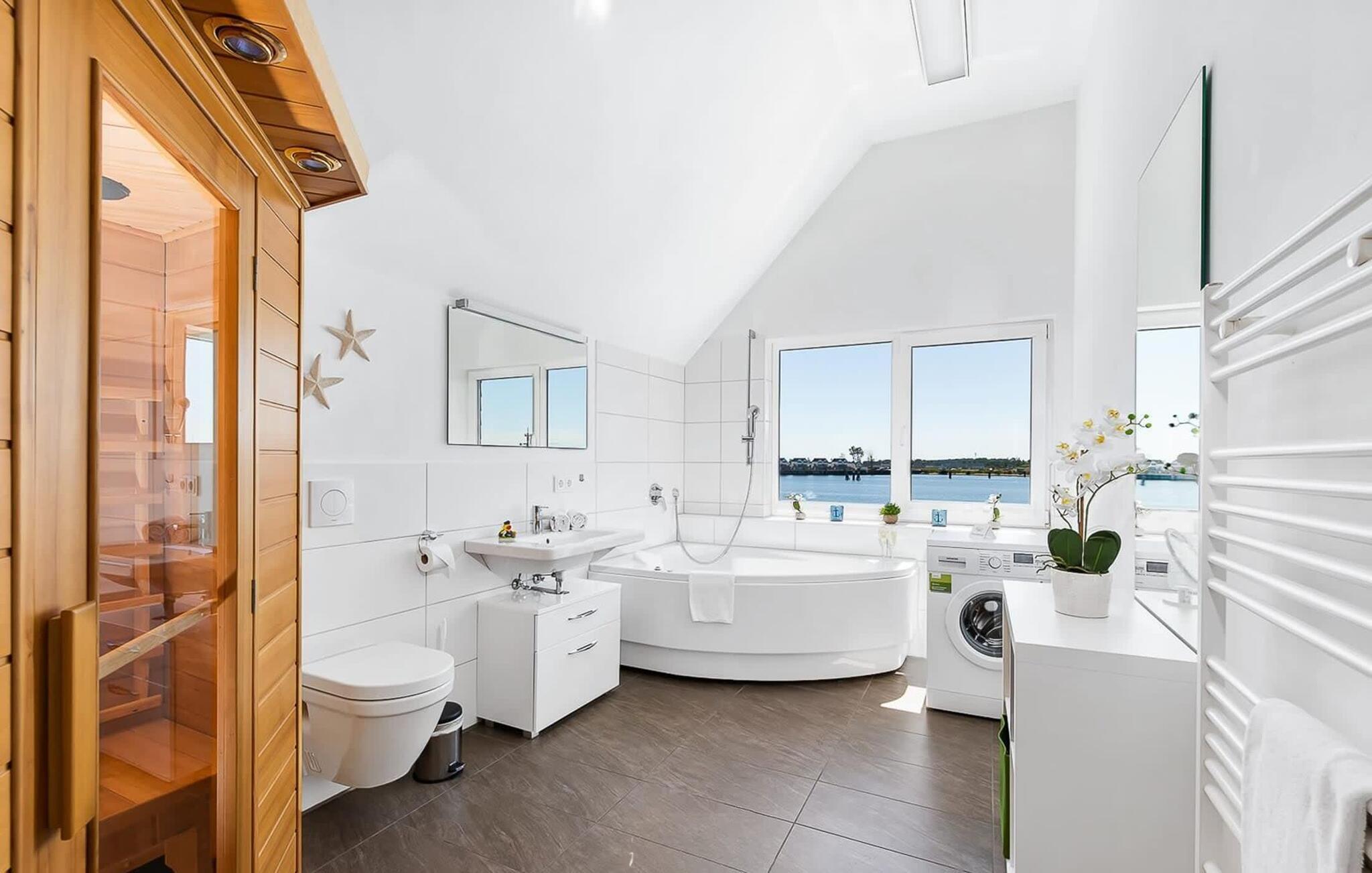 Auf der obersten Wohnebene befindet sich der Schlafbereich. Beide Schlafzimmer bieten mit Wasserblick pure Erholung, während hohe Decken und Schrägen für eine besondere Gemütlichkeit sorgen. Das Hauptschlafzimmer verfügt über einen zusätzlichen TV. Zwei weitere Schlafplätze befinden sich auf der komfortablen Schlafcouch im Wohnbereich. Wellness bei Schleiblick bietet das voll ausgestattete Badezimmer auf der oberen Ebene mit Sauna (Infrarotkabine) und Whirlpool-Badewanne. Für zusätzlichen Komfort sorgt ein Duschbad auf der ersten Wohnungsebene.