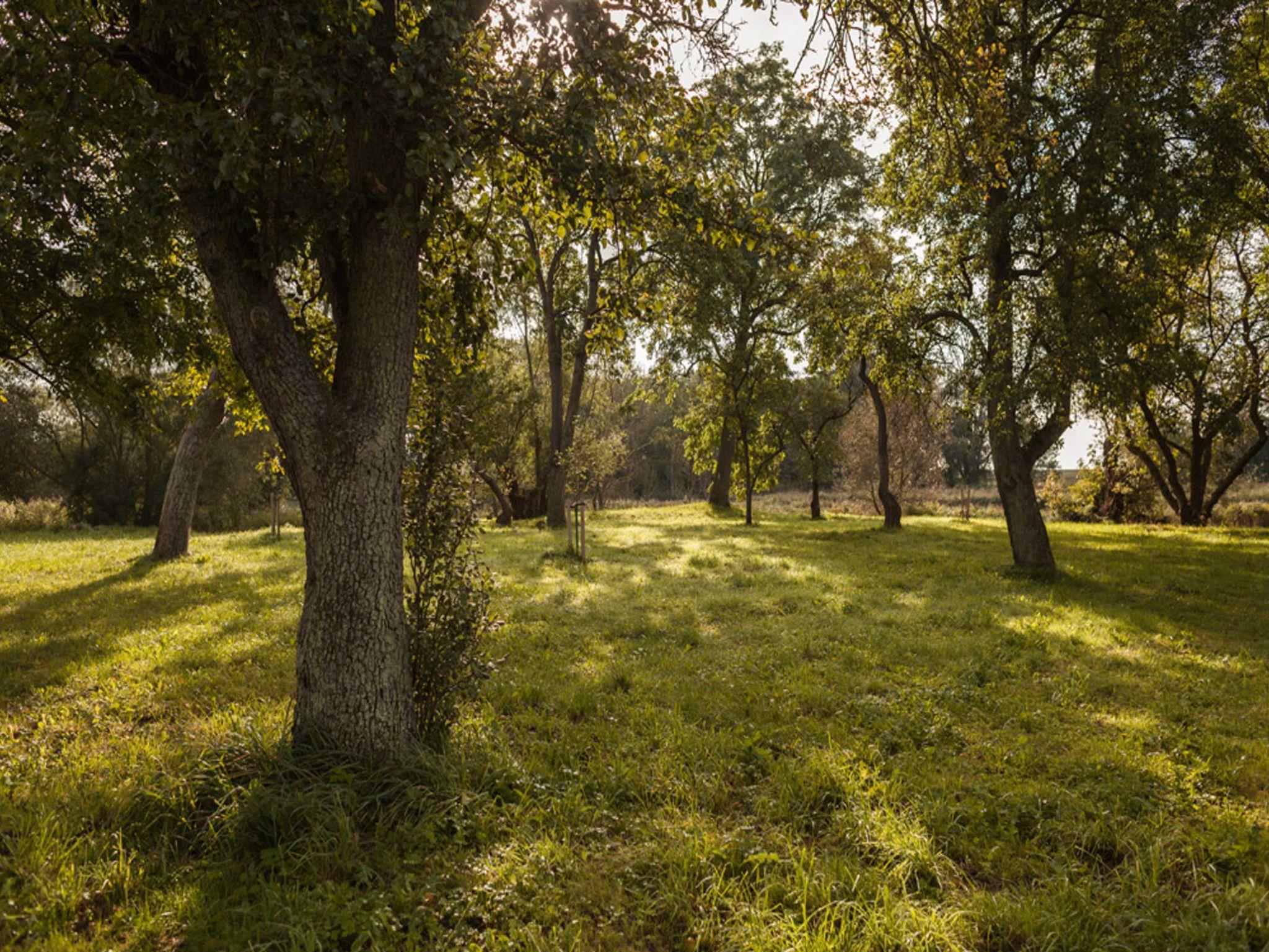 Das Haus liegt inmitten eines ebenfalls unter Denkmalschutz stehenden Parks. Darin befinden sich die zum Teil über hundert Jahre alten Obstbäume an denen weiterhin Äpfel, Birnen, Pflaumen, Nüsse und weitere Früchte wachsen.