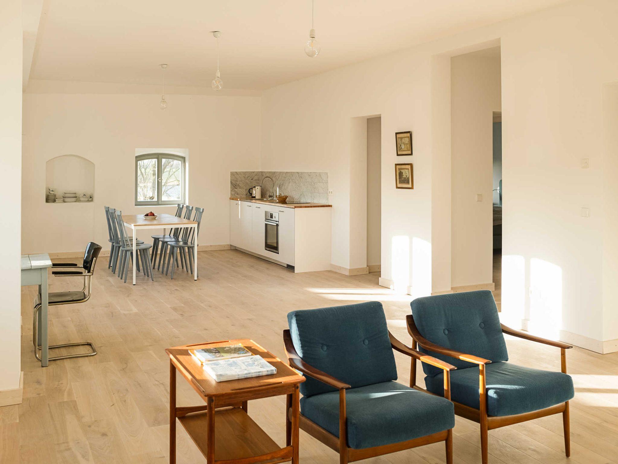 In den drei Obergeschossen des Herrenhauses wurden sieben hochwertige Wohnungen eingerichtet. In Erdgeschoss und Gutspark befinden sich großzügige Räume und Flächen, welche für die Ausrichtung aller denkbaren feierlichen Anlässe und Veranstaltungen geeignet sind.