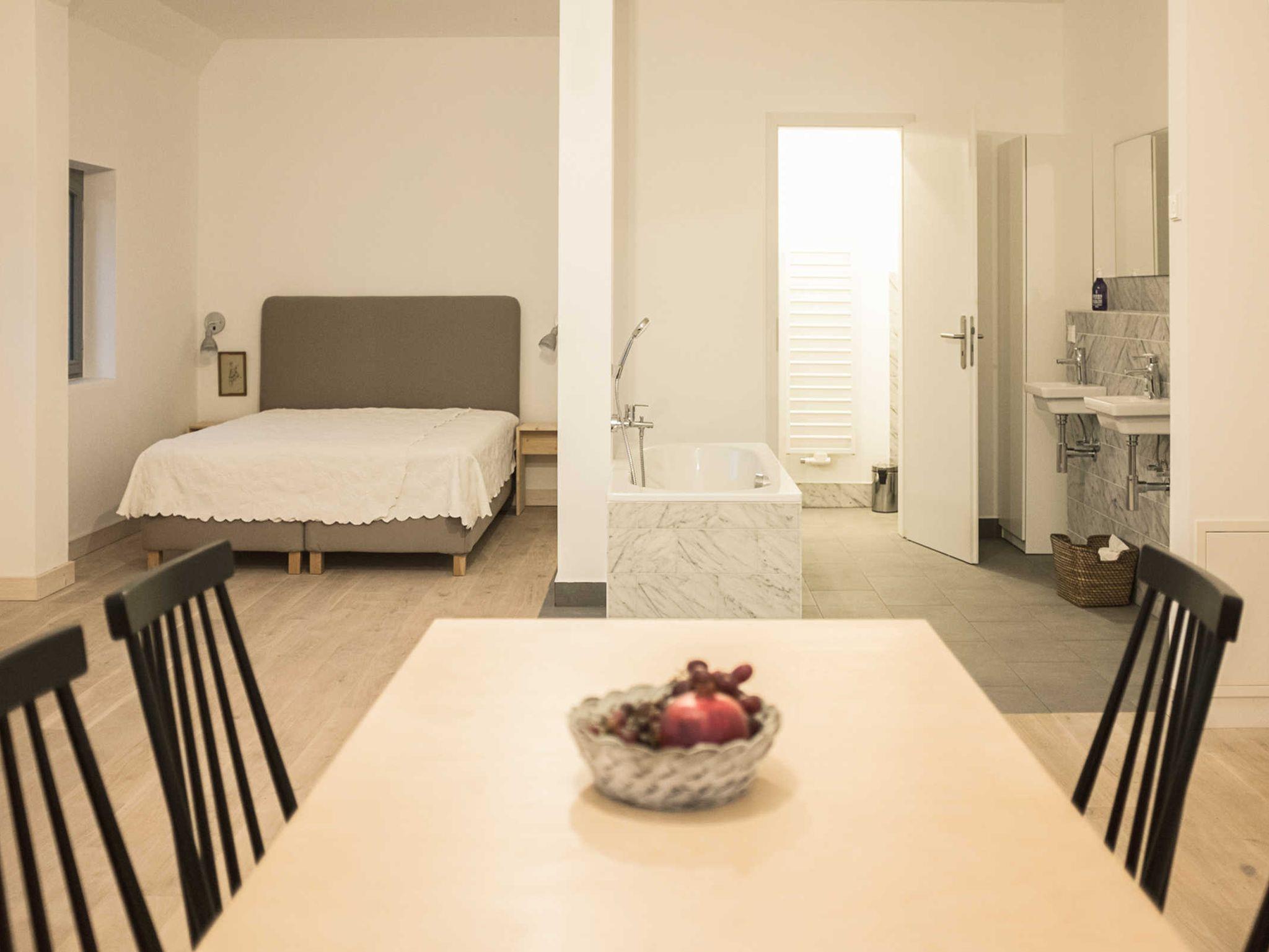 • offener Grundriss mit Schlafbereich, Wohnbereich, Küche und freistehender Badewanne