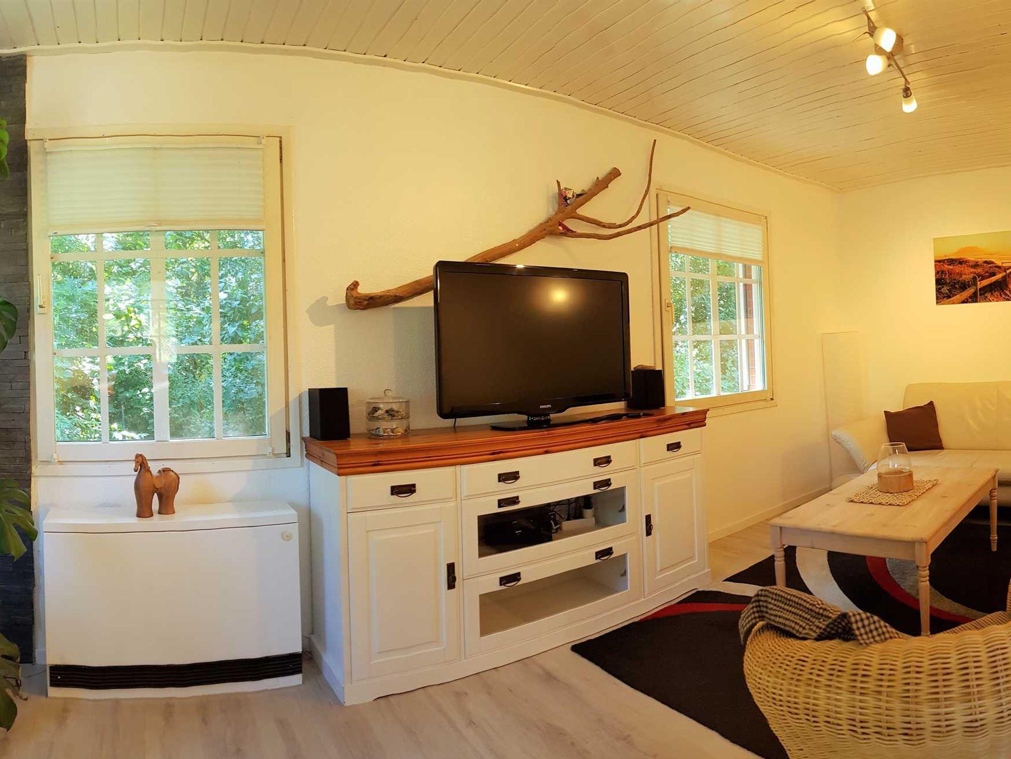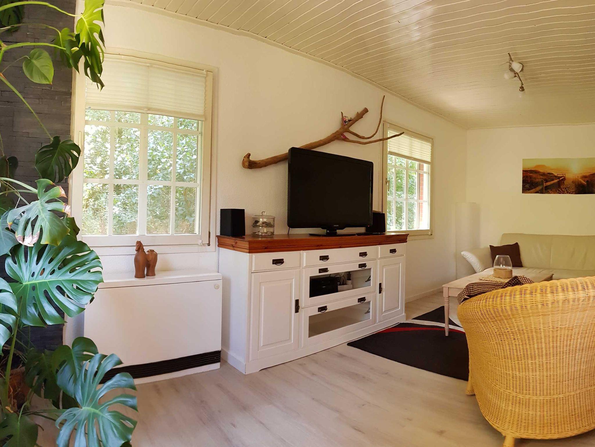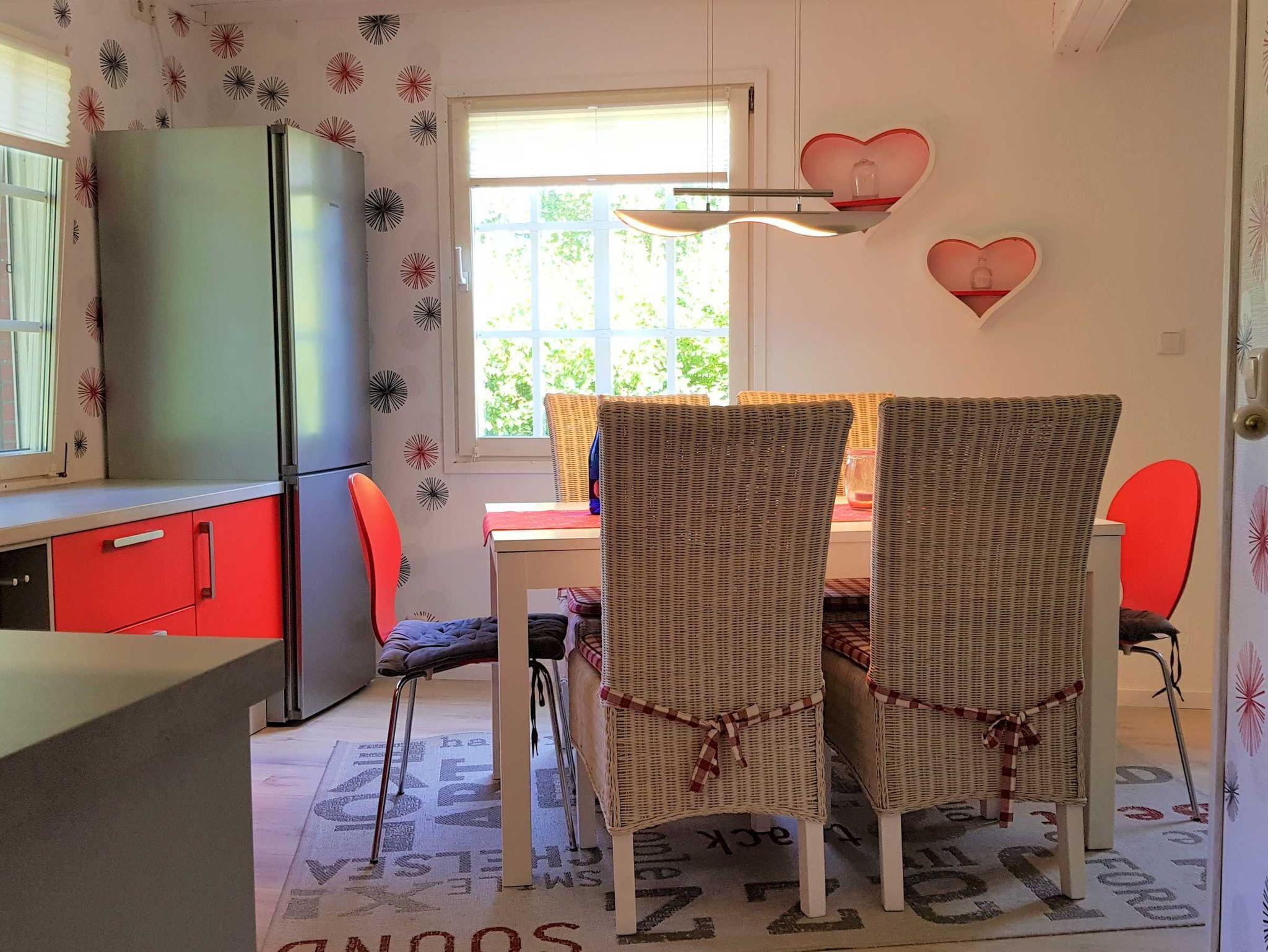 Es verfügt über drei Schlafzimmer. Das Schlafzimmer im Erdgeschoss ist mit zwei Einzelbetten (je 90 x 200 cm), sowie einem Gäste WC mit Waschgelegenheit ausgestattet. Die beiden anderen Schlafzimmer befinden sich im Obergeschoss. Es handelt sich dabei um einen großzügigen Schlafbereich mit einem Doppelbett (160 X 200 cm), begehbaren Kleiderschrank, sowie einer gemütlichen Sitzgelegenheit. Das andere Schlafzimmer im Obergeschoss verfügt über ein gemütliches Doppelbett (140 x 200 cm) im französischen Stil. Über den angrenzenden Flur gelangt man in ein geräumiges Duschbad mit Waschbecken und WC. Im Erdgeschoss befindet sich die komplett ausgestattete Wohnküche, die mit allen notwendigen Geräten ausgestattet ist, um nicht nur kochen, sondern auch backen zu können. Wenn es schnell gehen muss, kann man auch die Mikrowelle benutzen. Nach dem Kochen übernimmt die Spülmaschine die restliche Arbeit, damit einem entspannten Essen nichts mehr im Wege steht. Aber auch das Frühstück kann gut beginnen, dafür sorgen die Kaffeemaschine, der Toaster und der Wasserkocher. Da der Kühlschrank auch über ein Gefrierfach verfügt, können Lebensmittel während Ihres Aufenthaltes optimal aufbewahrt werden. Direkt an die Küche schließt sich das Wohnzimmer an. Dort findet man moderne Unterhaltungselektronik. In allen Räumen gibt es eine Heizung, so dass es auch bei schlechtem oder kaltem Wetter immer schön warm ist.