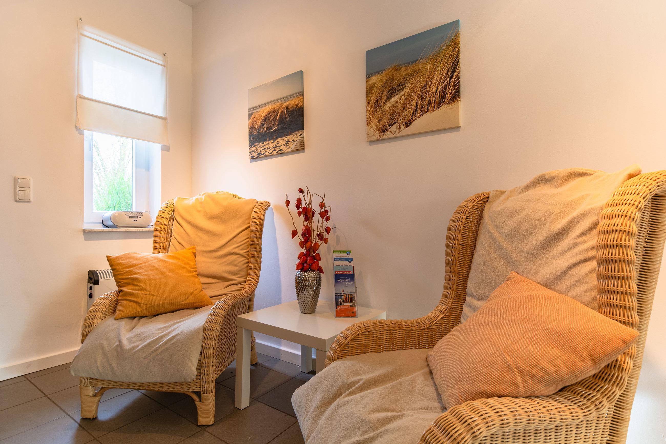 Vom Wohnbereich geht es direkt auf die Terrasse mit Sitzgelegenheiten und Liegestühlen. Gerne können Sie auch unsere überall im Garten verteilten weiteren Sitz- und Ruheoasen nutzen.