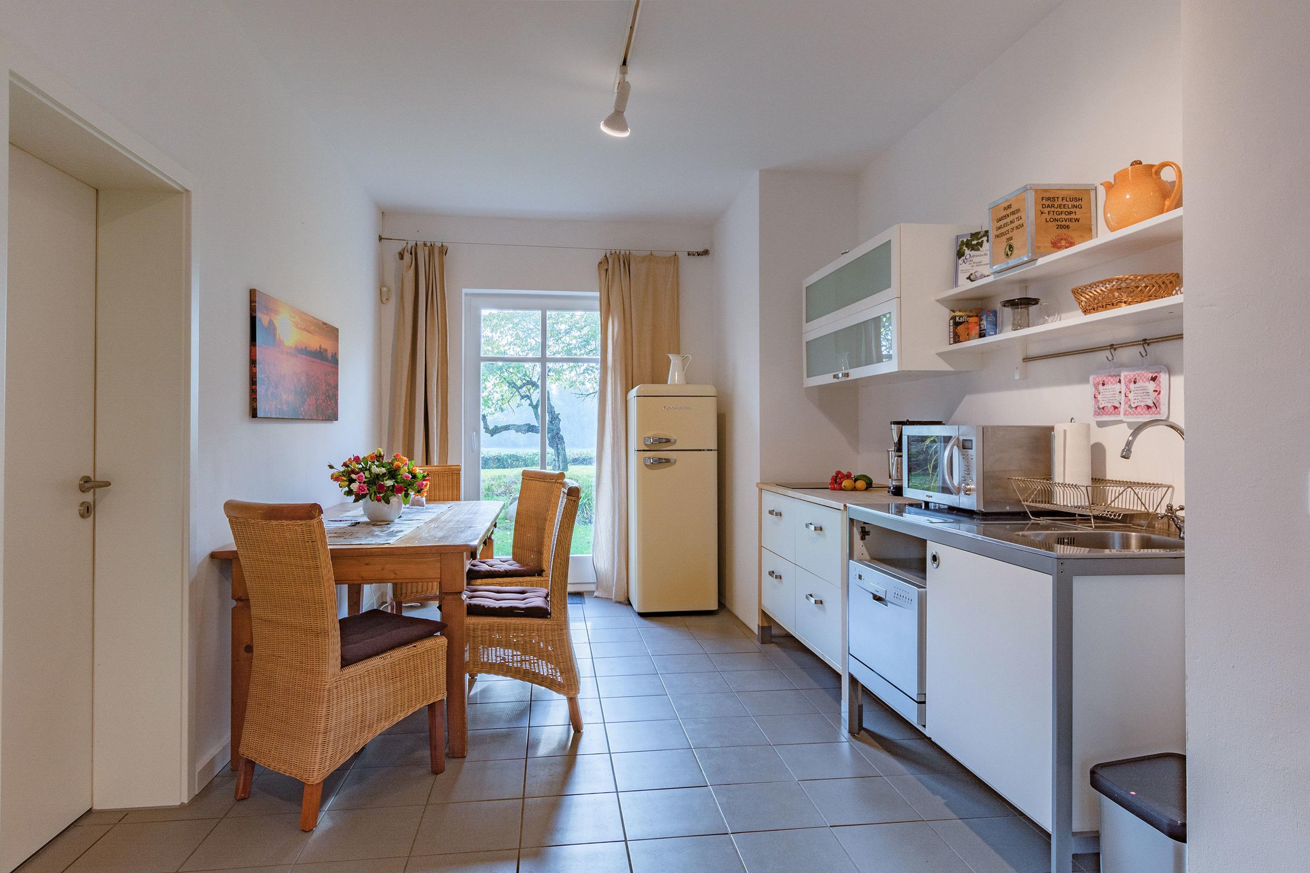 Unsere Wohnung Kräutergarten ist eine große, helle und freundliche Wohnung. Sie verfügt über eine offene Küche mit gemütlichem Essbereich. Die Küche ist komplett ausgestattet.