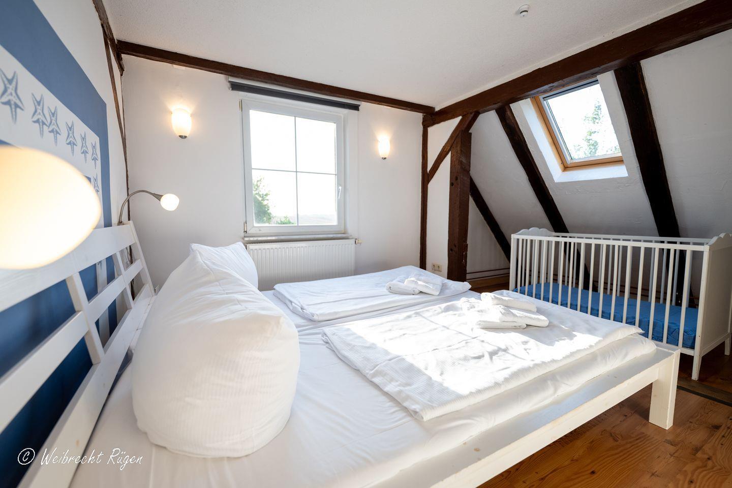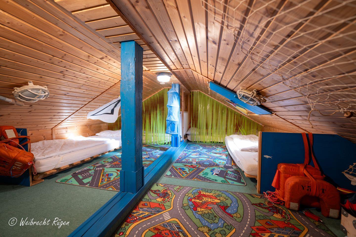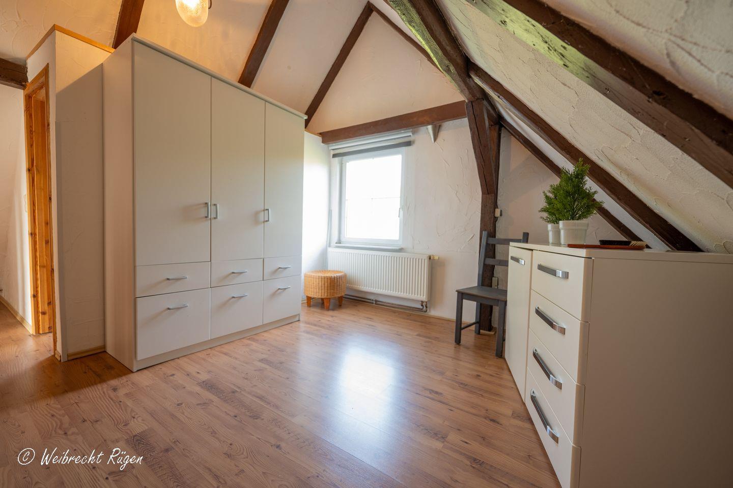 Über eine Treppe gelangen Sie zur kleinen Galerie im Dachgeschoss. Von hier aus führen Türen in das zweite, sehr geräumige Schlafzimmer und zu einem zusätzlichen WC. Der liebevoll gestaltete Spiel- und Schlafbereich im Spitzboden wird für Kinder schnell zum Lieblingsort – ein kleines Abenteuerreich mit niedriger Deckenhöhe und viel Gemütlichkeit.