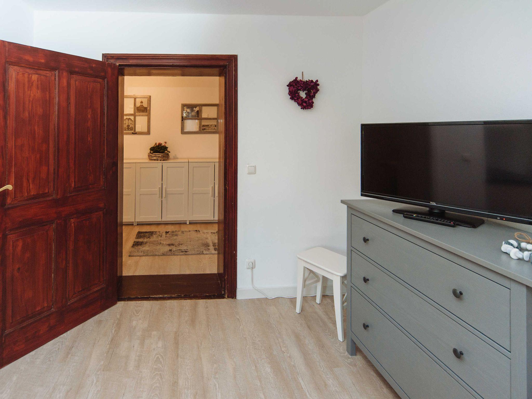 Variante 1 Ap. 10 verfügt über 1 Schlafzimmer mit Doppelbett (Gartenseite), 1 Schlafzimmer mit Etagenbett (Straßenseite), 1 Wohnraum mit Schlafsofa (für bis zu 2 Personen, Straßenseite) und TV, 1 Küche mit Sitzmöglichkeit (Gartenseite) und 1 Badezimmer mit Dusch-Badewanne. Dieses Apartment befindet sich im Erdgeschoss des Haupthauses. WLAN verfügbar.
