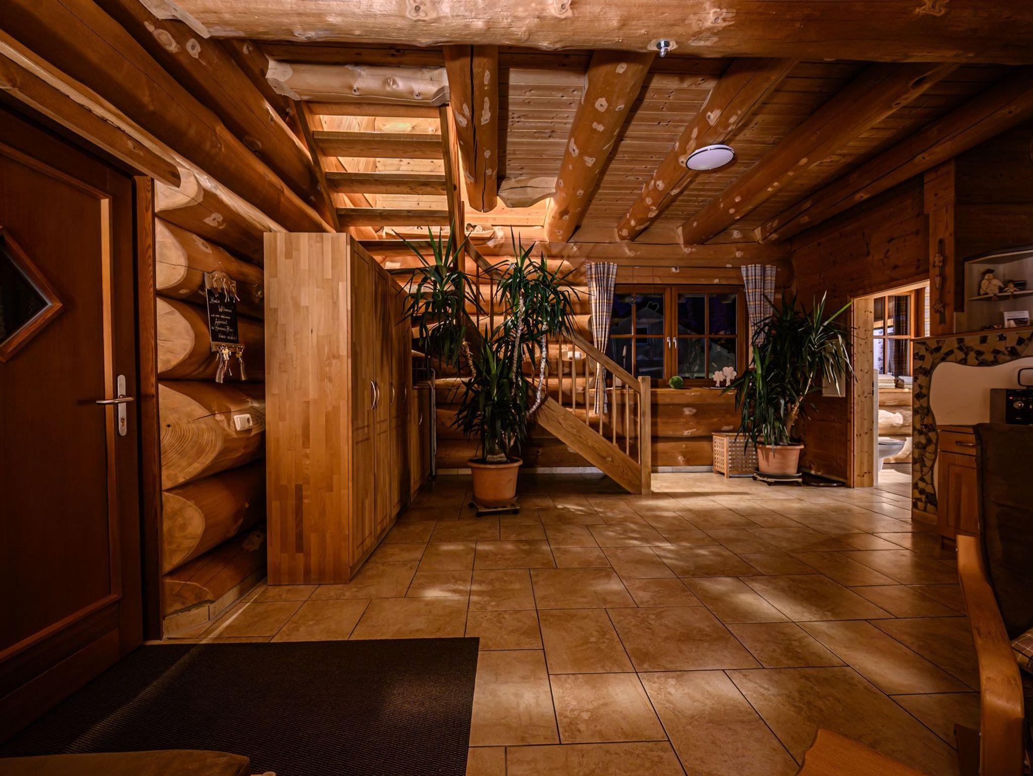 Das gesamte Naturstammhaus verfügt über Fußbodenheizung .