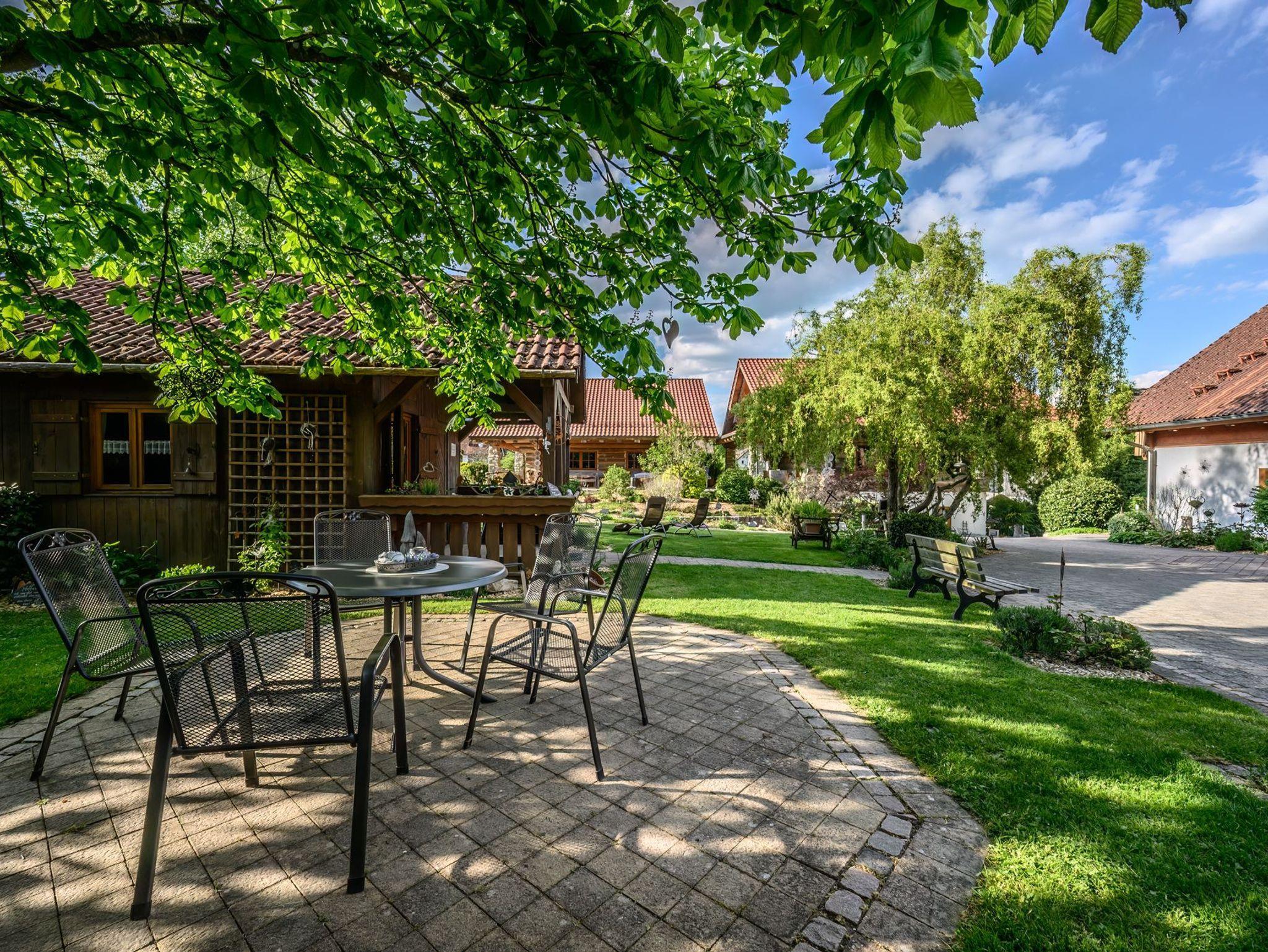 Im Außenbereich laden auf einer teils überdachten Terrasse eine Naturstamm-Sitzgruppe sowie auch Liegestühle zum Entspannen ein.