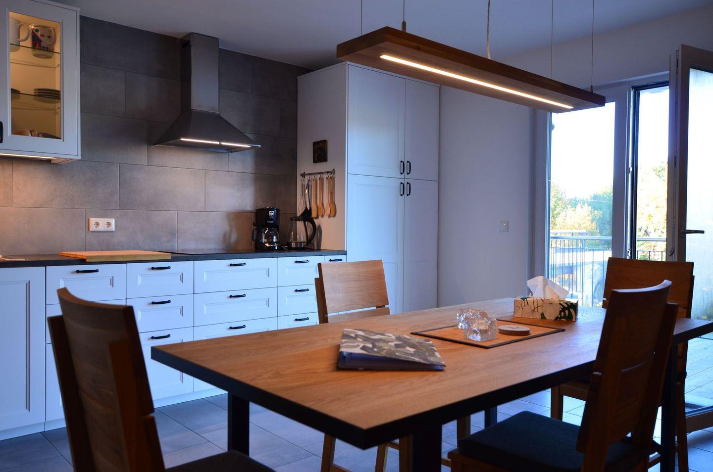 Beim Betreten der Wohnung begrüßt Sie die hochwertige, moderne und offene Küche mit Kühl-Gefrierkombination, Kaffeemaschine, Backofen, Spülmaschine, Wasserkocher und Toaster.