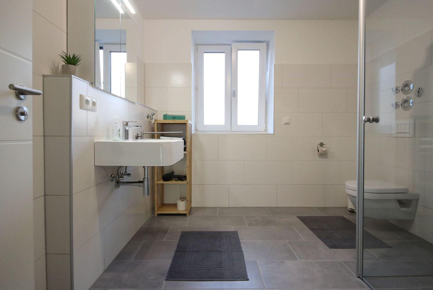 Das moderne Badezimmer mit Fenster verfügt über eine hochwertige Dusche, ein WC mit Waschbecken. Zusätzlich steht Ihnen ein Gäste WC zur Verfügung.