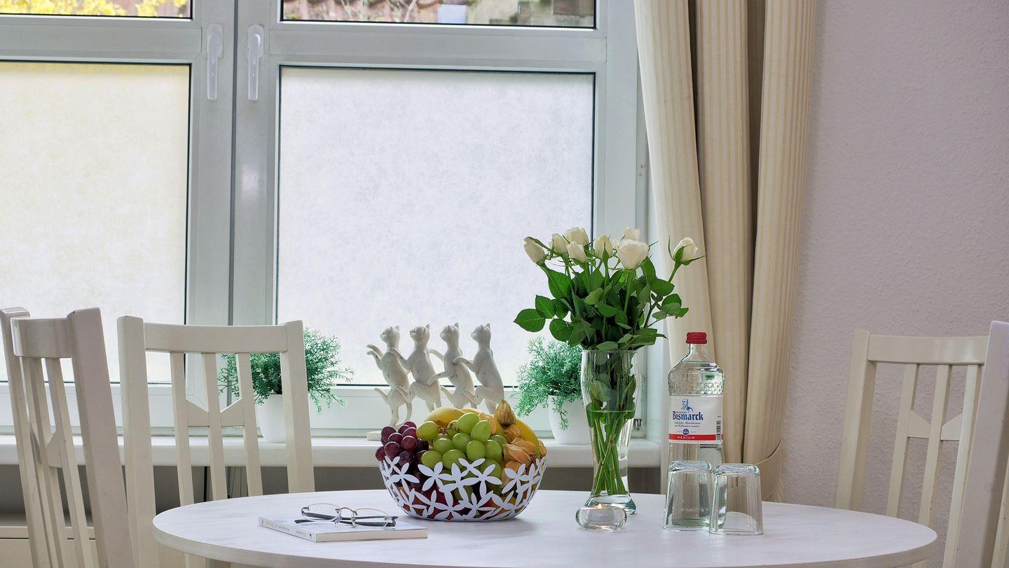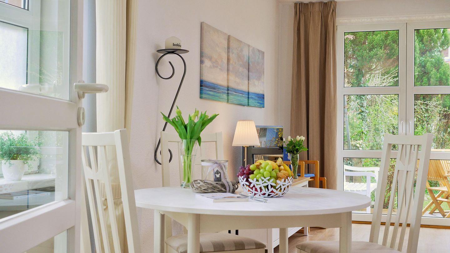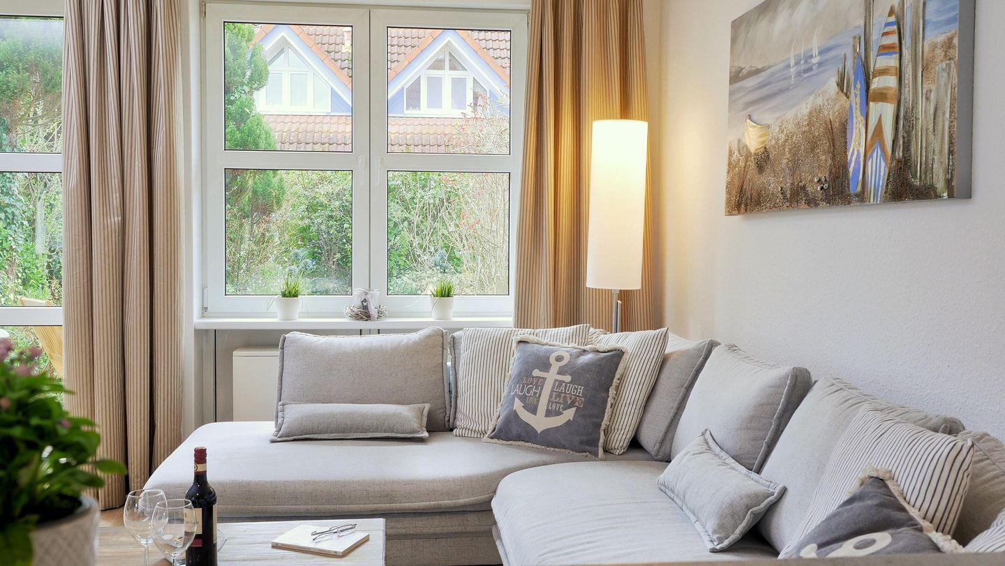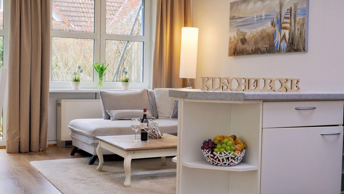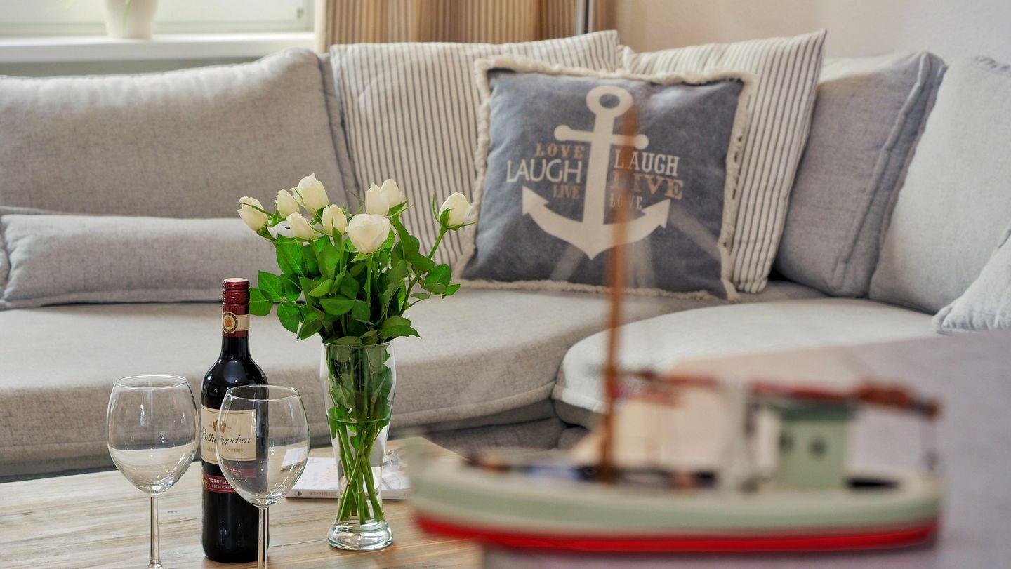 Eine ideale Ferienunterkunft für zwei Personen. Die im Erdgeschoss idyllisch gelegene 50 m² große, ansprechend eingerichtete Wohnung in der Ferienanlage Kapitänsgarten verfügt über einen eigenen Eingang und besticht durch viele Details. Die helle und freundliche Wohnküche ist gemütlich und geschmackvoll eingerichtet. Das Badezimmer verfügt über eine Fußbodenheizung. Im Schlafzimmer befindet sich ein Doppelbett.