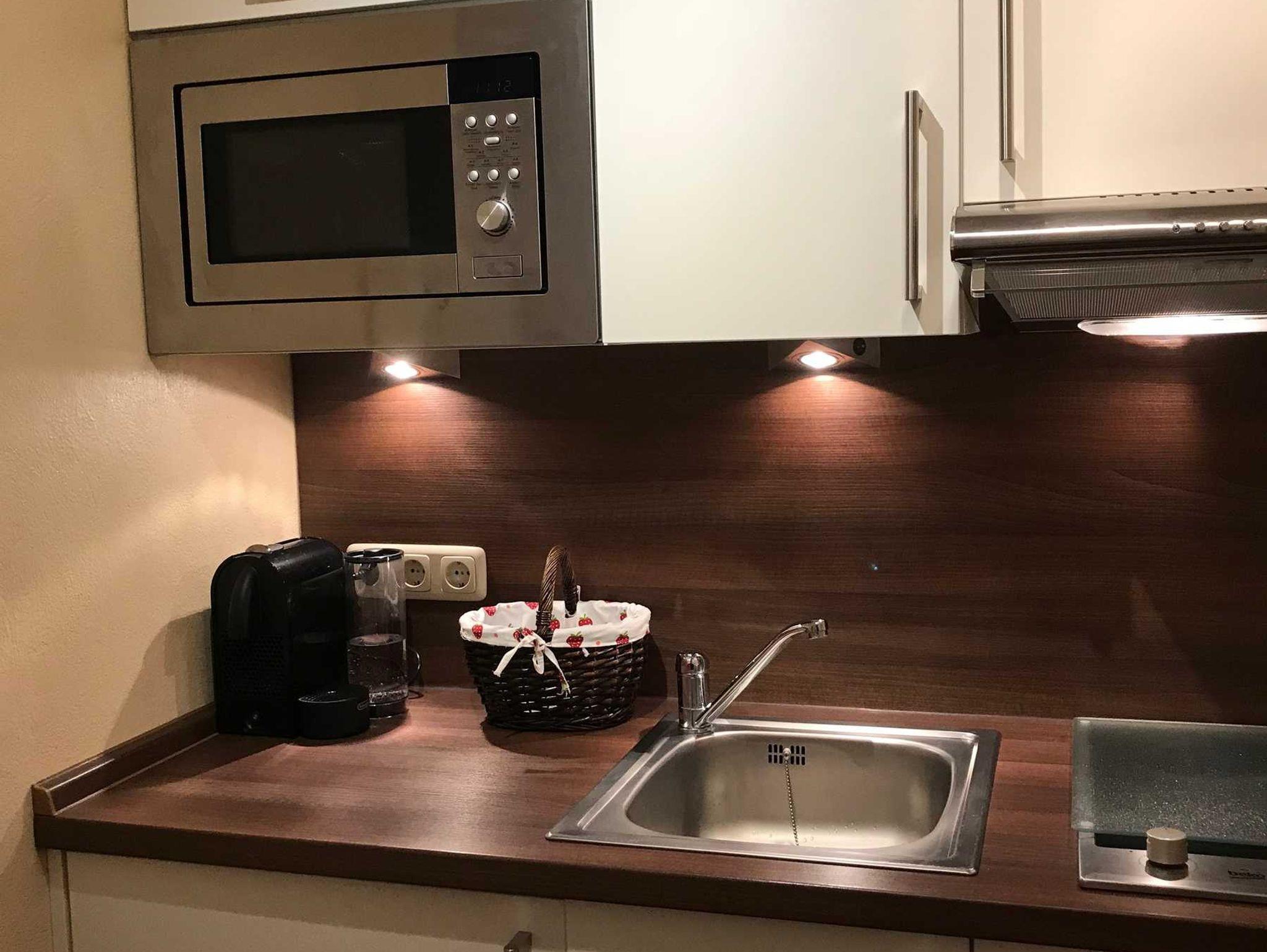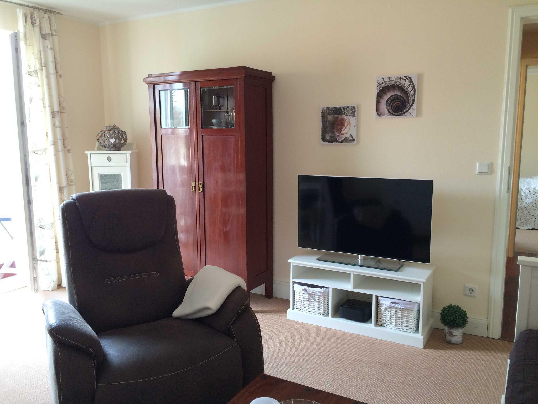Im Wohnzimmer finden sie ein Tagesbett (als Einzel- oder Doppelbett) einen Fernsehsessel, eine Essecke und ein TV mit Internet. Das Schlafzimmer mit Doppelbett, Sitzecke und TV bietet viel Platz. In der Küche finden Sie einen Geschirrspüler, ein 2er Kochfeld, eine Mikrowelle, eine Kaffeemaschine, Gewürze und einiges mehr. Den langen, schmalen Balkon können Sie vom Wohnzimmer und vom Schlafzimmer betreten.