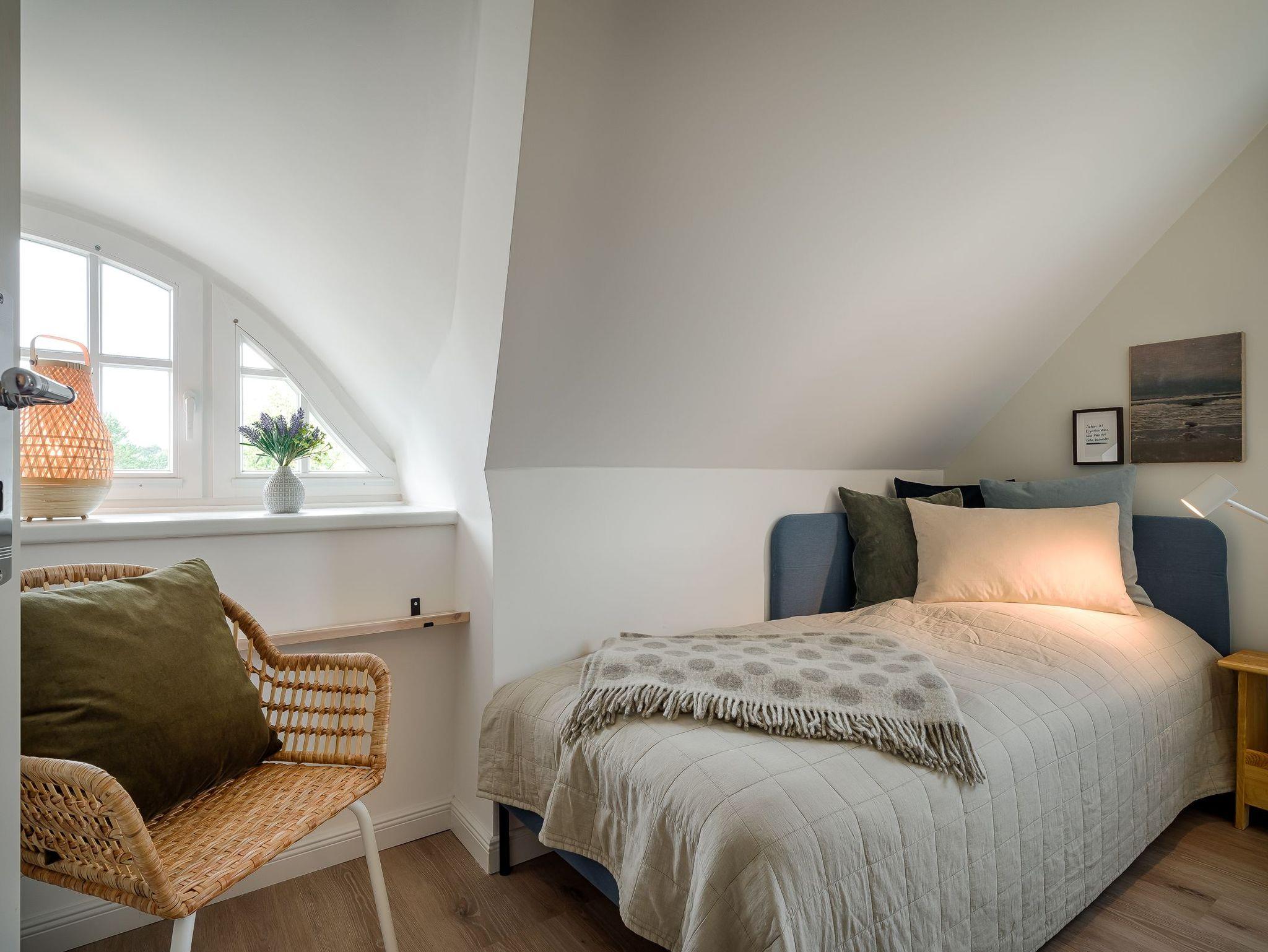 1 Schlafzimmer mit 1 Einzelbett (0,90x2,00m), Schrank, Korbsessel