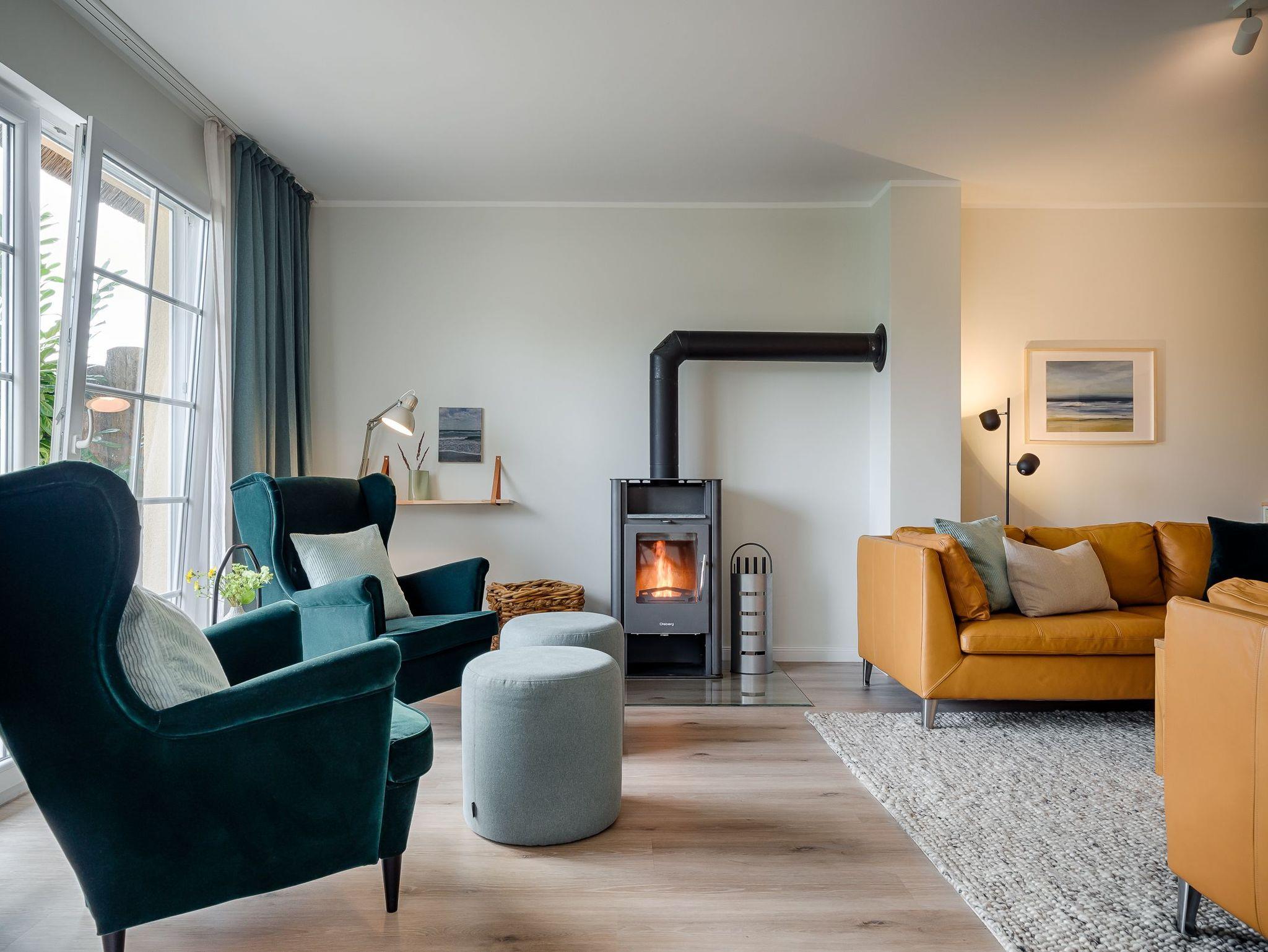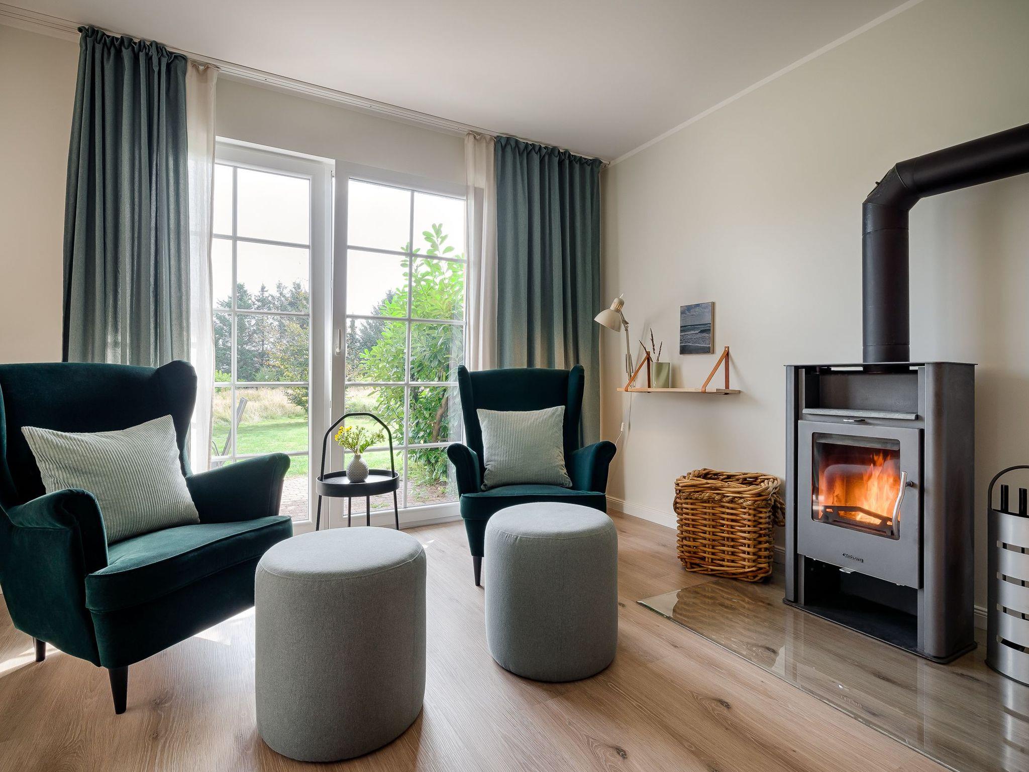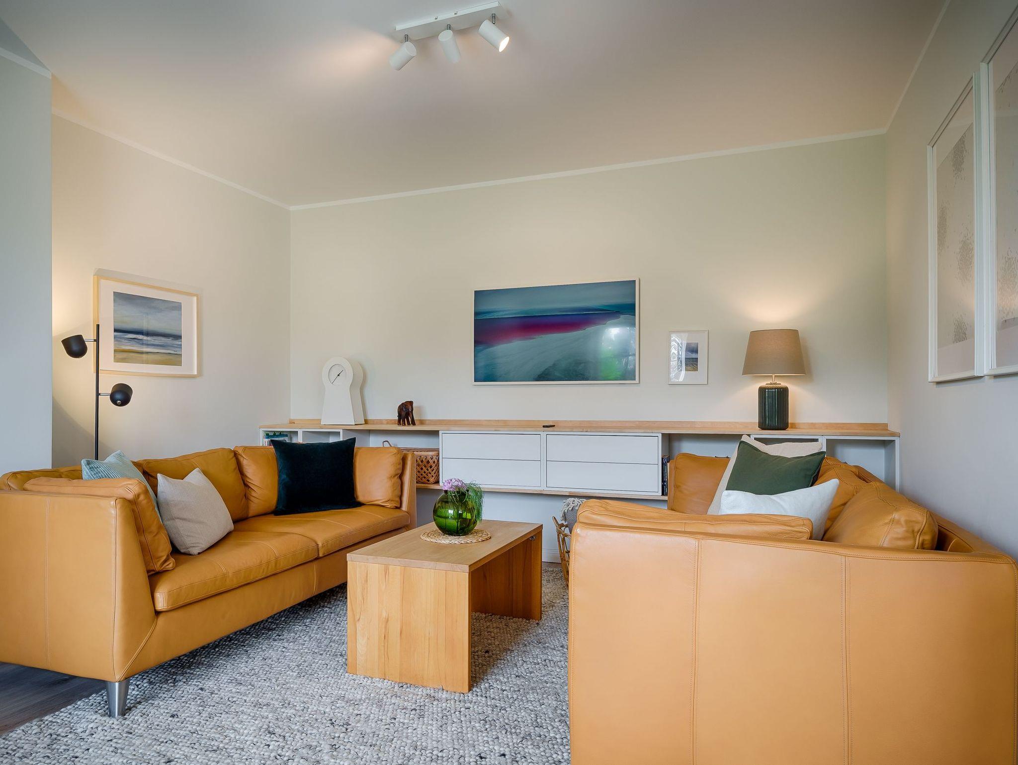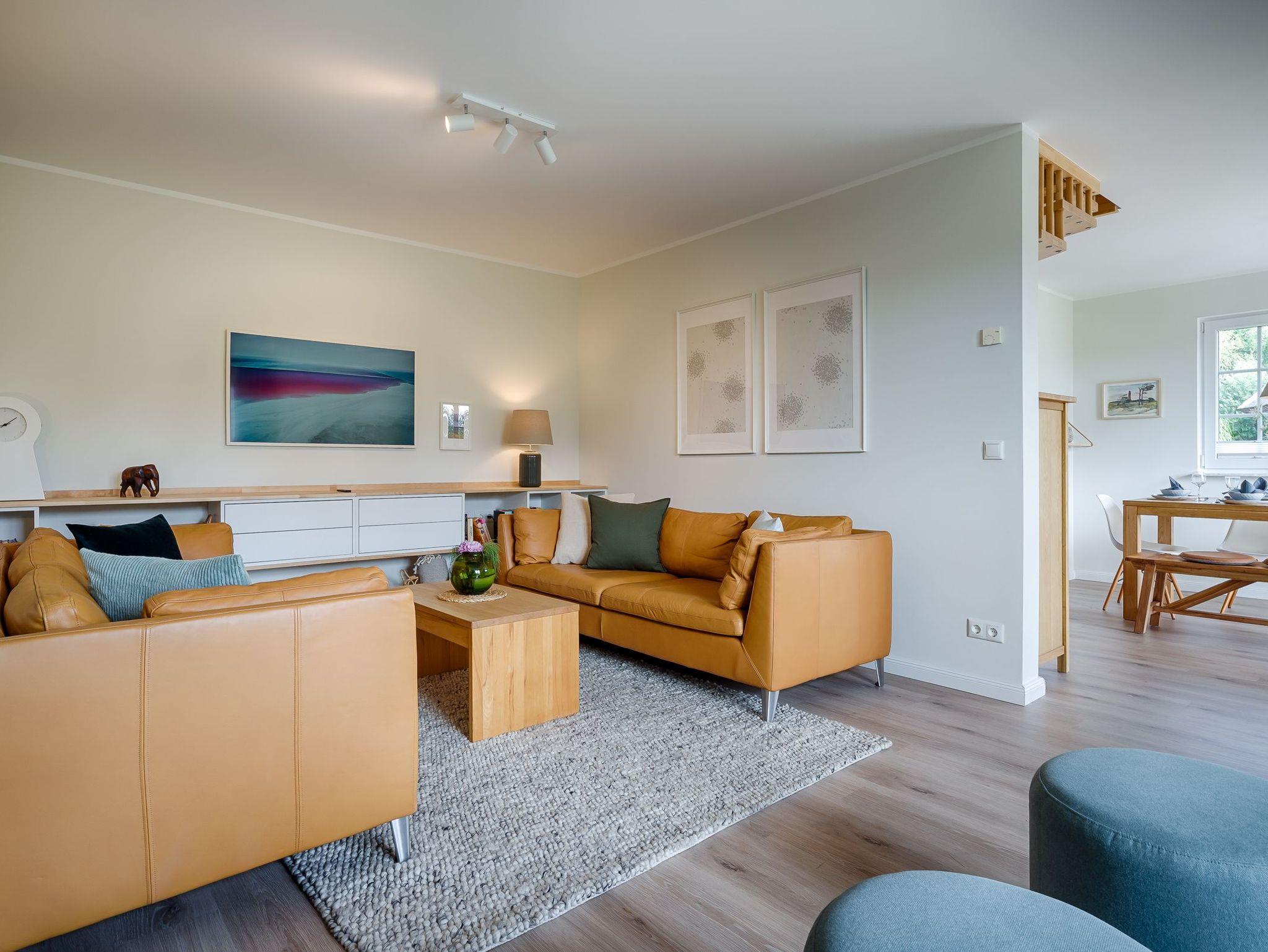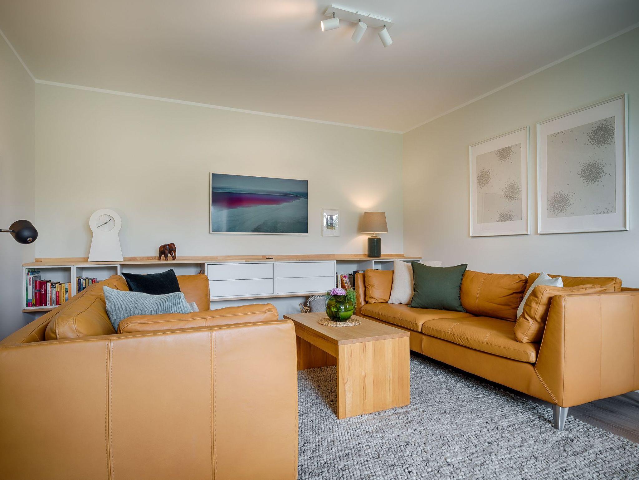 Wohnraum mit 2 Ledersofa, Leseecke mit 2 Ohrensesseln, Schreibtisch mit Lampe (USB-C Anschluss und direkte Handylademöglichkeit), Samsung The Frame TV, Bluetooth-Box, Kaminofen, Esstisch für 8 Personen