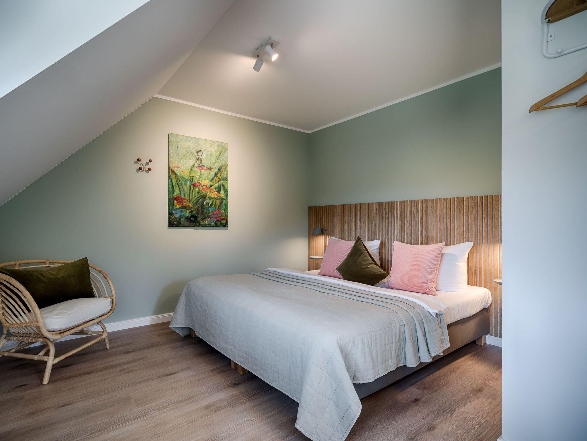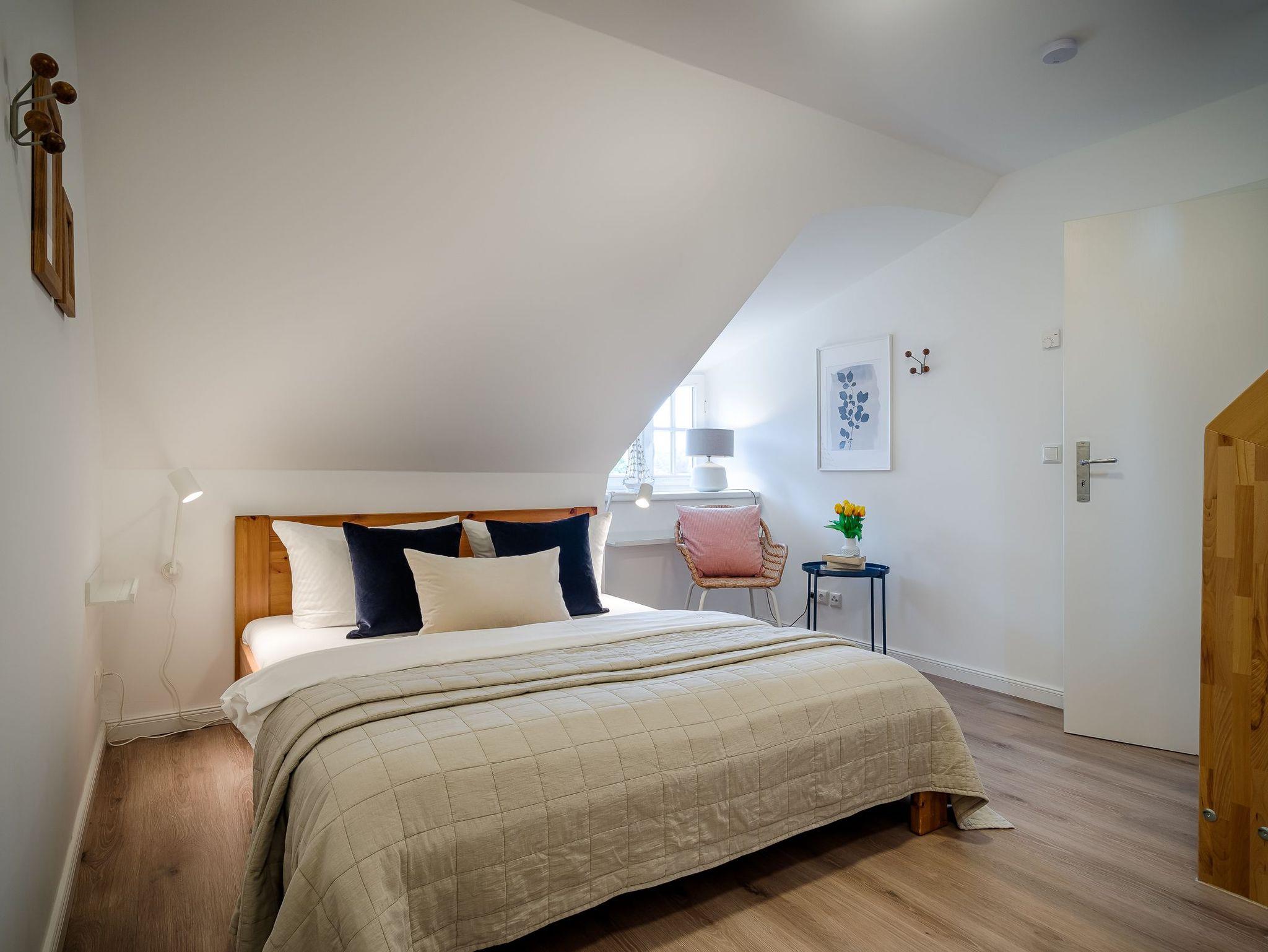 1 Schlafzimmer mit 1 Doppelbett (1,80x2,00m), Schrank, Kommode, Samsung The Frame TV, Durchgang zum Dachgeschoss mit offener Galerie