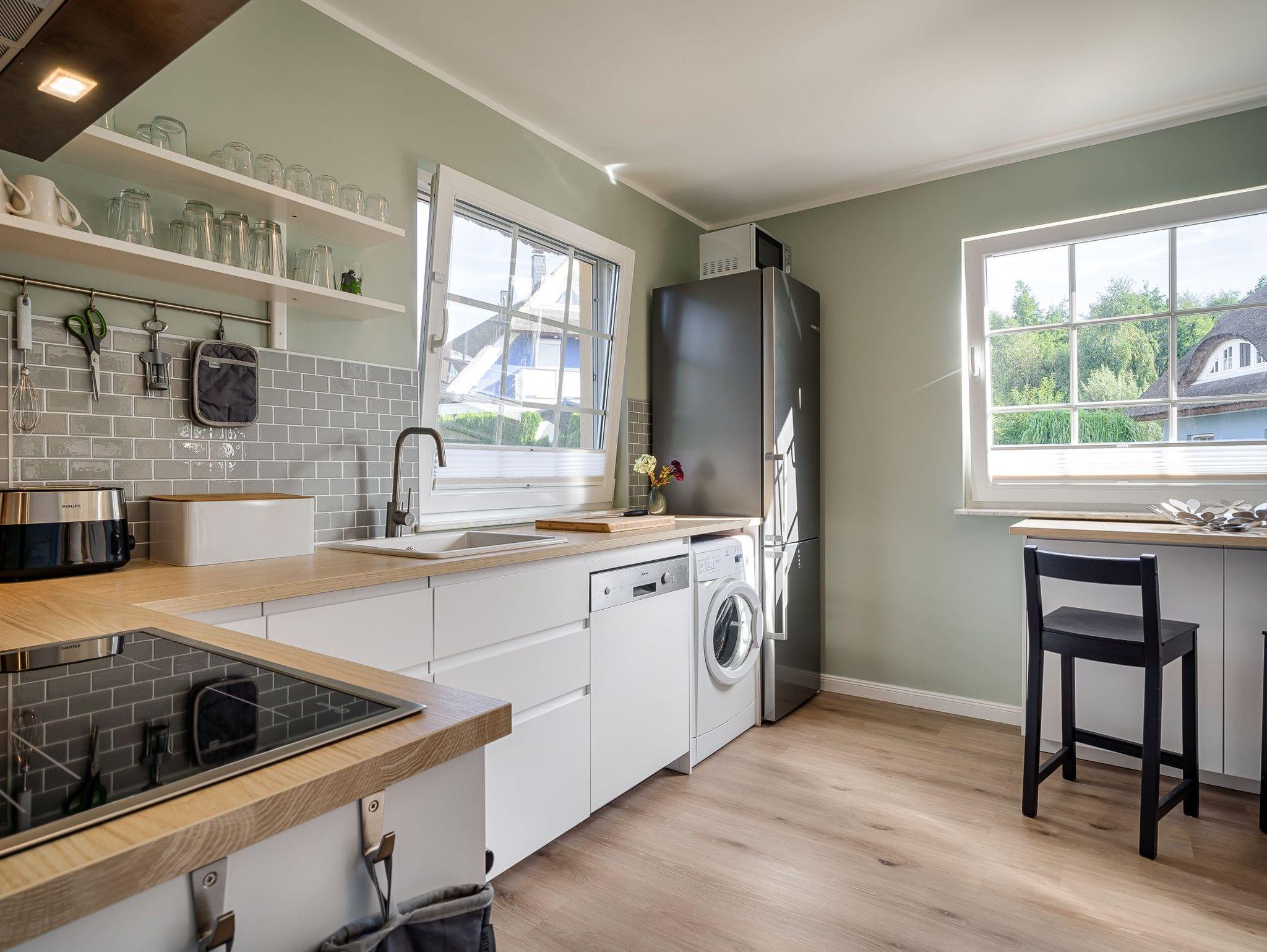 Einbauküche mit Herd/Induktionsfeld und Backofen, Mikrowelle, Spülmaschine, Kühl- und Gefrierkombination (separates Fresh- und Dairy- Fach), Kaffeemaschine, Milchschäumer, Wasserkocher, Waschmaschine, Sitzgelegenheit mit 2 Barhockern