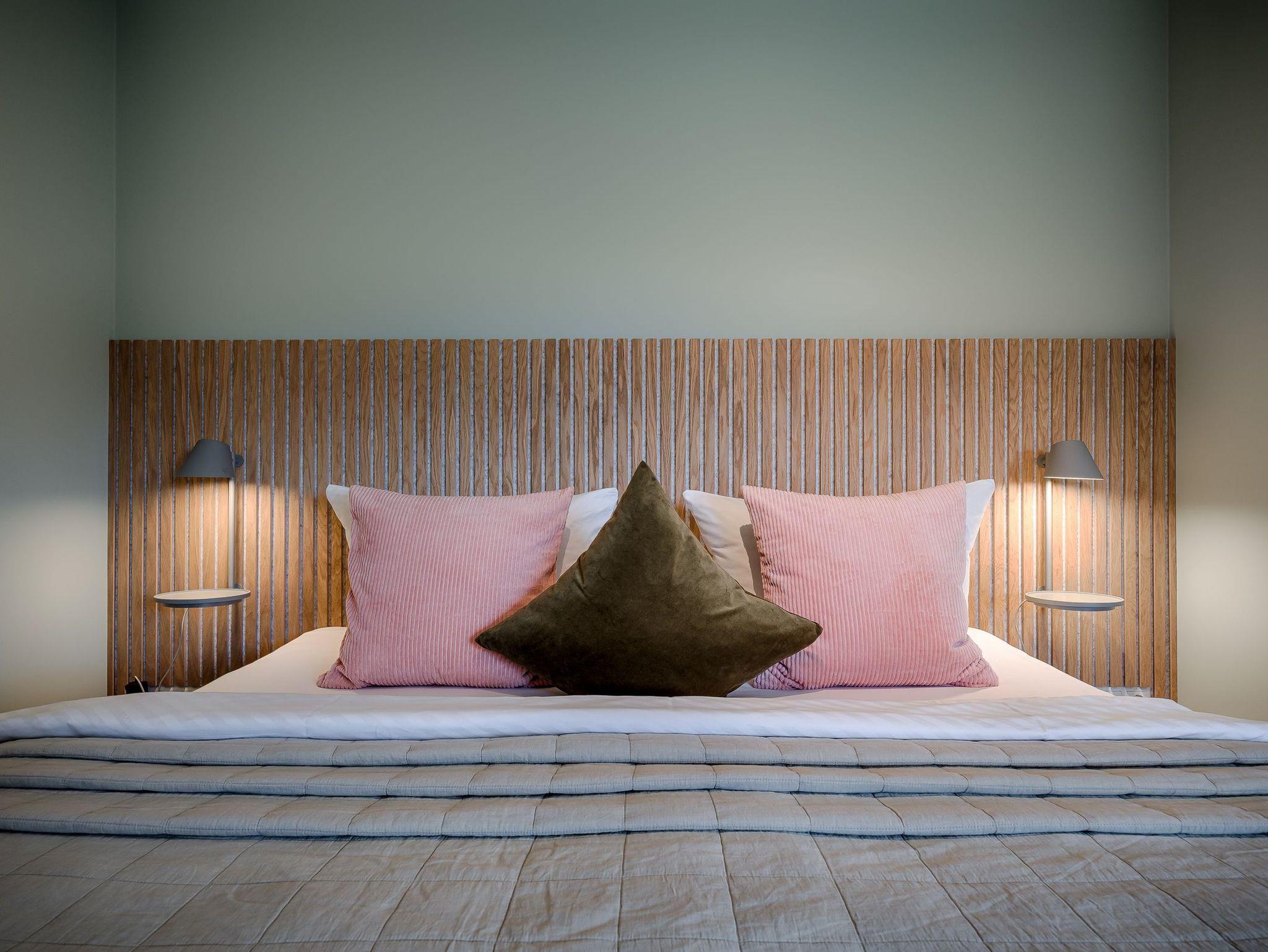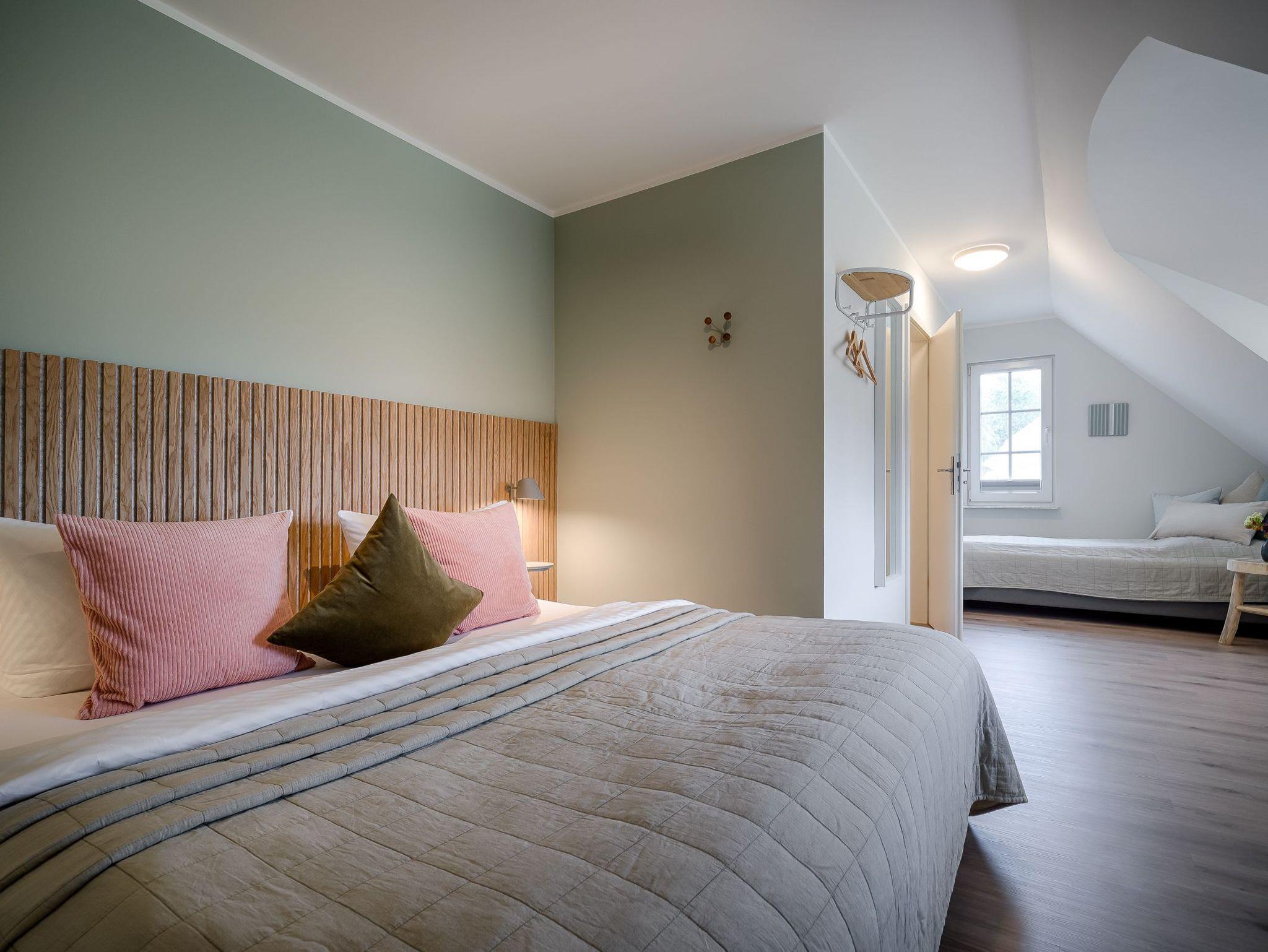 1 Schlafzimmer mit 1 Boxspringdoppelbett (1,80x2,00m, durchgehender Topper) und 1 Boxspringeinzelbett (0,90x2,00m), Kommode, Kleiderstange mit Bügeln
