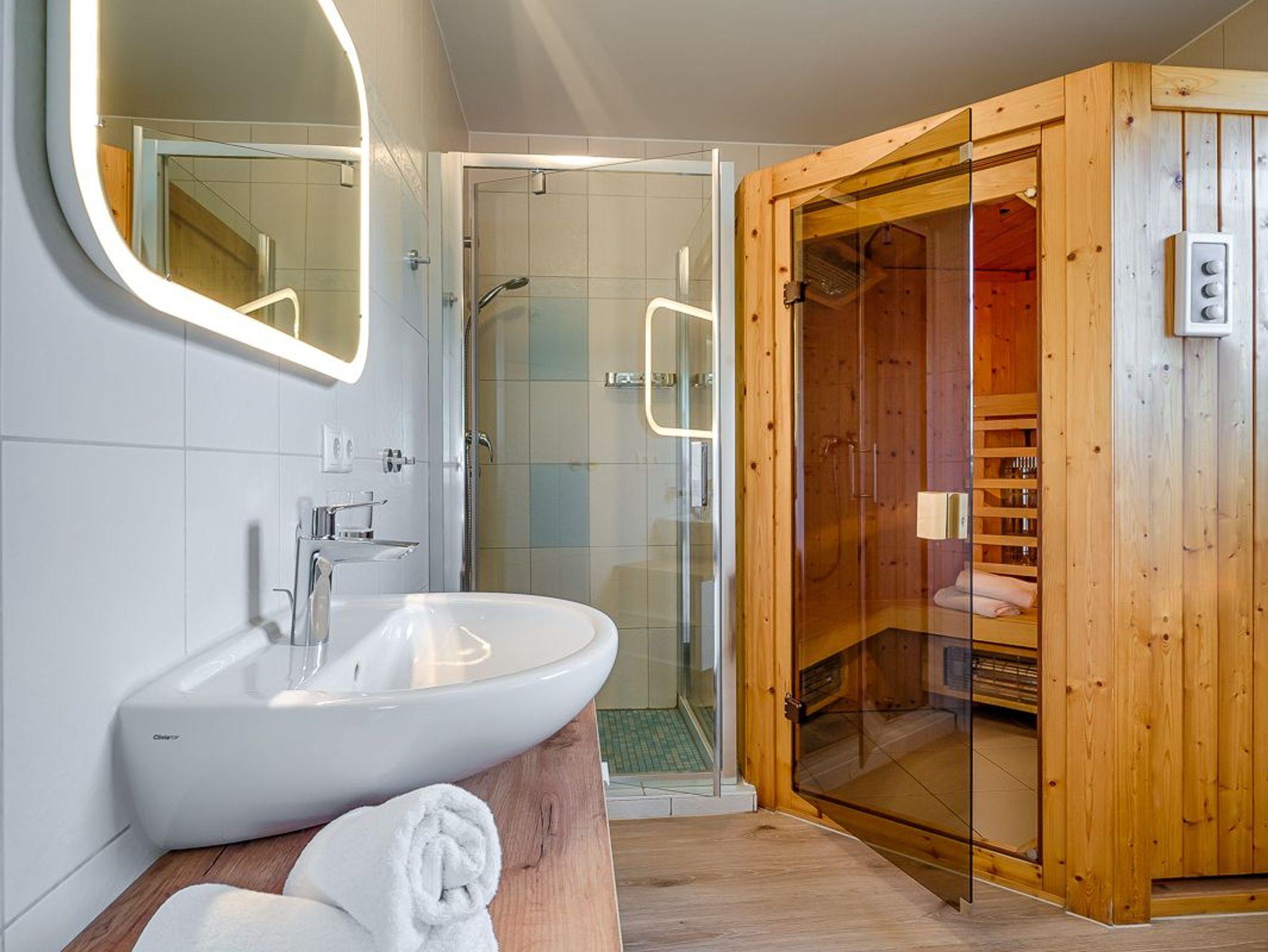 Bad mit Dusche, separatem WC, Fön, Infrarot-Wärmekabine (ohne Gebühren), Winneo Bio-Vinyl Boden in Dielenoptik, Fußbodenheizung