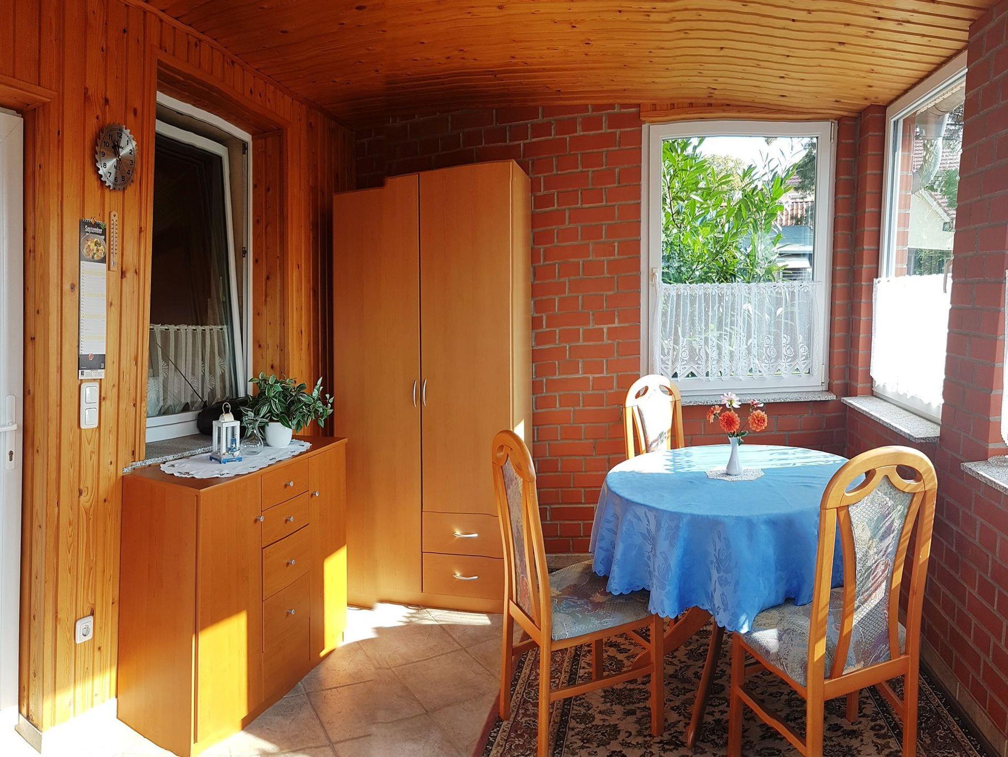 In der Veranda im Eingangsbereich ist eine Sitzecke, wo man gemütlich essen kann. Gemütlich eingerichteter Wohnraum mit SAT-TV. Die komplett ausgestattete Küchenzeile befindet sich ebenfalls im Wohnraum.