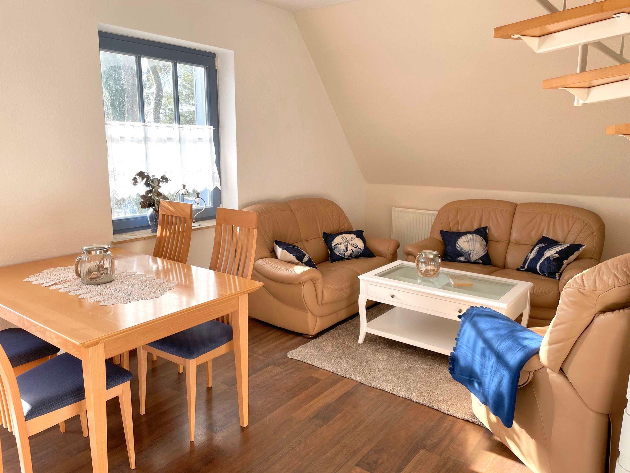 Die Ferienwohnung Seeigel erstreckt sich über 2 Etagen des Hauses. Das helle Wohnzimmer mit Küchenzeile, Eßtisch, der Sitzecke und TV befindet sich in der 1 Etage. Von hier aus gelangen Sie auf den Südbalkon. Die vollausgestattete Küchenzeile mit Herd und Geschirrspüler bietet alles was Sie zum Kochen im Urlaub benötigen.