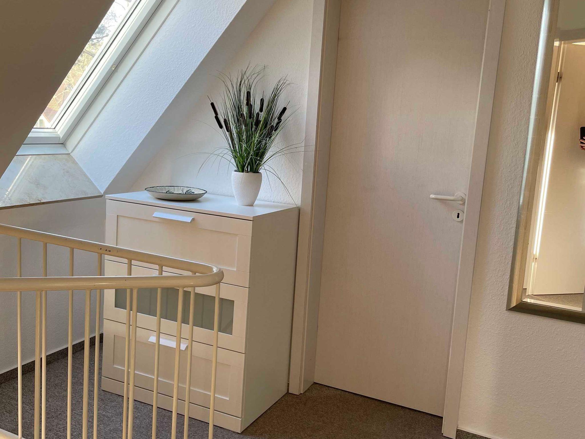 Das Schlafzimmer in der 1. Etage ist mit einem Doppelbett, Nachtischen und einem Kleiderschrank eingerichtet. Die Wohnung verfügt praktischer Weise über zwei Duschbäder, eins auf jeder Etage. In die 2. Etage gelangen Sie über eine offene Treppe. Dort befindet sich neben dem Duschbad ein Schlafzimmer mit Doppelbett und TV auch ein Schlafzimmer mit einem Einzelbett.