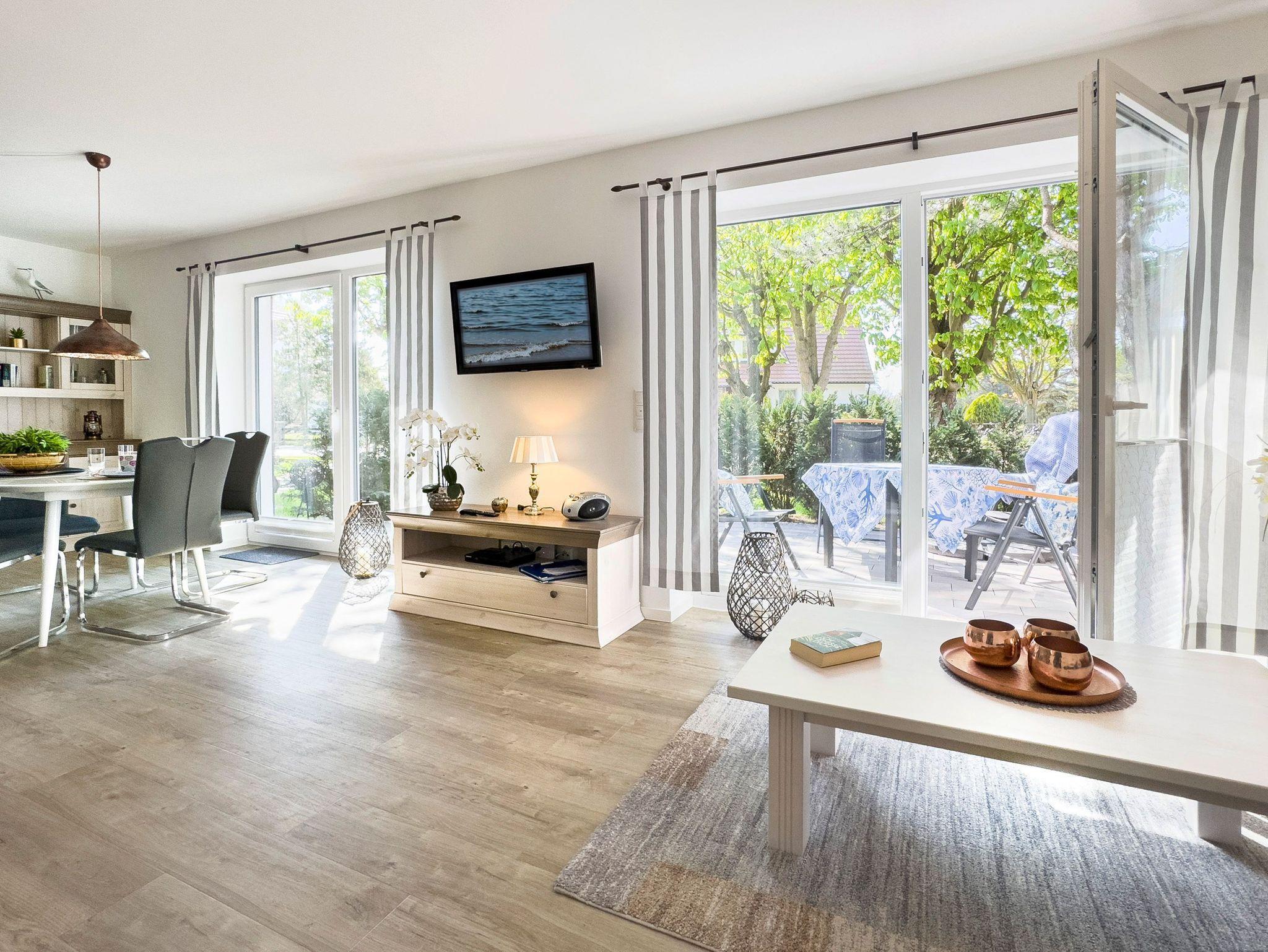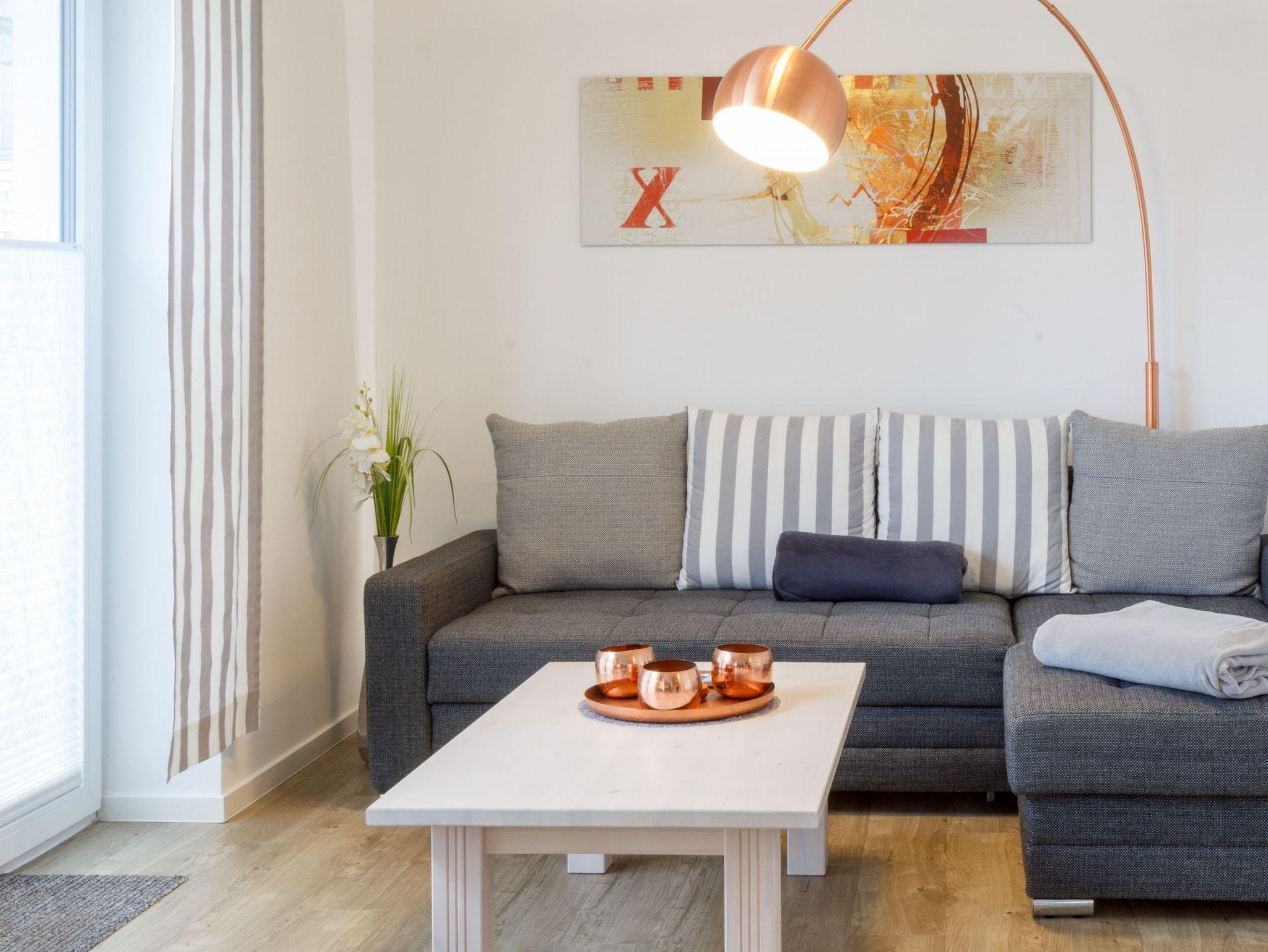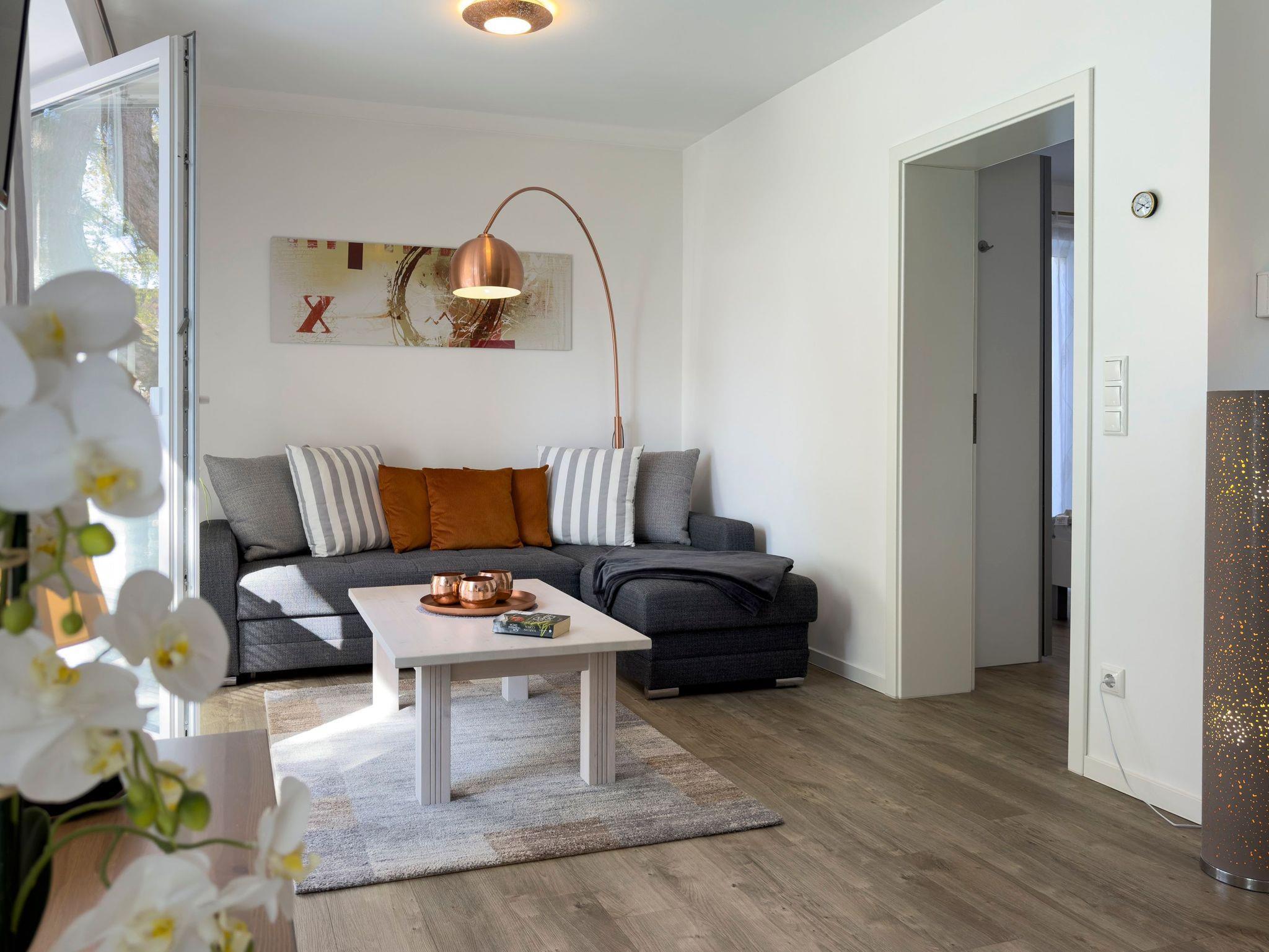 • Wohnbereich: Heller Wohnraum mit bequemer Couch, Flachbild-TV und einladender Atmosphäre