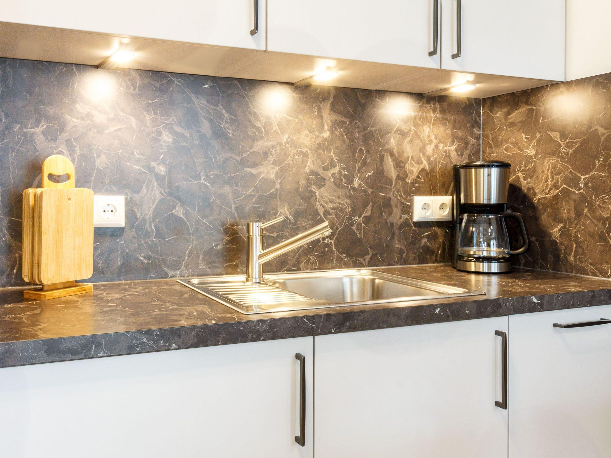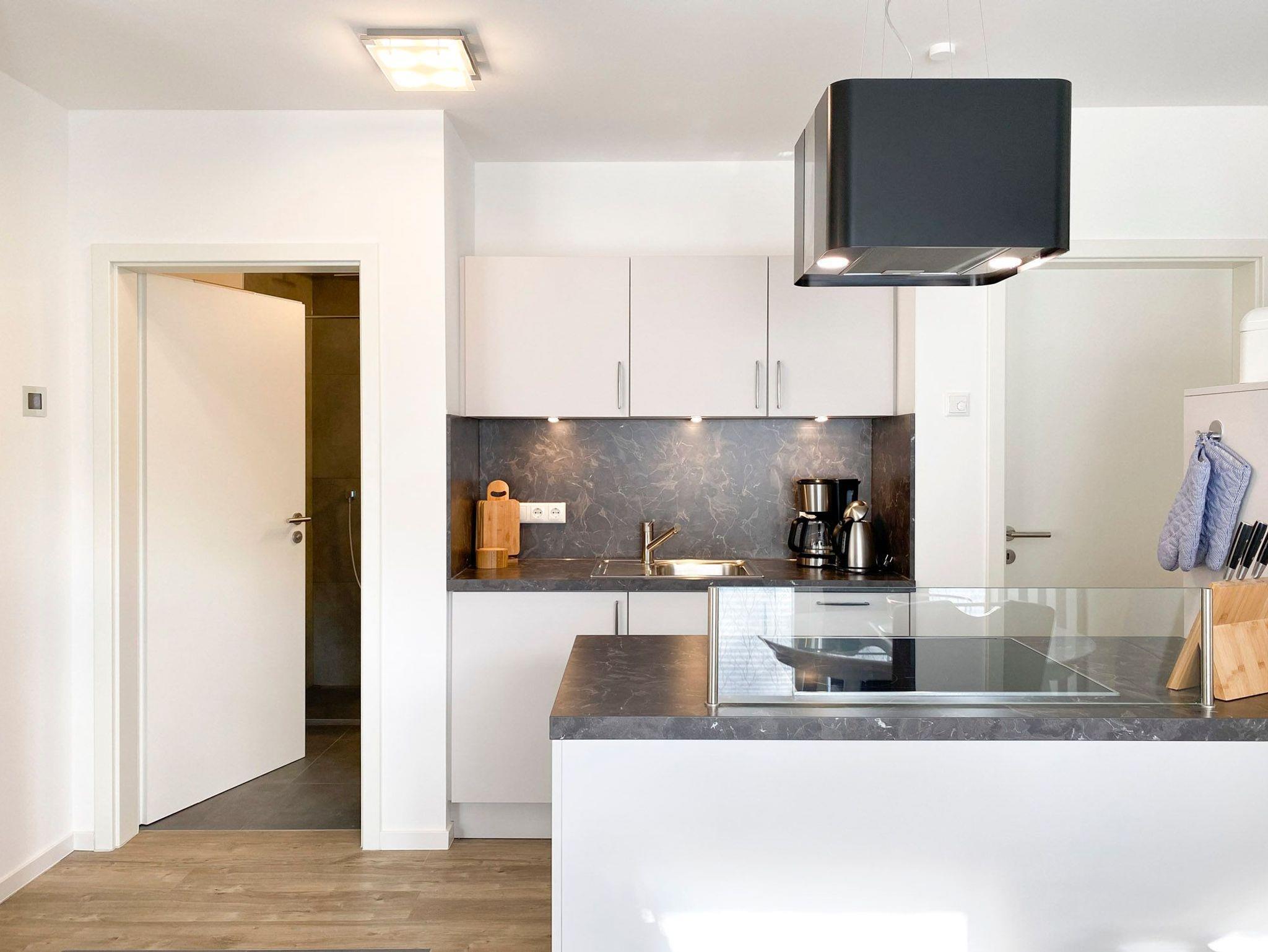 • Küche: Voll ausgestattete Küchenzeile mit Backofen, Mikrowelle, Spülmaschine, Kühlschrank, Filterkaffeemaschine, Toaster und Wasserkocher