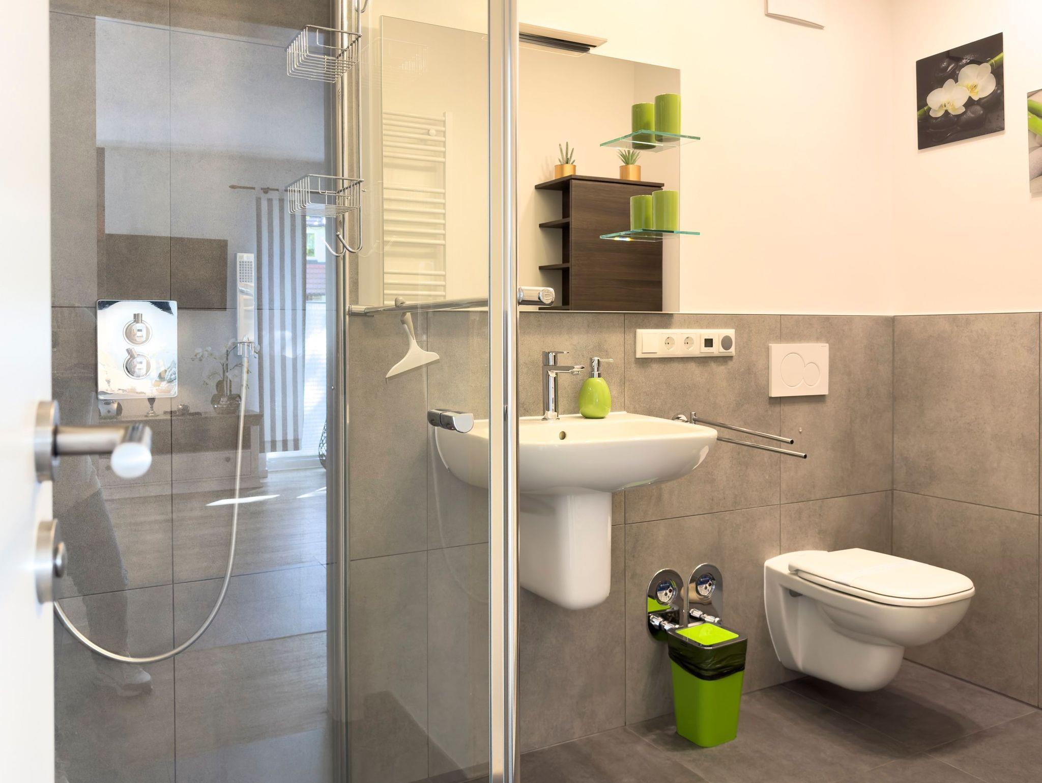 • Badezimmer: Modernes Bad mit ebenerdiger Dusche, Fußbodenheizung und Haartrockner