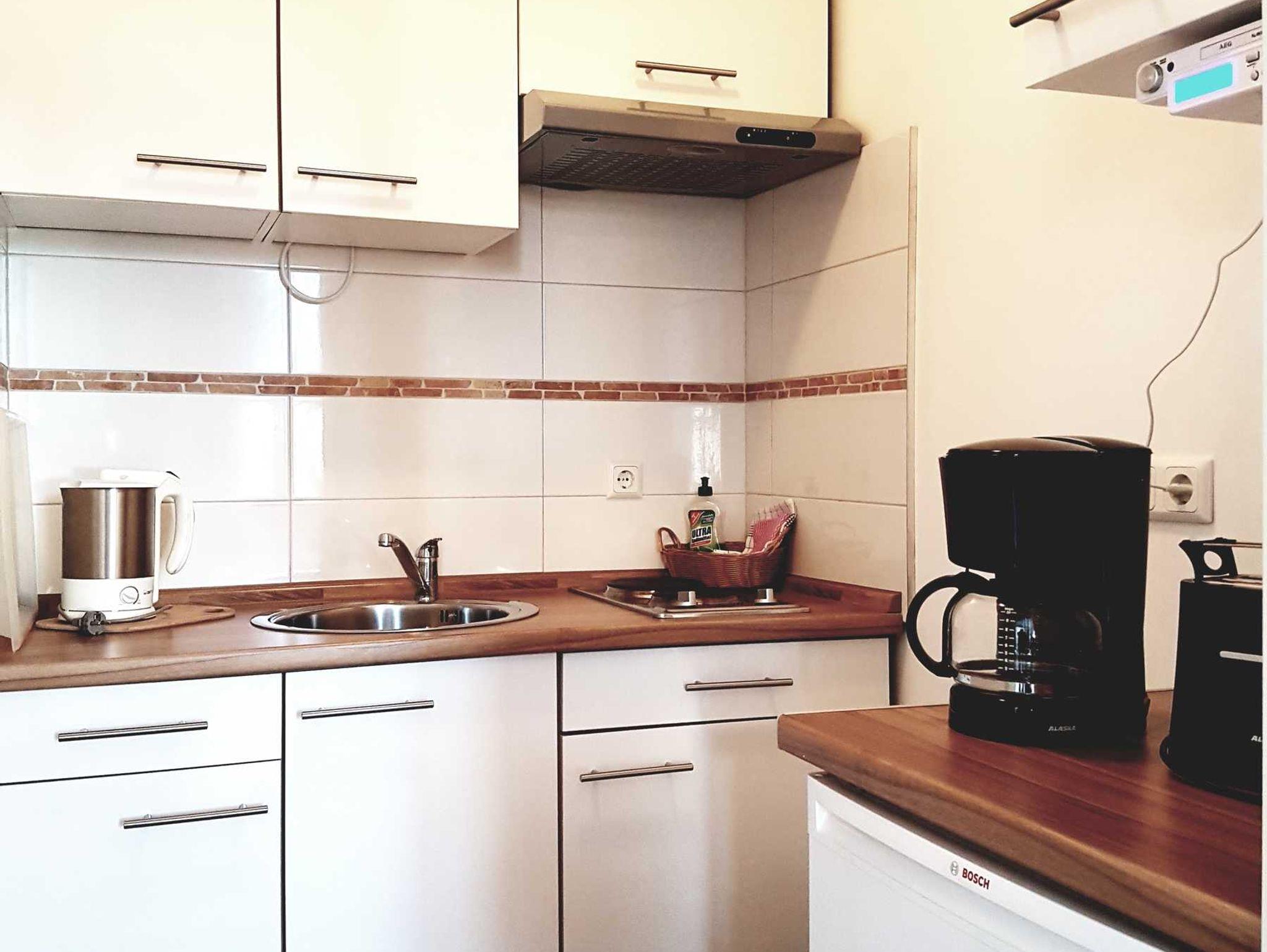In einer Nische im Zimmer befindet sich die kleinen Küche mit einem 2 Platten Kochfeld, Kühlschrank, Kaffeemaschine, Wasserkocher, Toaster und Kochutensilien.