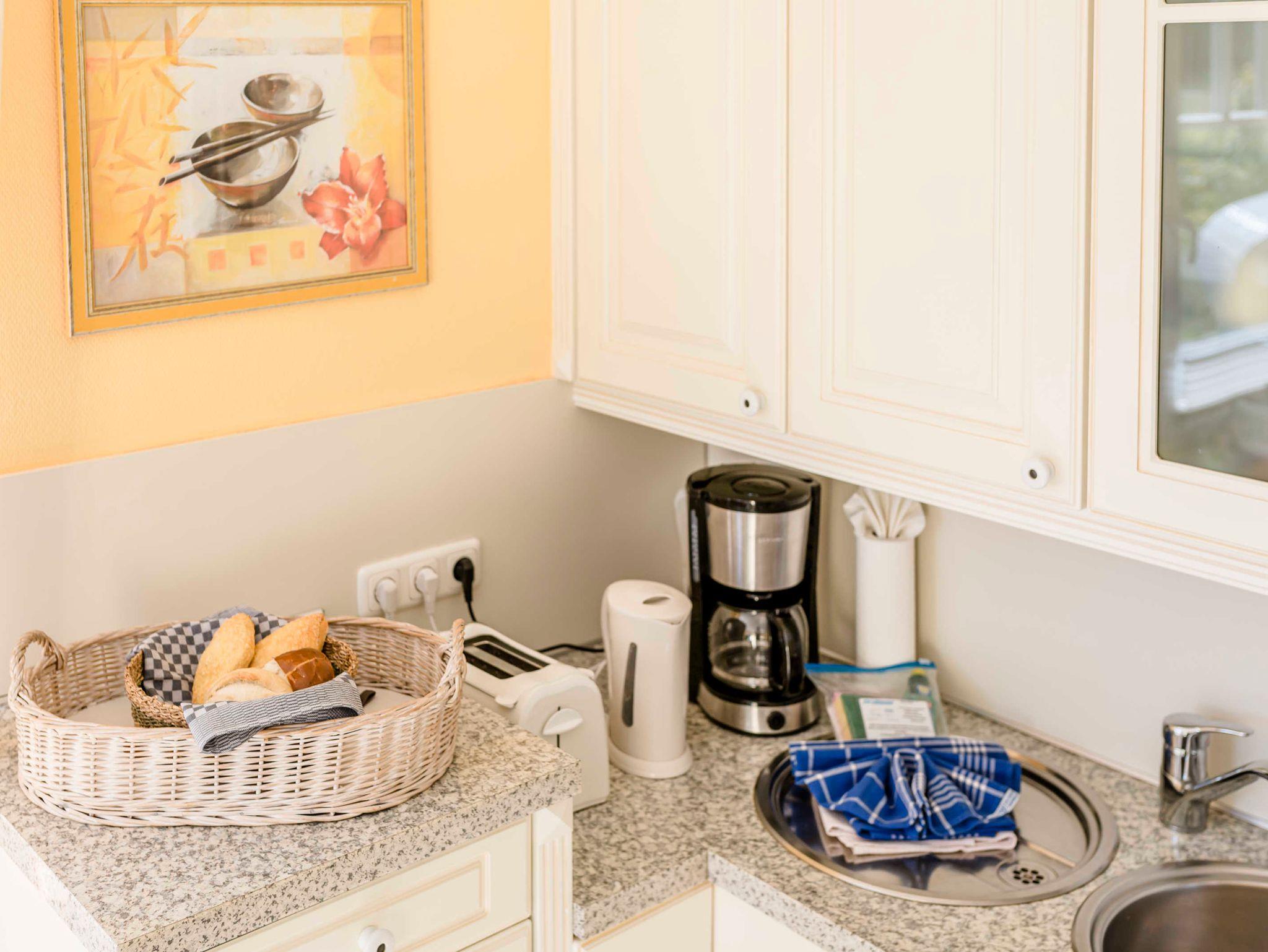 komplett eingerichtete Küche mit Herd, Geschirrspüler und Mikrowelle, Toaster und Kaffeemaschine