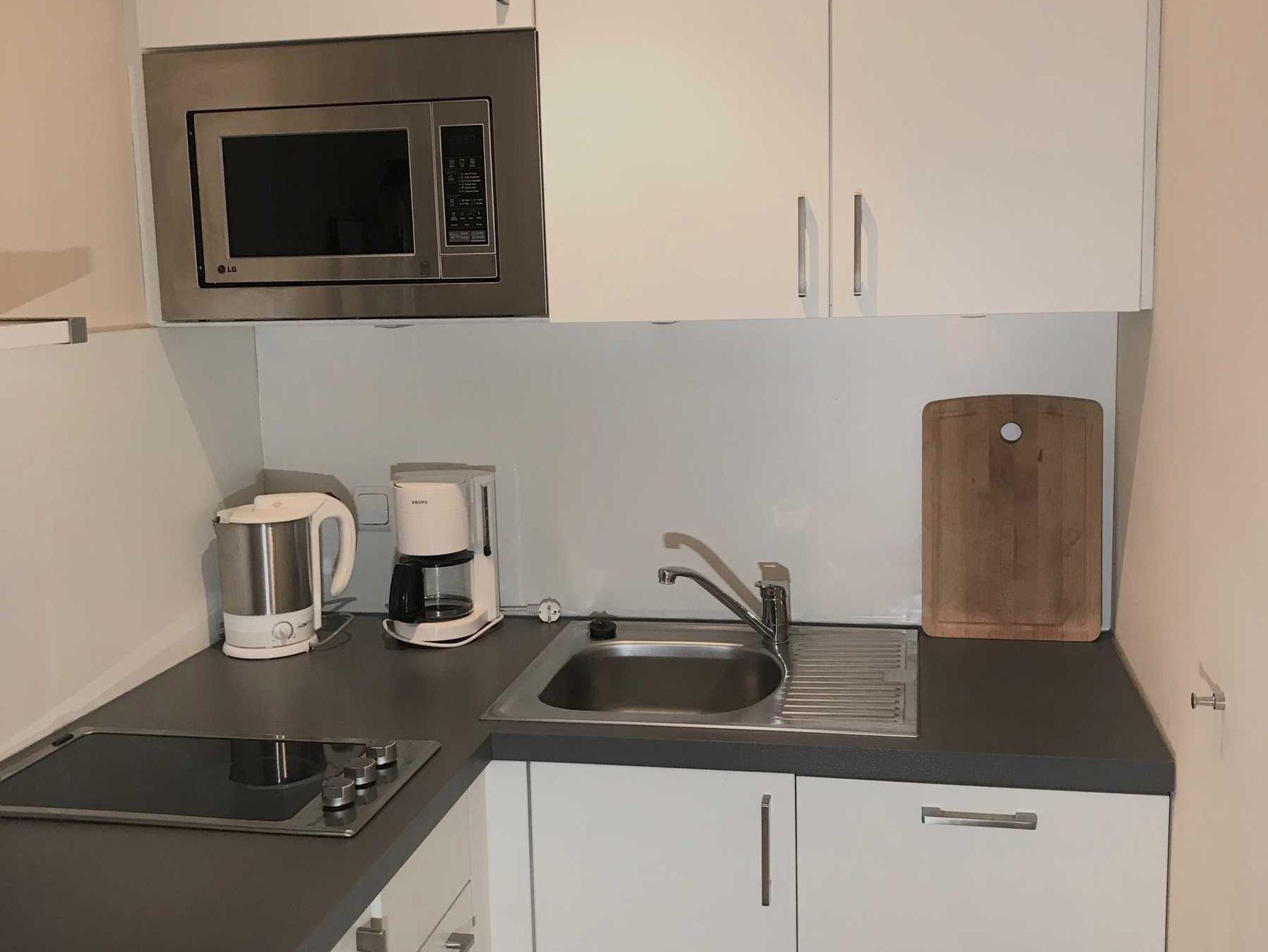 Im Schlafzimmer finden Sie ein Doppelbett (160x200), Nachtische und einen Kleiderschrank. Gleich daneben befindet sich das helle Bad mit bodentiefer Dusche. Die kleine Küche verfügt über einen 2 Plattenherd, eine Mikrowelle, Geschirrspüler, Kaffeemaschine und Kochutensilien.