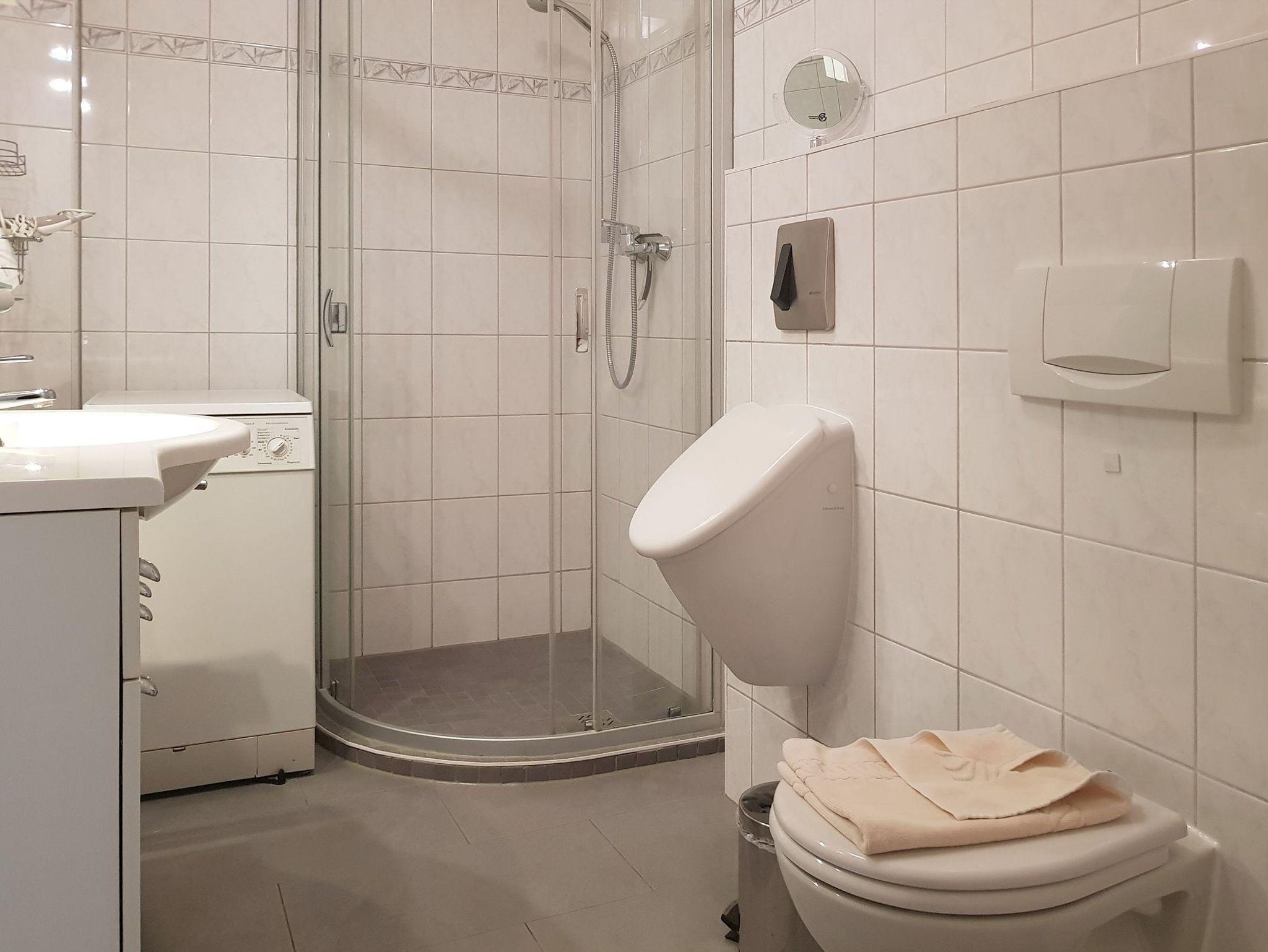 Das Bad ist mit Dusche, WC, Bidet und Waschmaschine ausgestattet. Ein PKW-Stellplatz und ein Fahrradschuppen sind vorhanden.