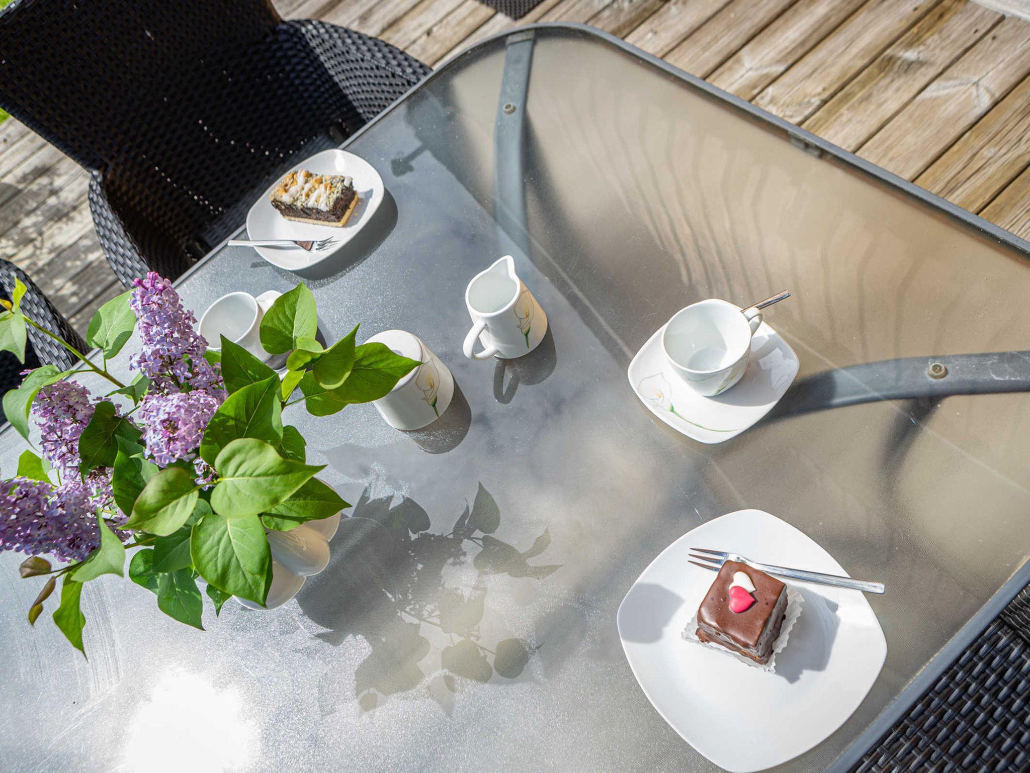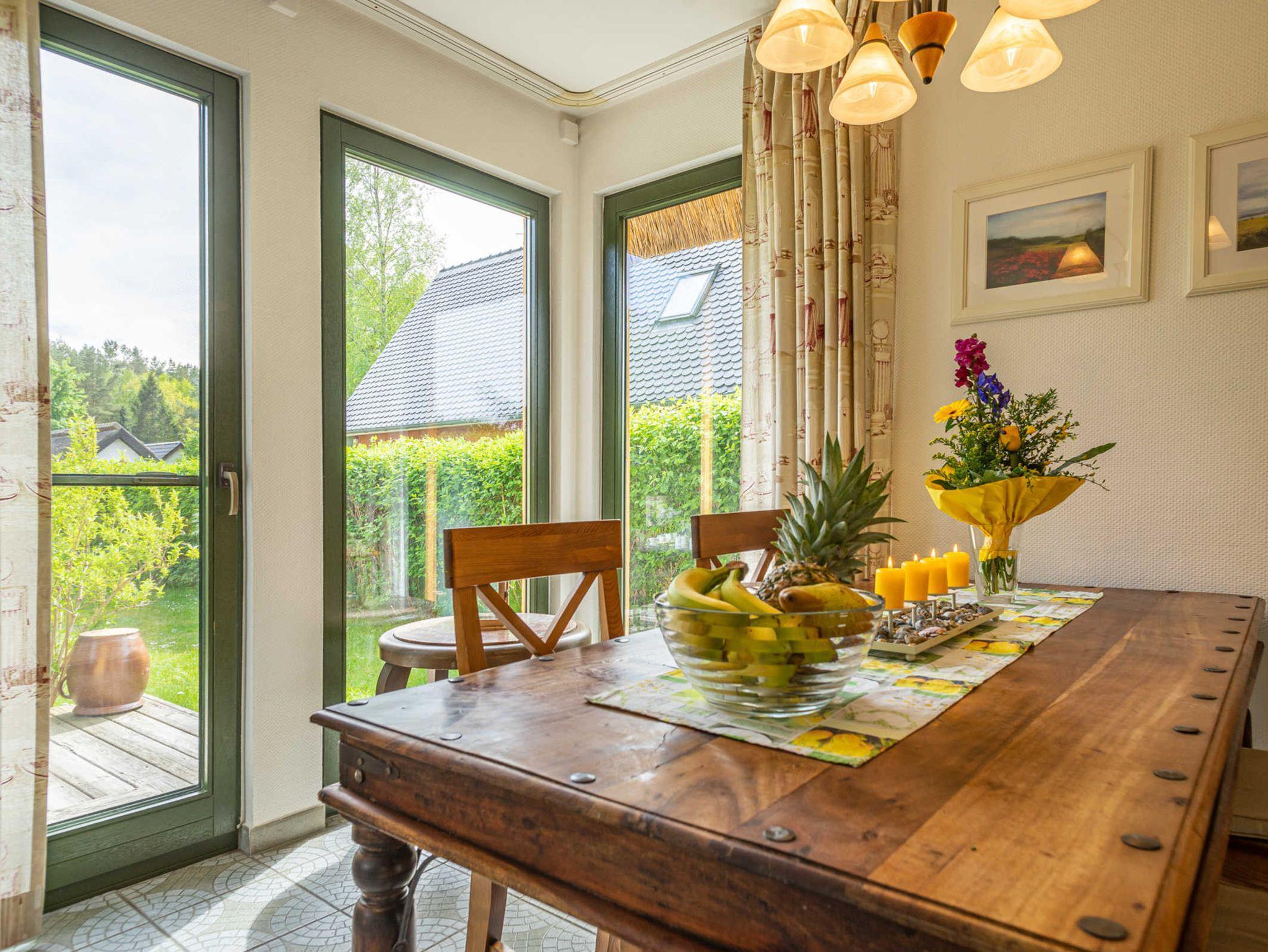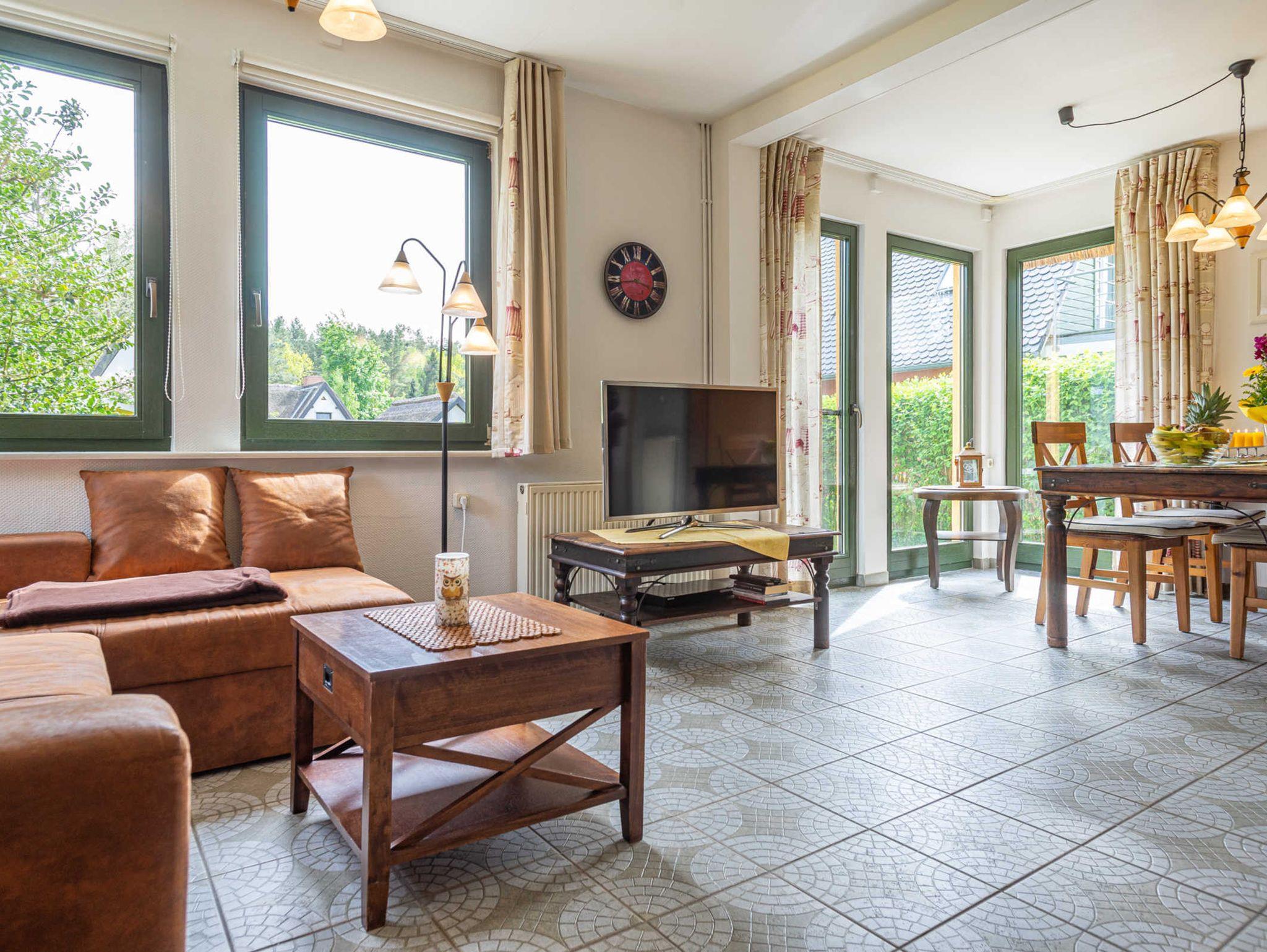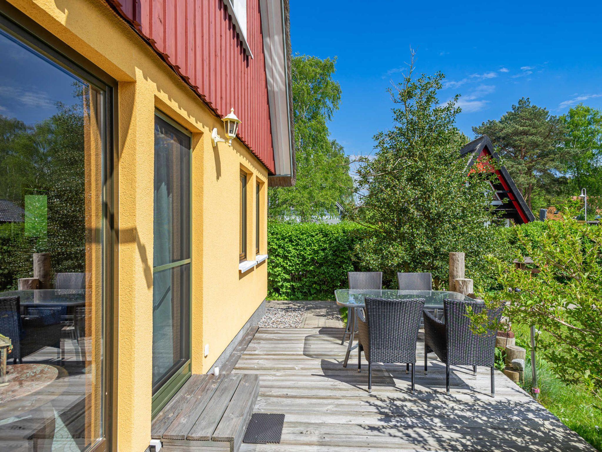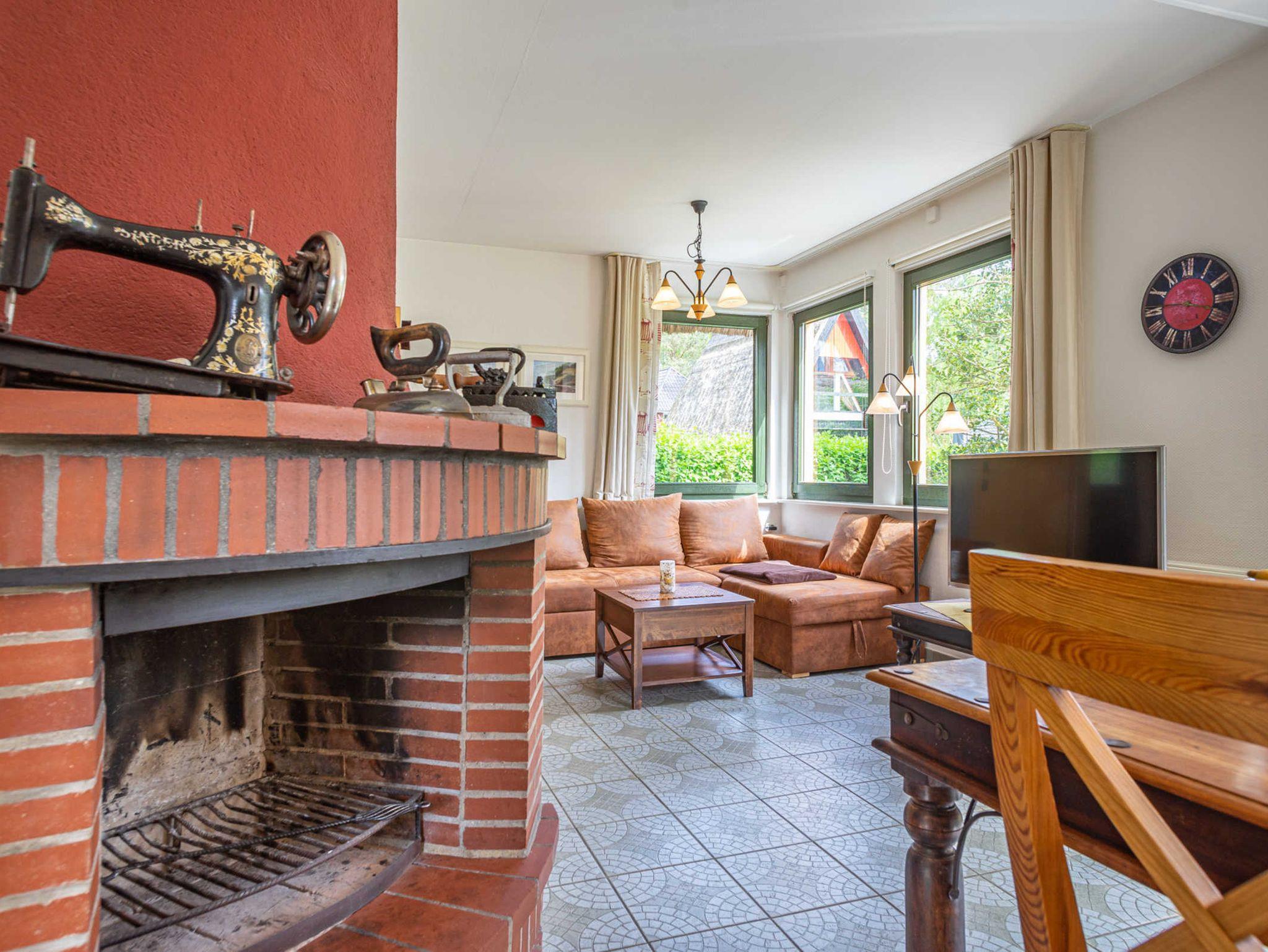 Das Haus hat ein großes Wohnzimmer mit Essecke und Sitzecke. Die großzügig eingearbeiteten Fenster lassen den ganzen Tag viel Licht einfallen. In der kälteren Jahreszeit sorgen Kamin und Sauna für wohlige Atmosphäre.