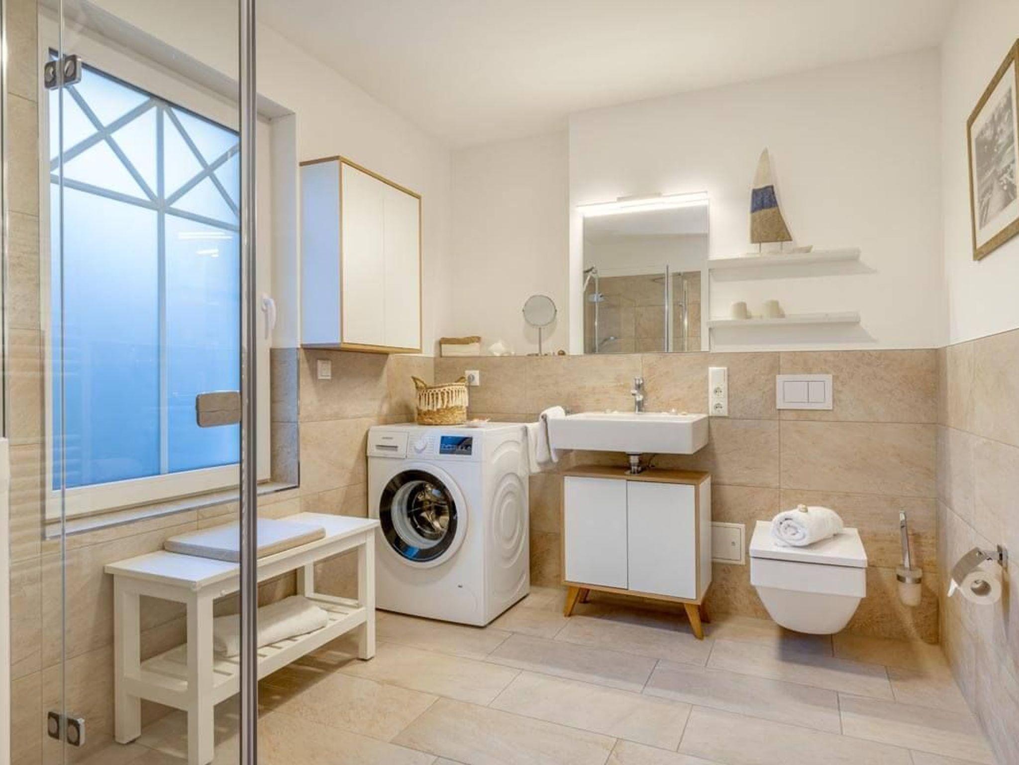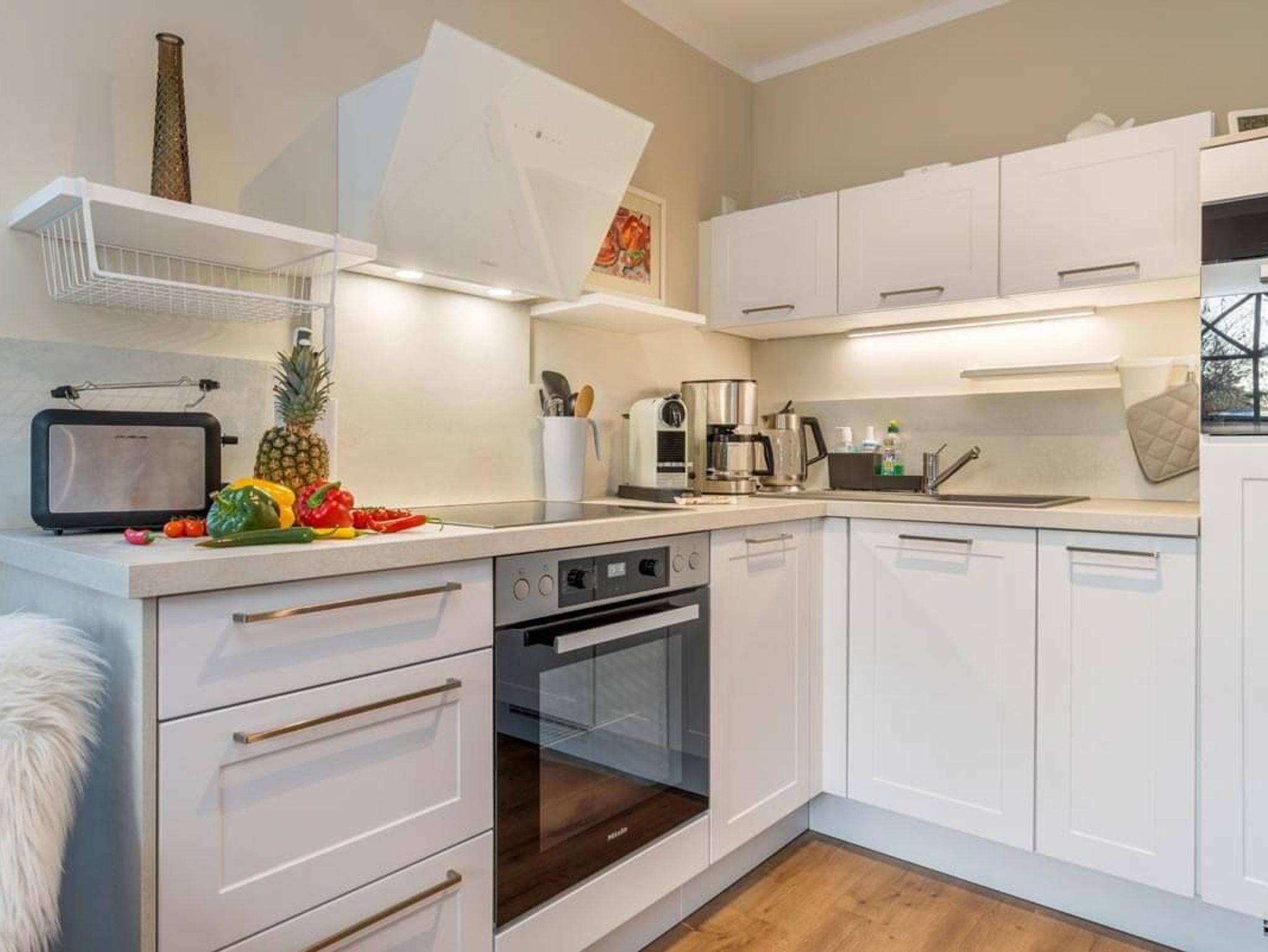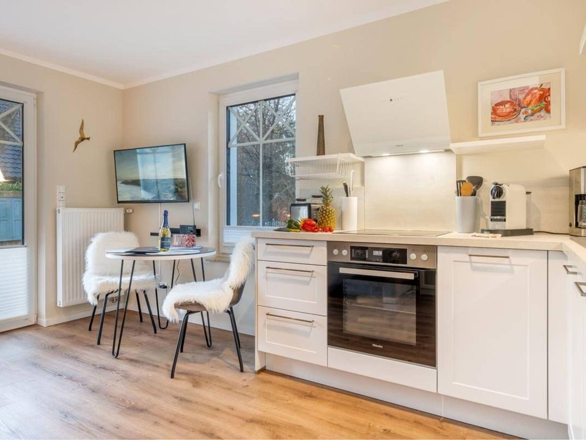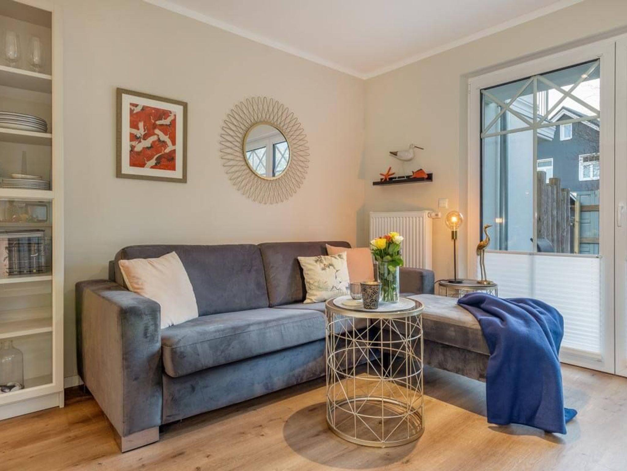 In dem gemütlichen Wohnzimmer befindet sich ein offener Küchenbereich. Die Küche ist mit allen wichtigen Geräten von Miele ausgestattet und bietet Platz zum Kochen und Essen. Das Schlafzimmer mit seinem Boxspringbett ist geräumig und lädt zum Schlafen und Entspannen ein. Das Badezimmer ist modern und verfügt über eine ebenerdige Dusche. Auf der wohnungseigenen Terrasse können Sie den Strandtag ausklingen lassen und die letzten Sonnenstrahlen genießen.