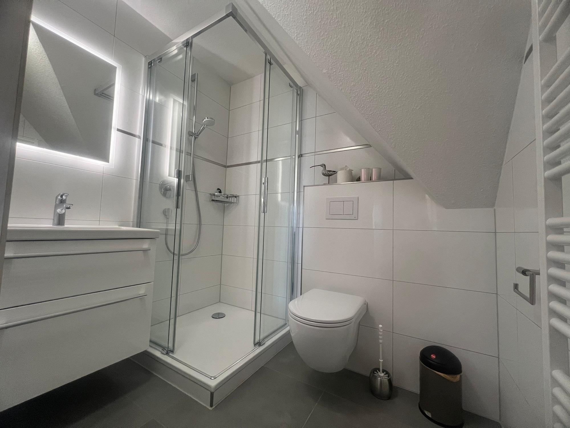 Das moderne Duschbad und der Balkon (Richtung Süden) gehören ebenfalls zur Ferienwohnung.