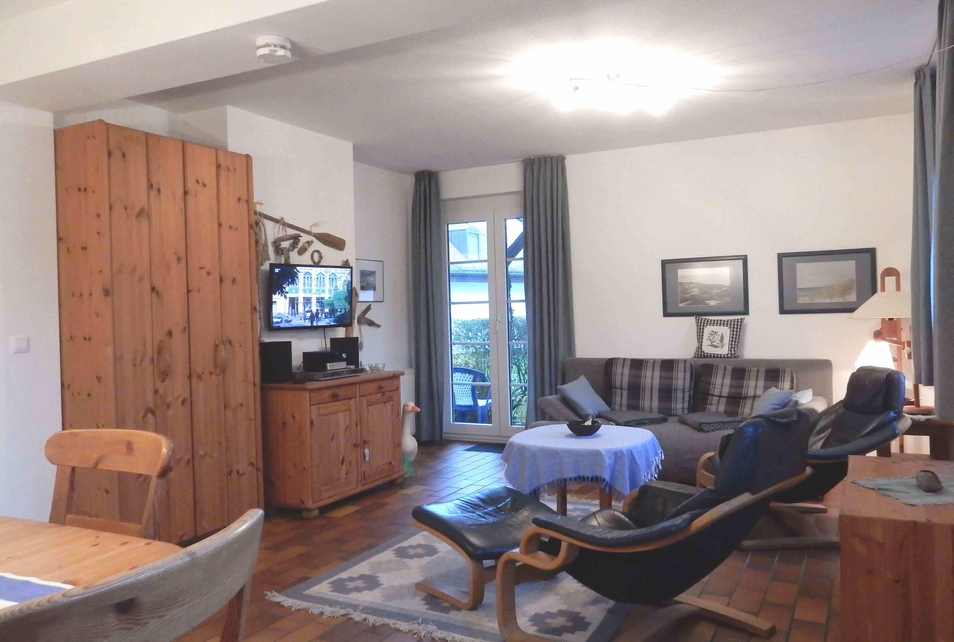2 Zimmer ca. 54 qm, EG im Haus H, Residenz Kormoran, Grüne Straße 45A-R, Ostseebad Prerow, für 1-4 Personen. Wohnzimmer mit Schlafcouch, WLAN, Sitzgarnitur, SAT-TV/Radio, Esstisch, Küchenzeile, Schlafzimmer, Dusche/WC, extra WC, Südwestterrasse