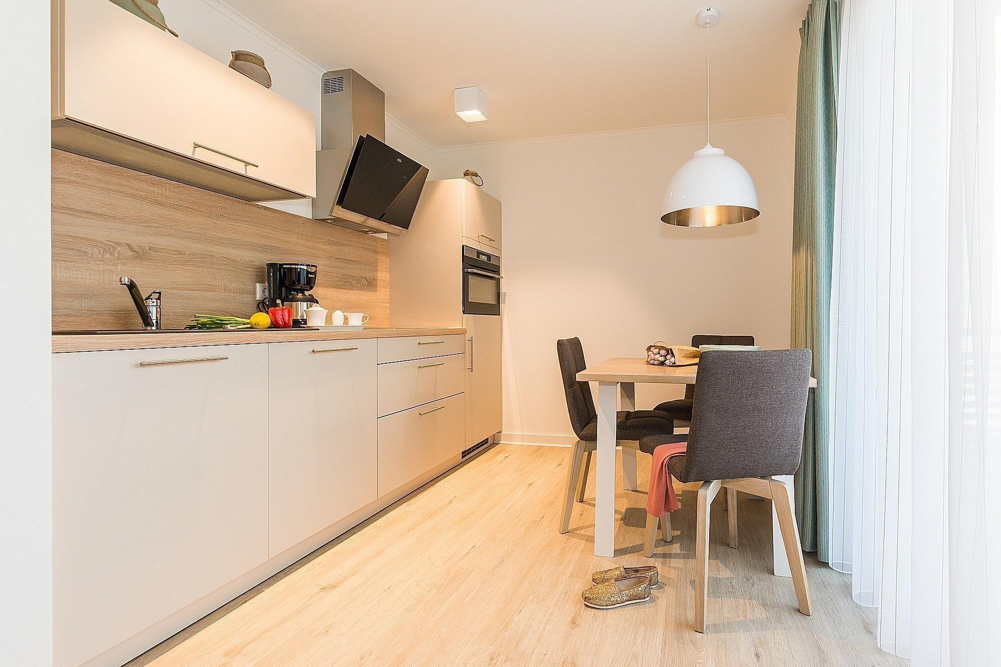 Die Ferienwohnung bietet eine harmonische Kombination aus modernem Komfort und ansprechendem Design. Sie verfügt über ein großzügiges Wohnschlafzimmer mit einem gemütlichen Doppelbett, ideal für erholsame Nächte. Die offene Küche ist voll ausgestattet und lässt keine Wünsche offen: Geschirrspüler, Elektro-/Gasherd, Backofen, Mikrowelle, Kühlschrank, Kaffeemaschine, Toaster sowie eine Gefriermöglichkeit stehen zur Verfügung. Komfortabel ausgestattet, bietet das Badezimmer eine bodengleiche Dusche, Haartrockner und Kosmetikspiegel.